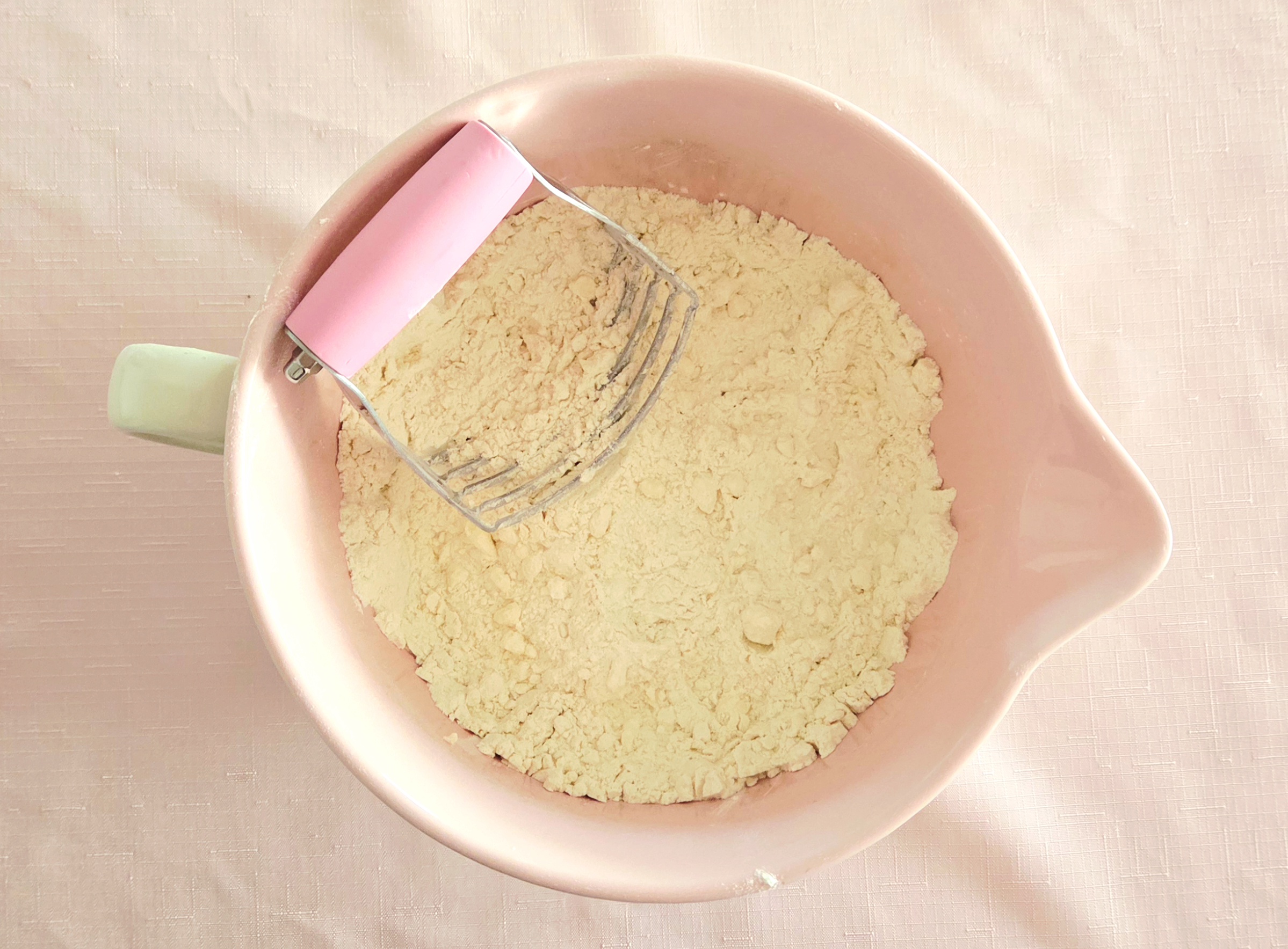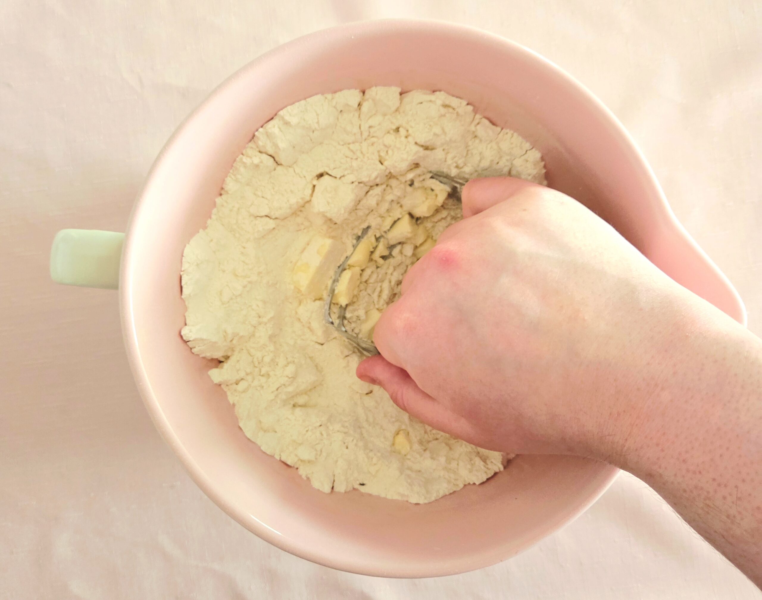 Dump the cubes of butter that were cut up and stuck in the fridge earlier into the dry goods. Scatter them around a bit, to make the job easier, and begin cutting them into the flour using a pastry blender. Press it straight down into the cold butter over and over again, until the pieces that haven’t blended in with the dry are no bigger than pea-sized.