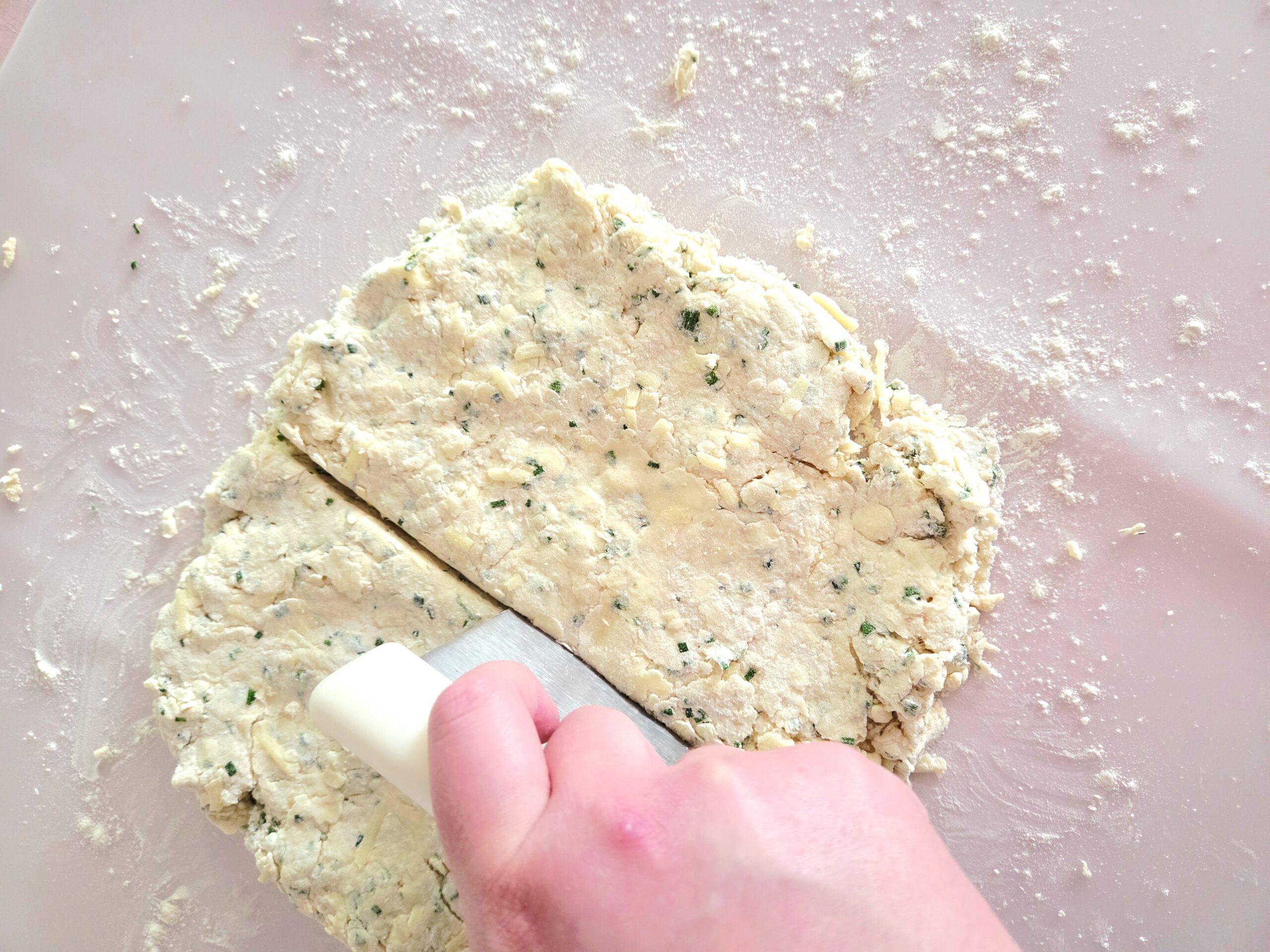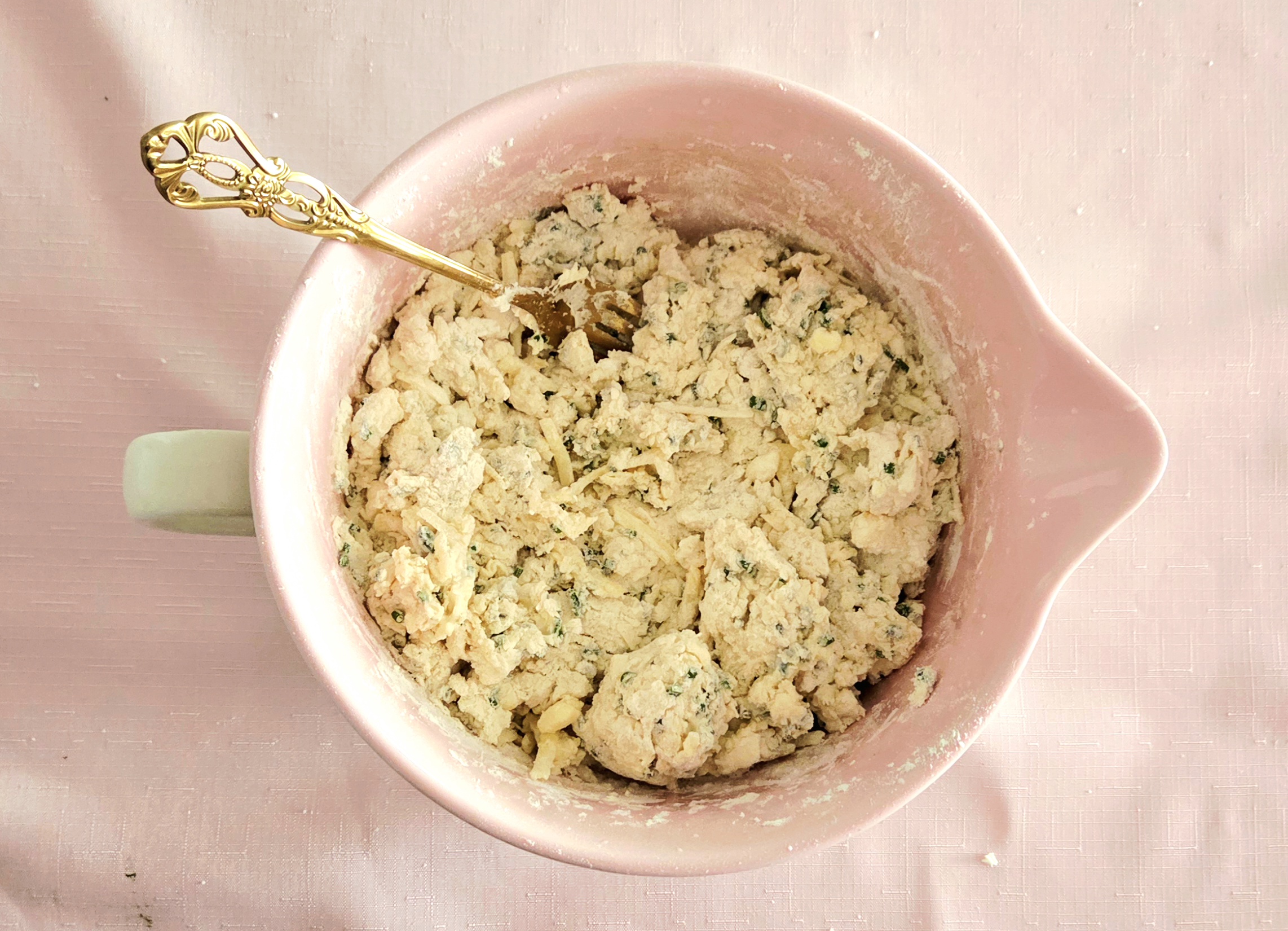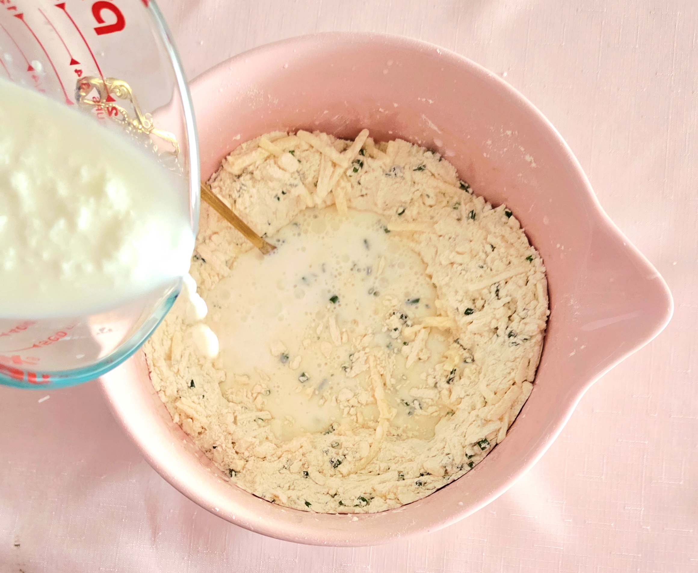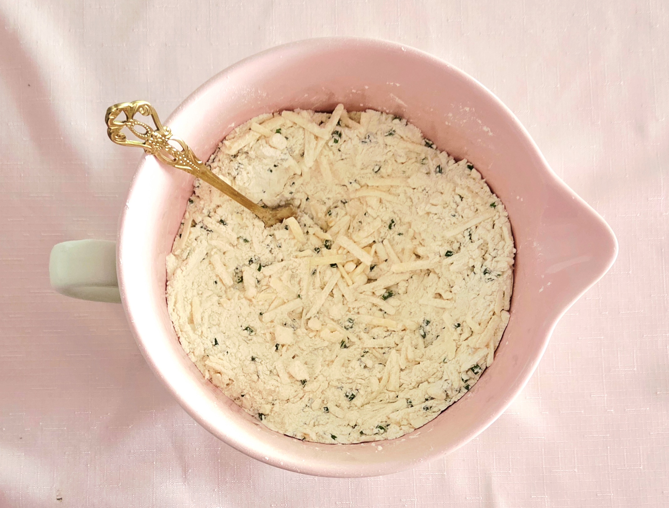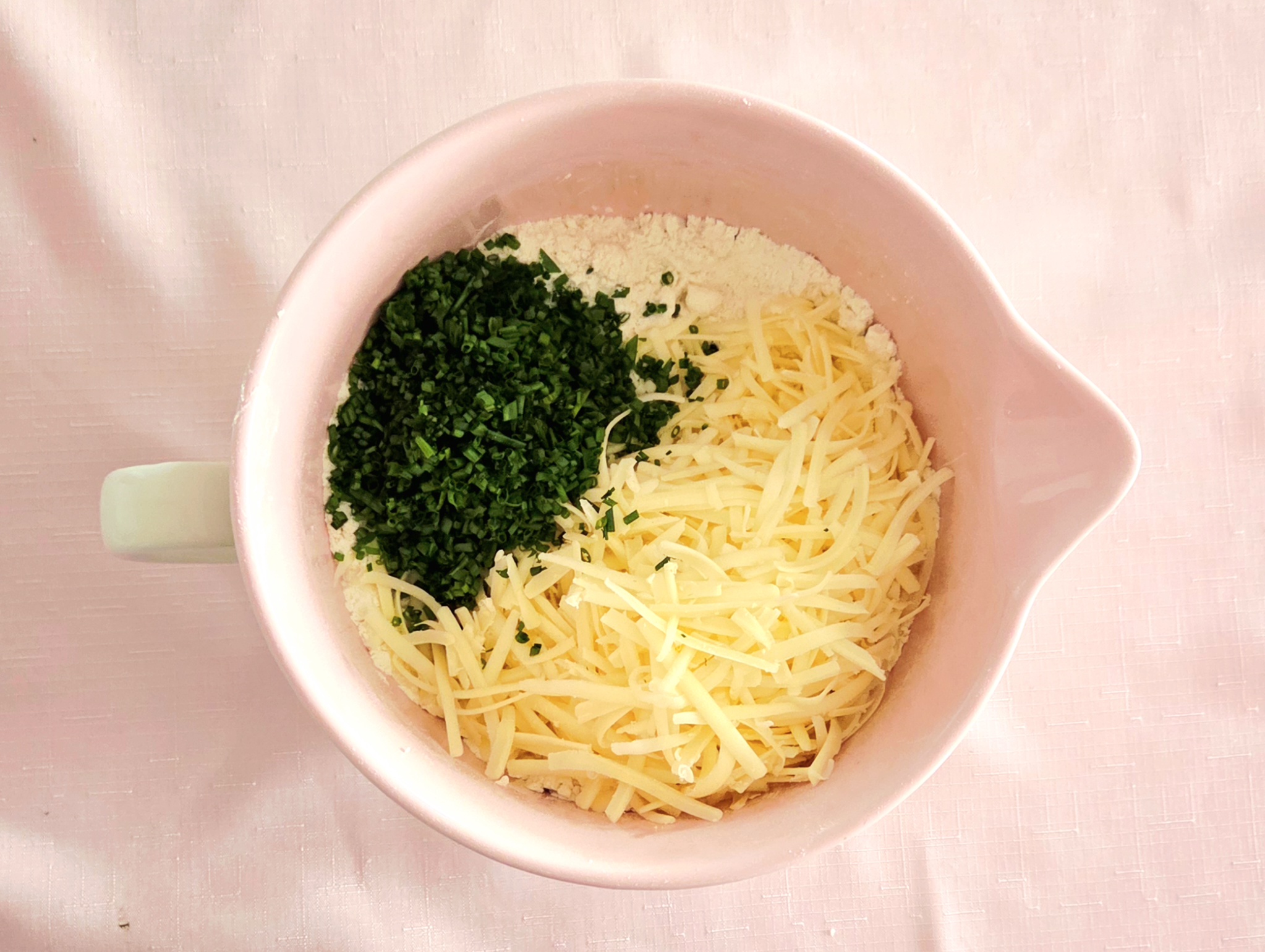 5. Add the grated cheddar and minced chives to the flour mixture and toss it with a fork until the cheese and chives have been evenly distributed.