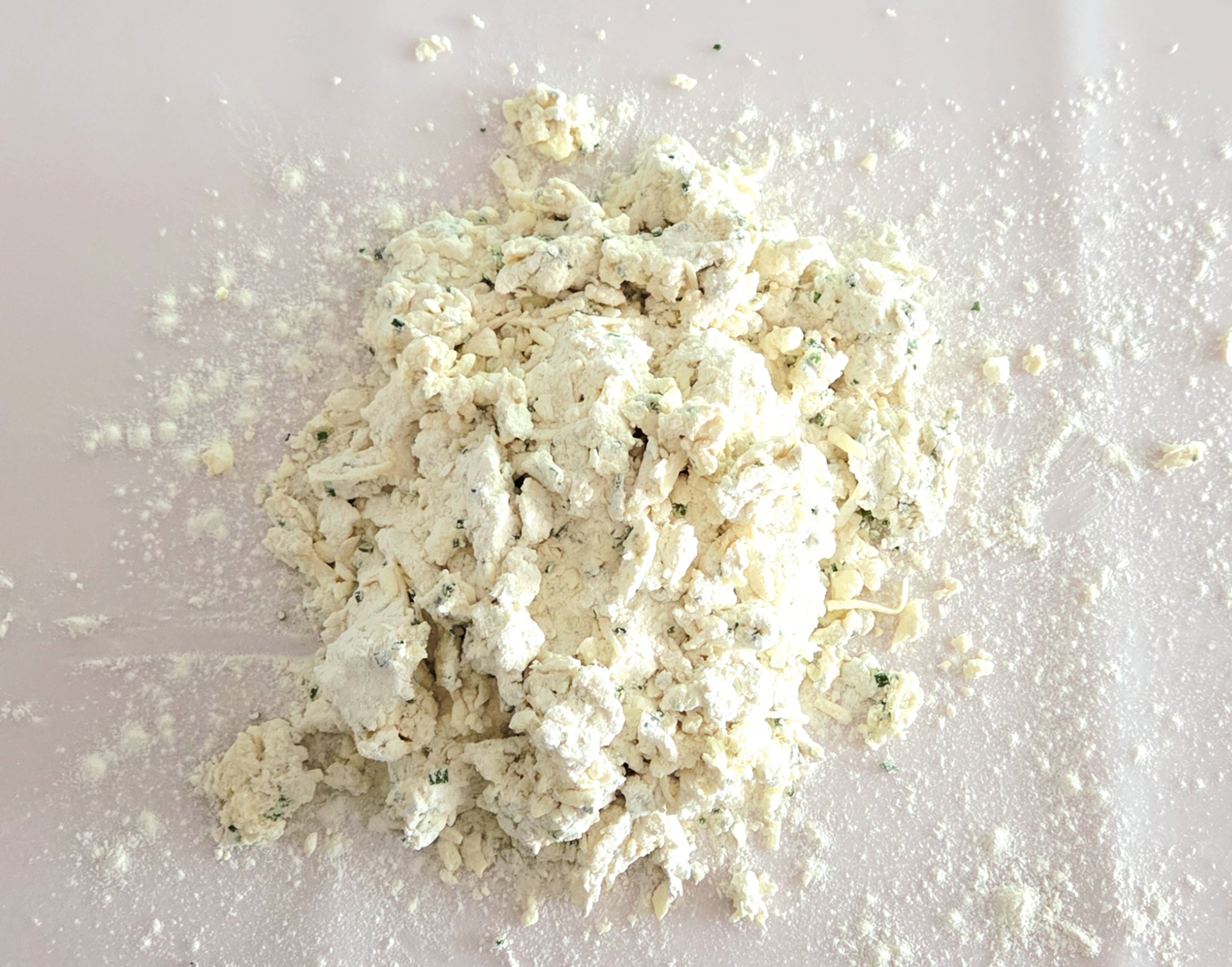 4. In a large mixing bowl, whisk together the flour, baking powder, sugar, onion powder, and salt. Add the cold cubes of butter and using a pastry blender, cut them into the flour mixture until the butter bits are no bigger than a pea.