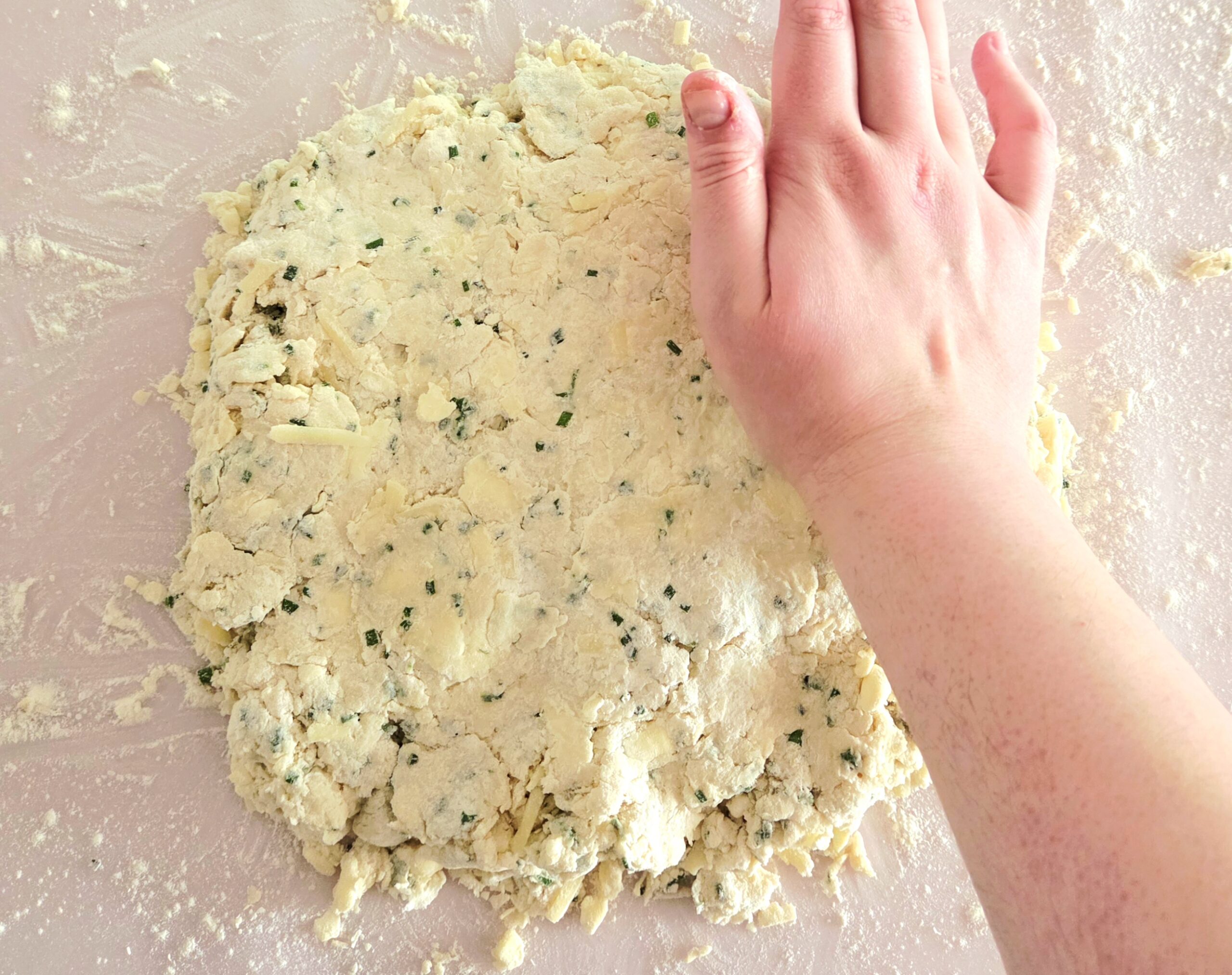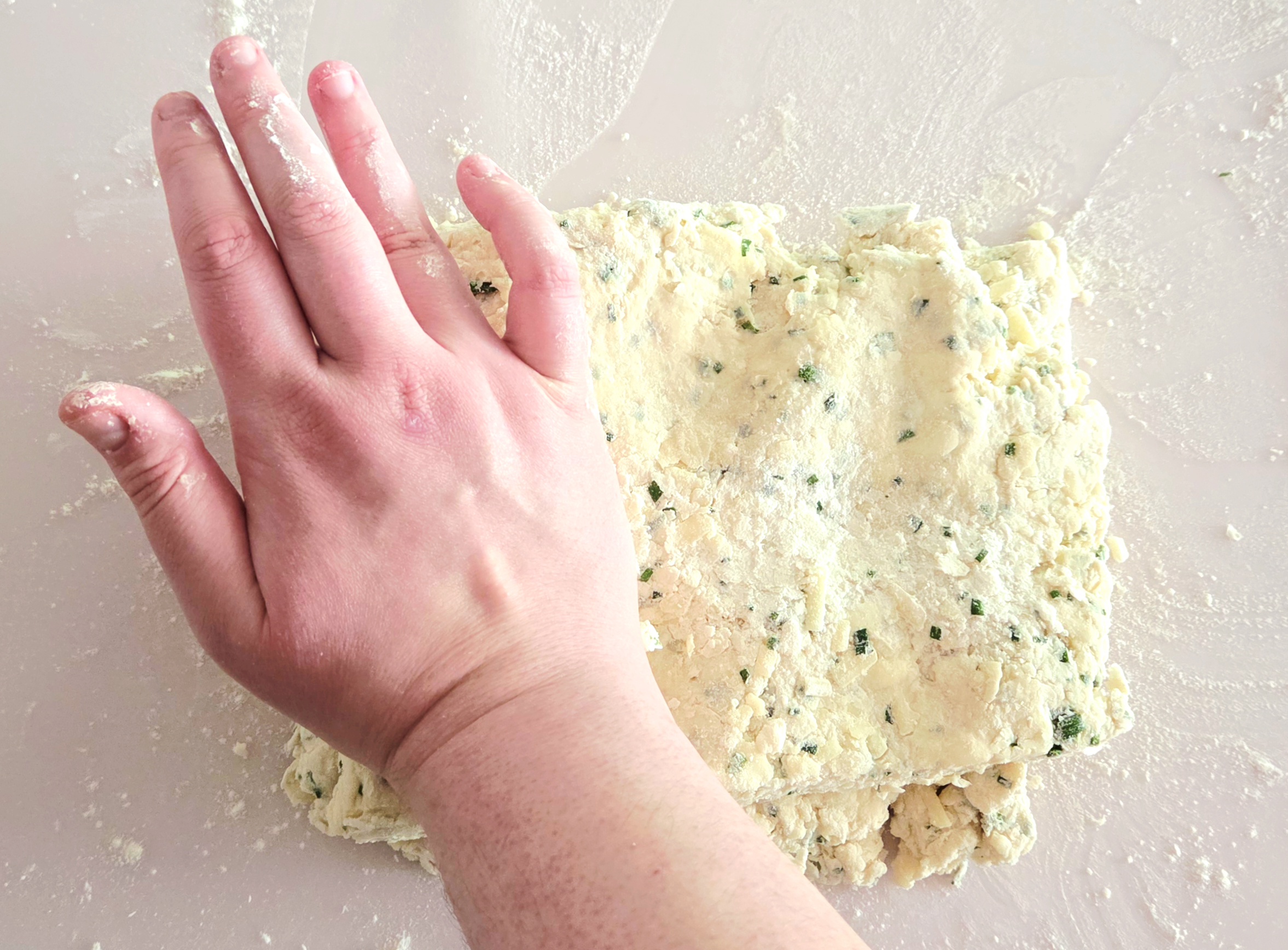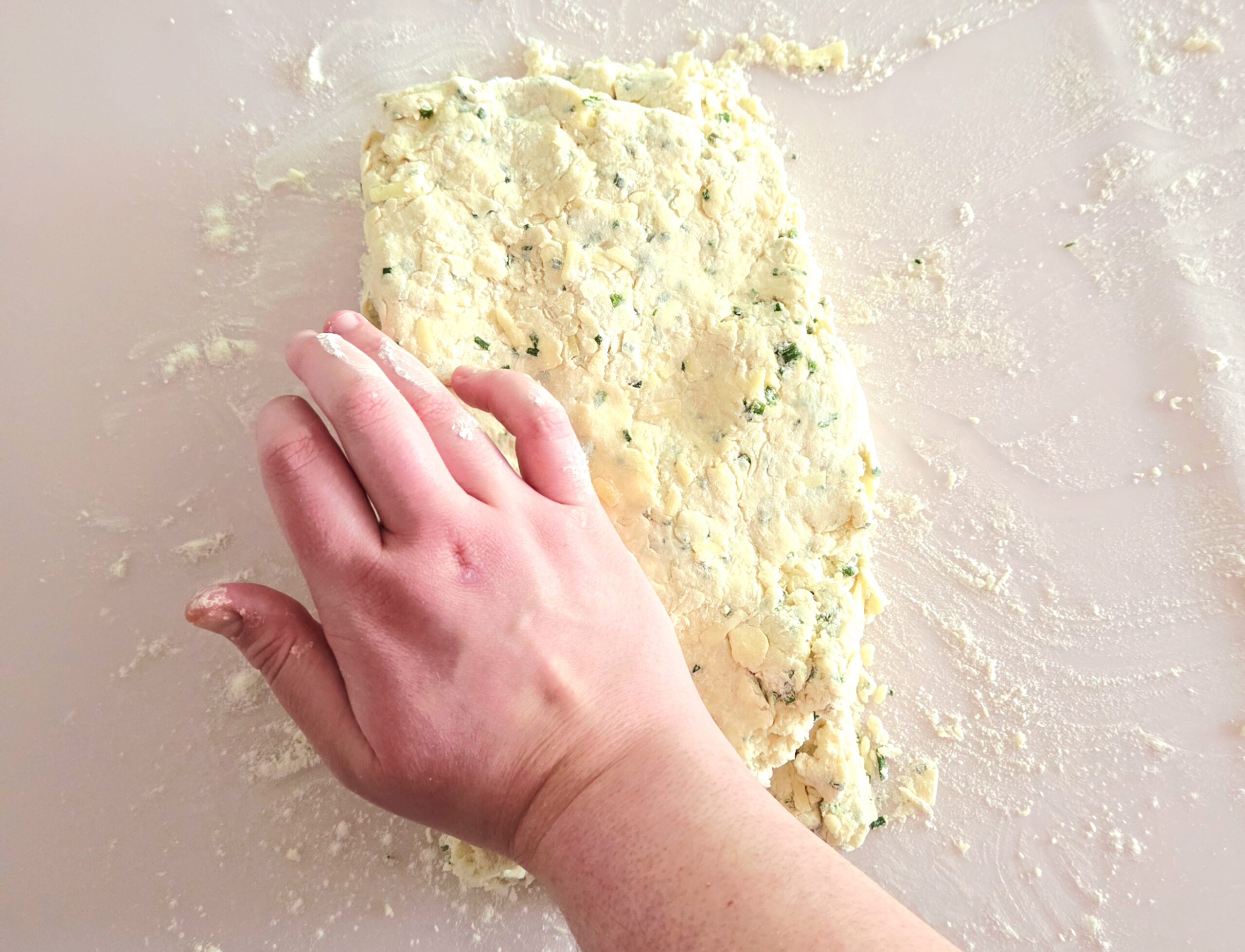 Knead the dough together for about a minute or so, doing your best not to warm it up. Warming the biscuits will melt the butter, which will hurt the final texture. They won’t be nearly as flaky or tender.