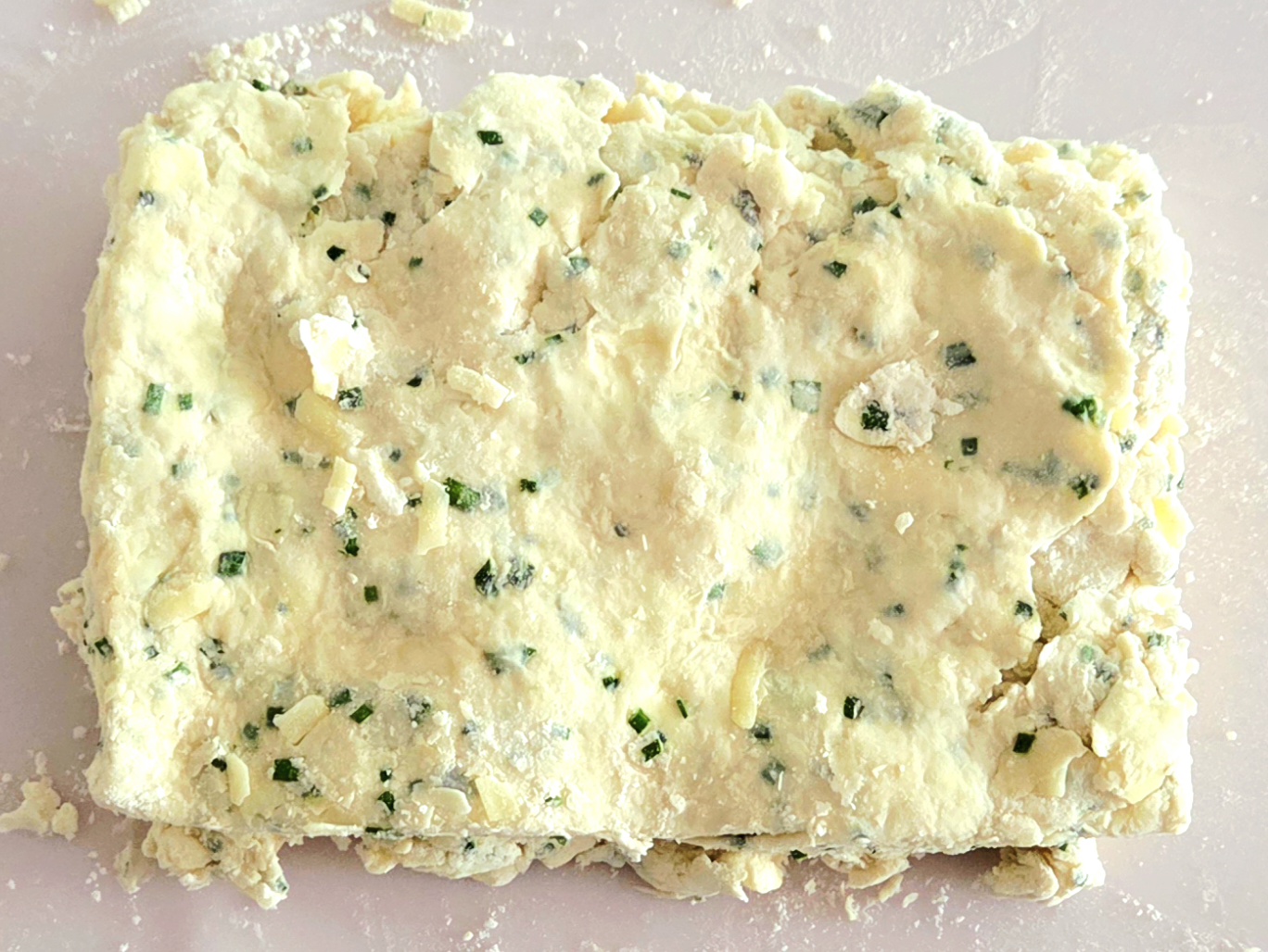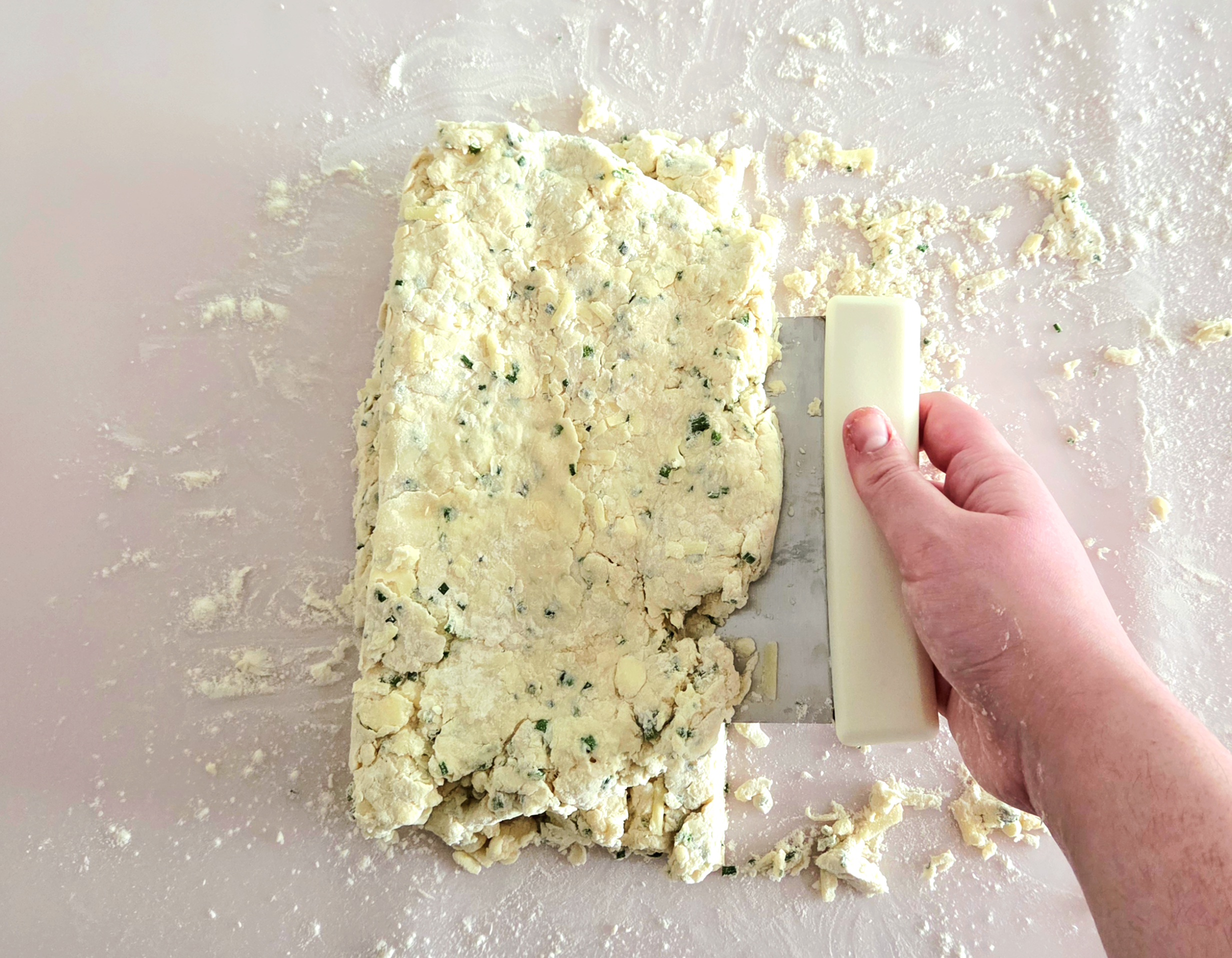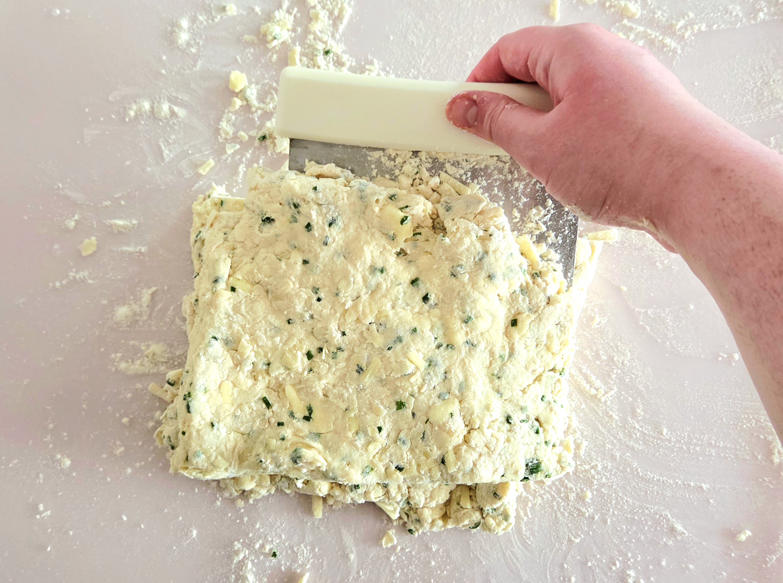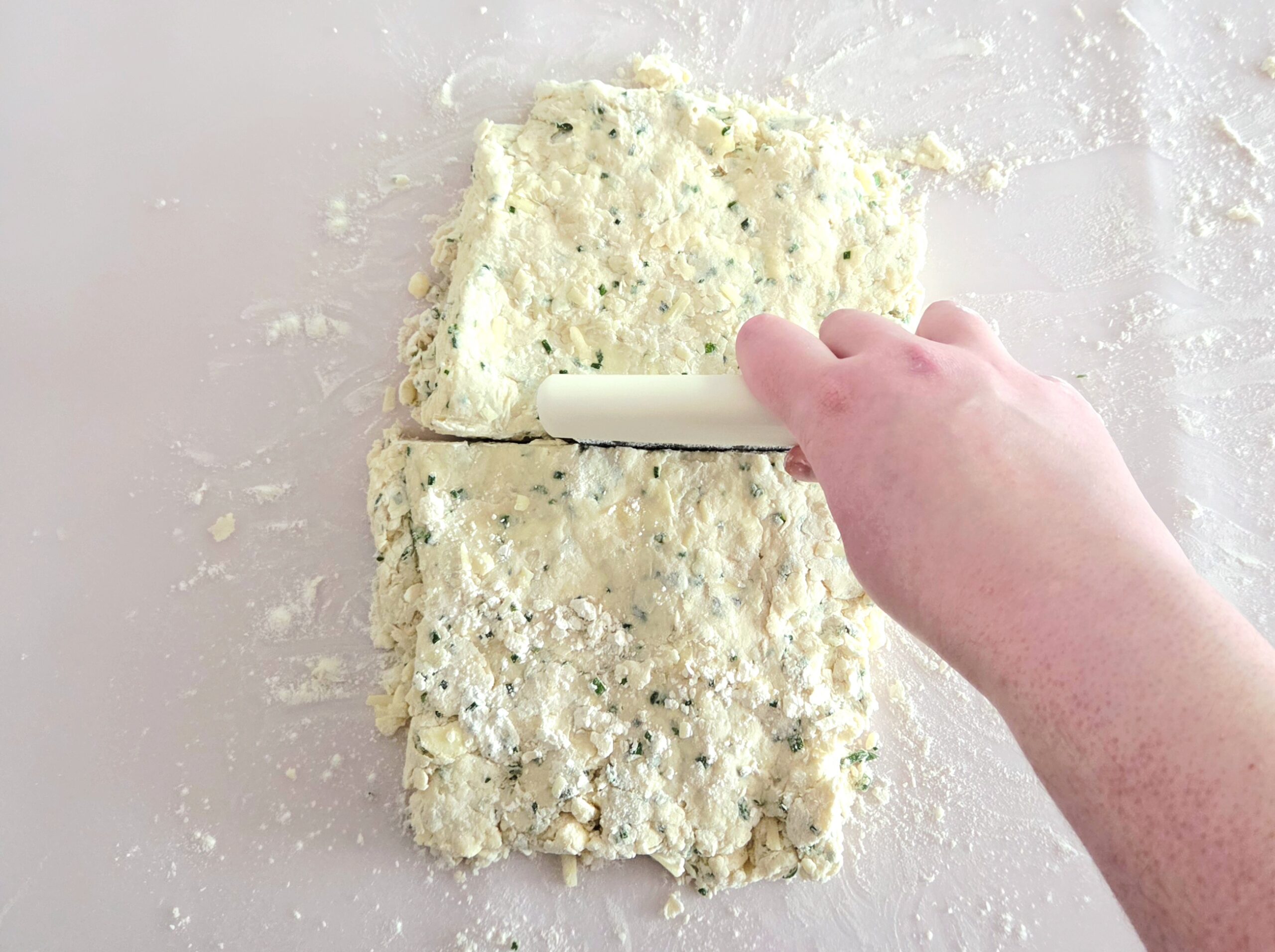 Time to create the layers that will make that flaky texture! Using a bench scrape, cut a line straight down the middle of the dough, so there are now two halves. Use the bench scraper to pick up one half and place it directly on top of the other half. Press the top gently onto the bottom, using the heel of your hand, until it’s once again around 1-inch thick.