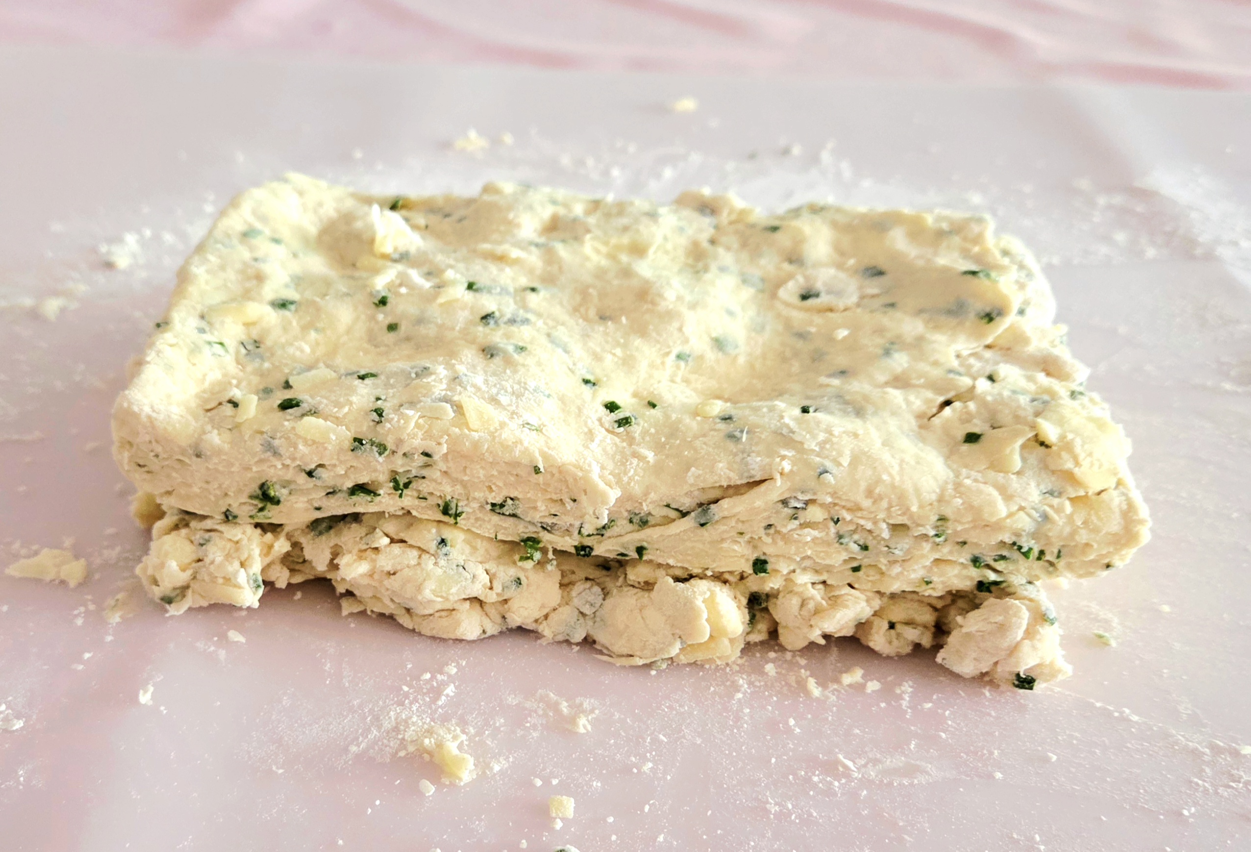 Again, cut the dough in half in the same direction you did the first time. Place one half on top of the other and pat it all down to 1-inch thick. One final time, cut the dough in half in the opposite direction, place one half on top of the other, and wrap it airtight in plastic. Place the wrapped up biscuit dough into the fridge to chill for 30-60 minutes, depending on how warm it got while it was being worked.
