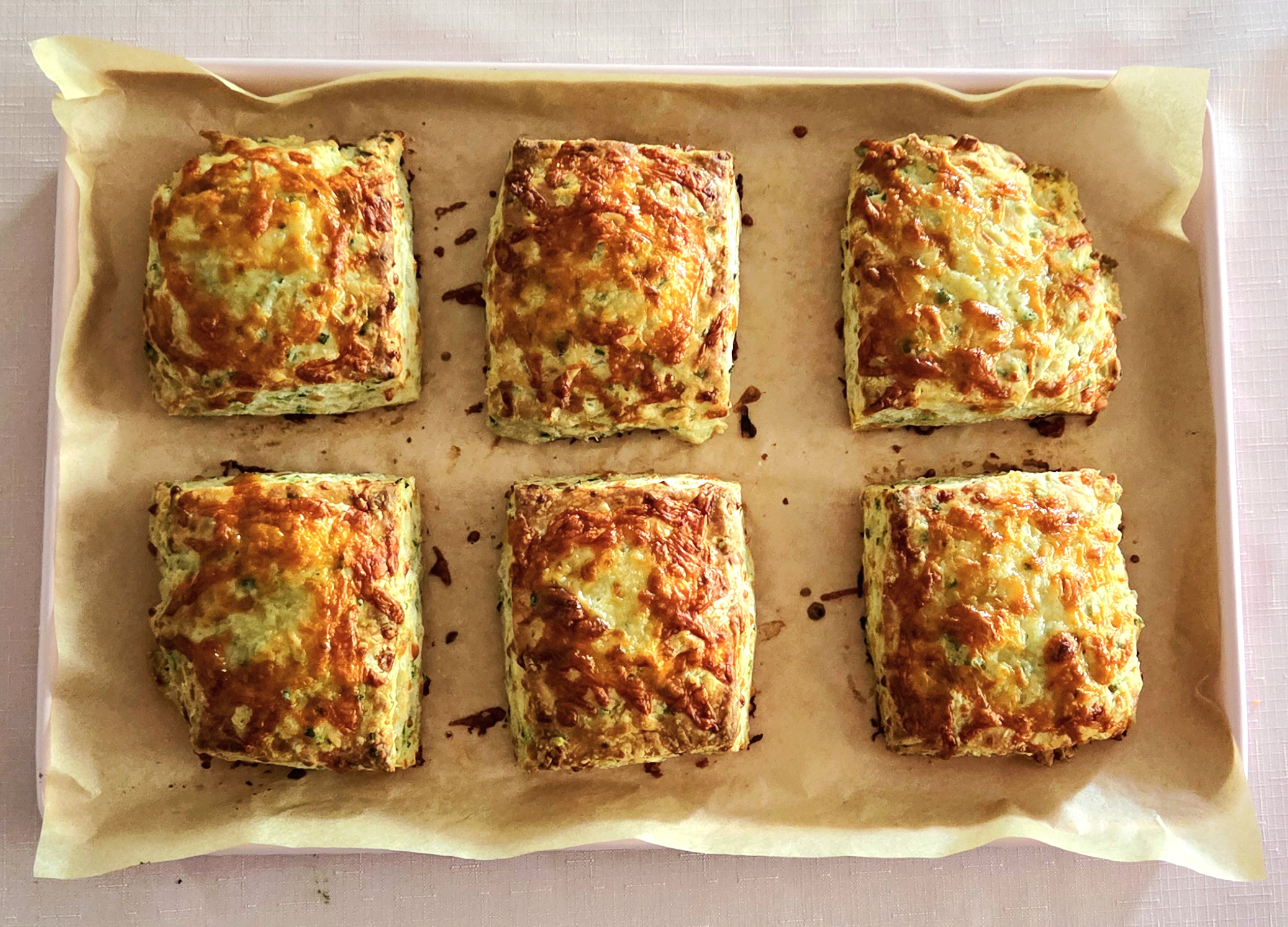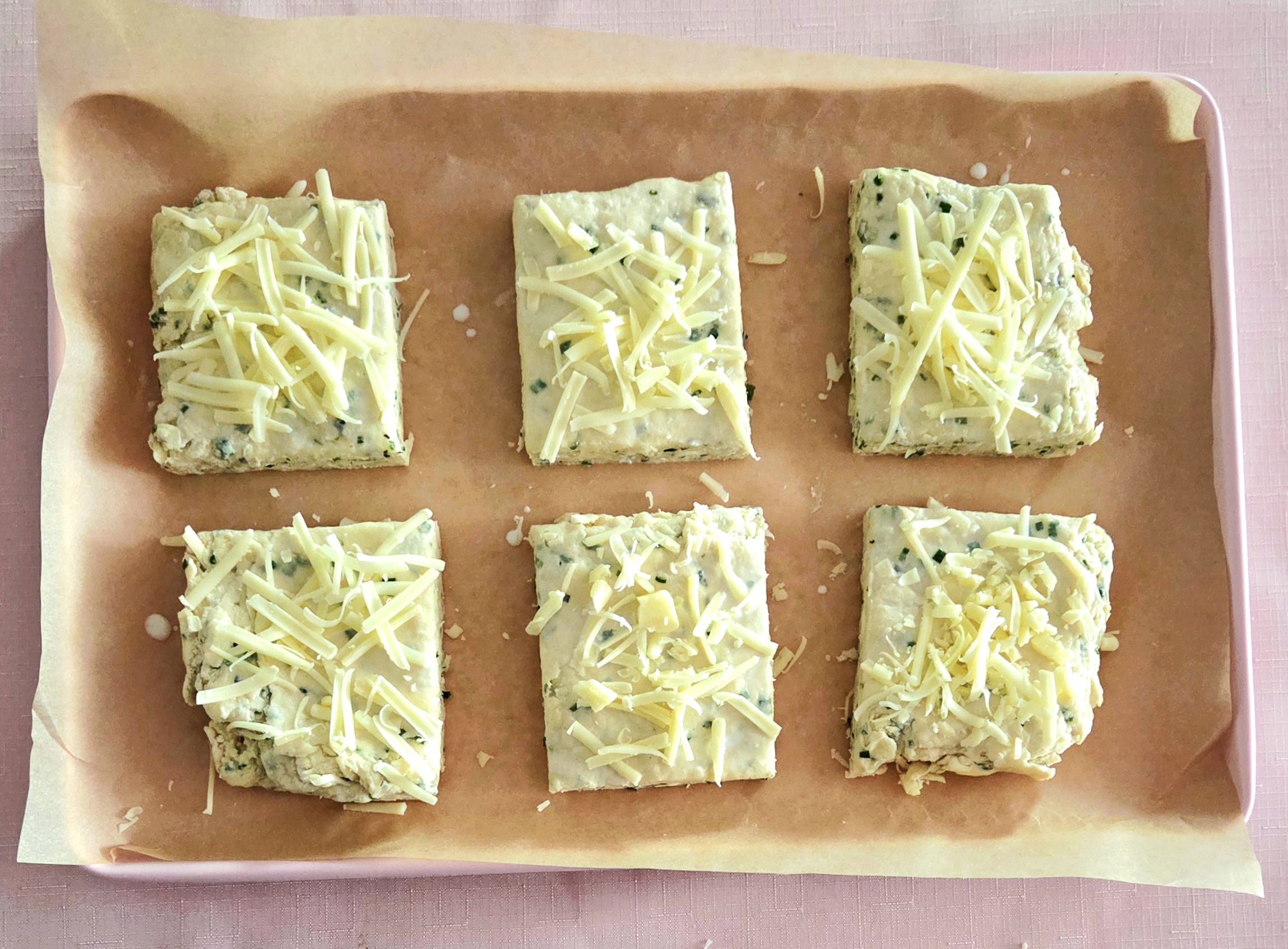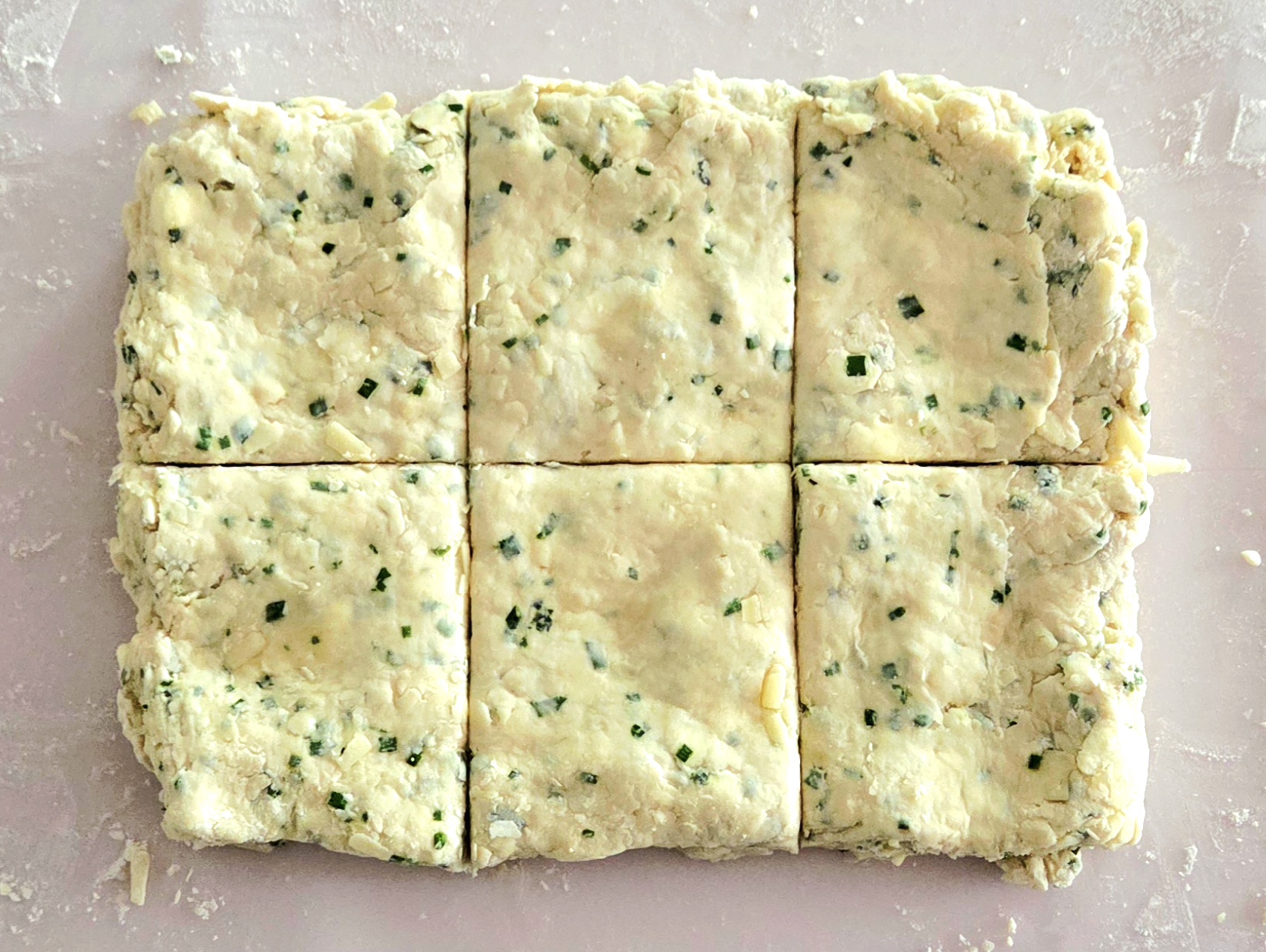 8. Pat the chilled dough out to an approximately 8×10 inch rectangle, 1-inch thick. Using the bench scraper, cut the rectangle into 6 equal squares, as shown above. Place the biscuits on the lined baking sheet, spaced 1-2 inches apart. Brush the tops of the biscuits with milk, using either a pastry brush or your finger. Grate a bit more cheese on top of each biscuit and place them in the oven for 16-18 minutes, or until the biscuits have puffed up and the tops are golden brown.