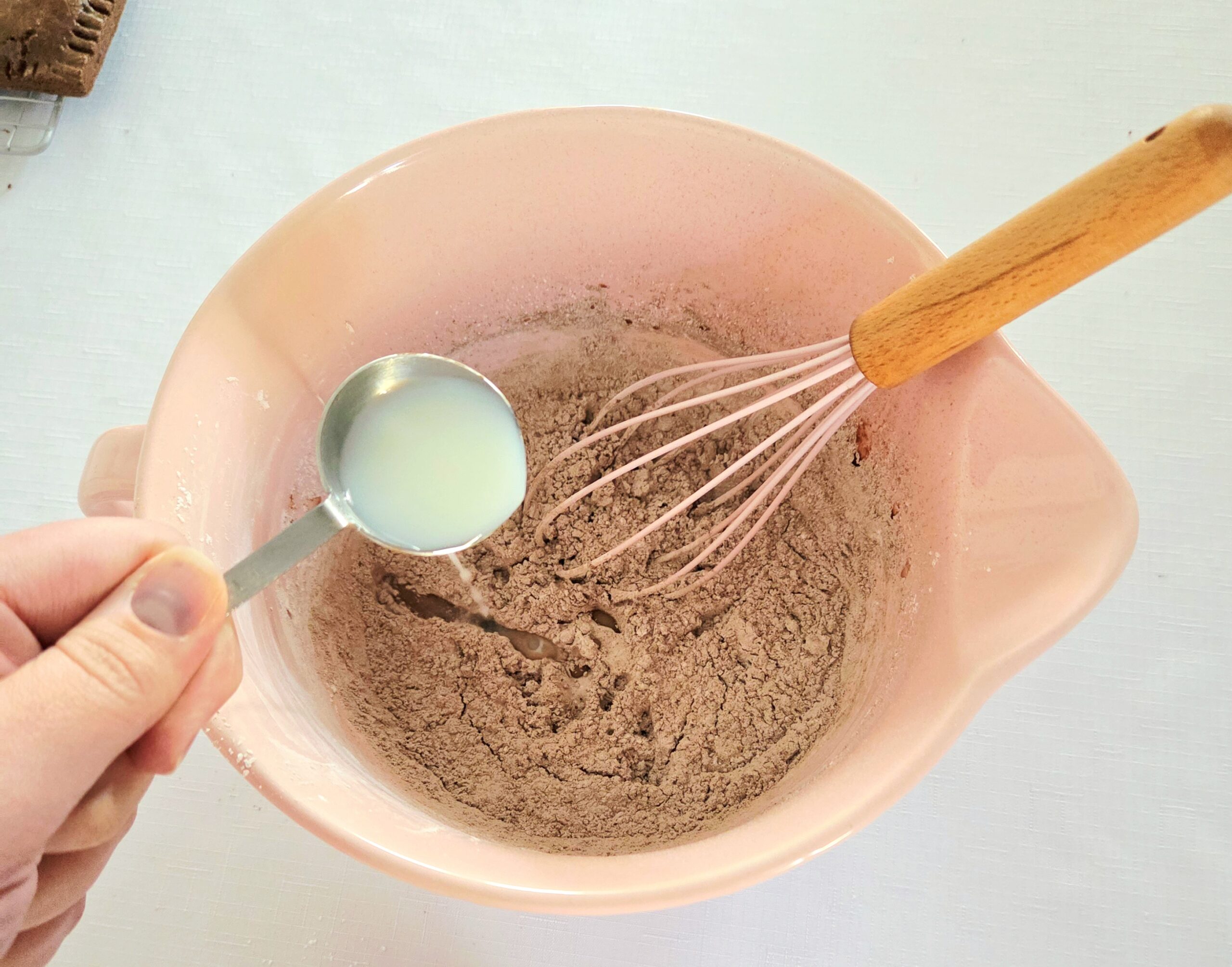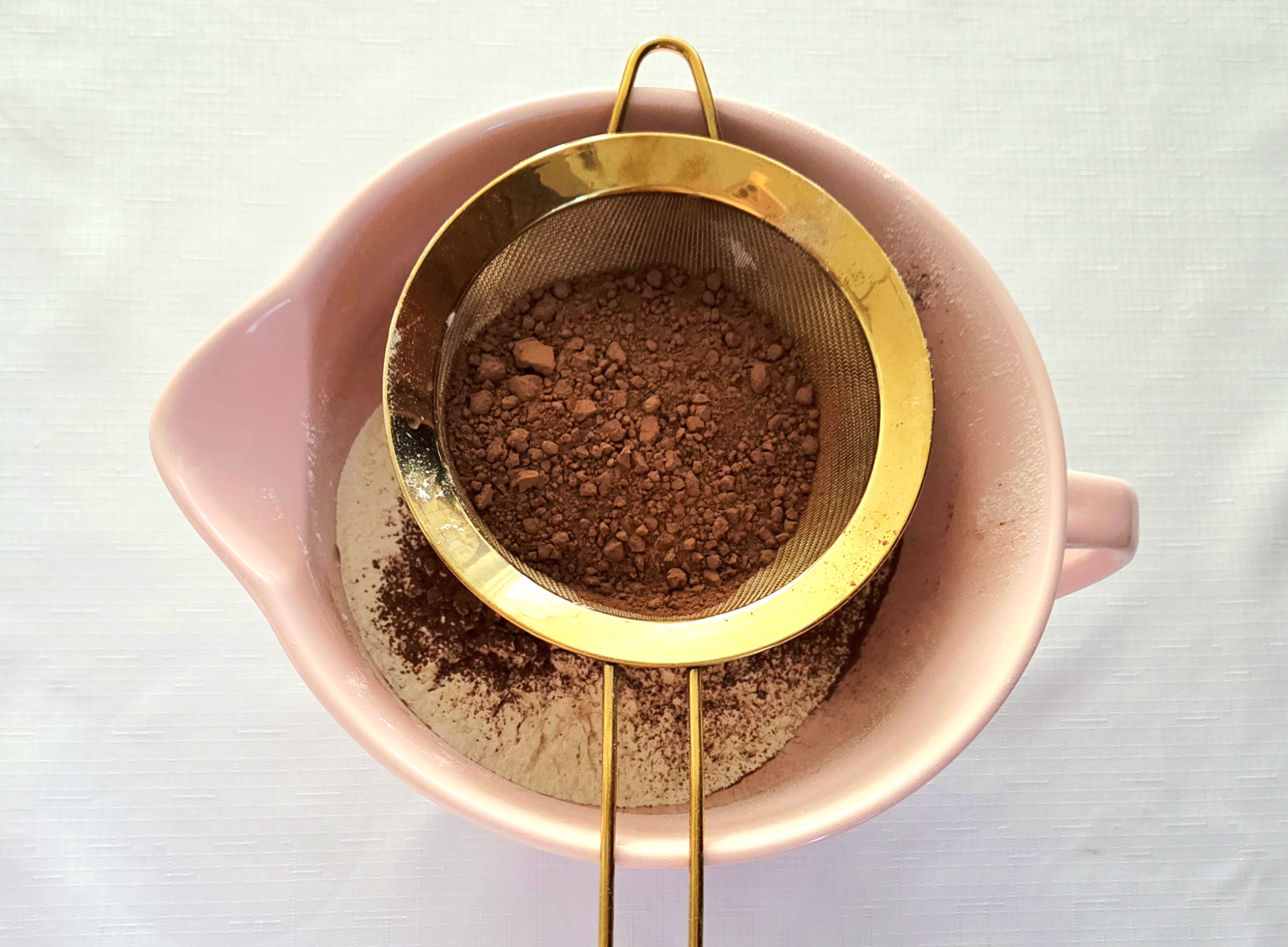 - Begin by throwing together the dough. In a medium mixing bowl, sift the cake flour and cocoa powder, and whisk them together along with the salt. Set this bowl aside.