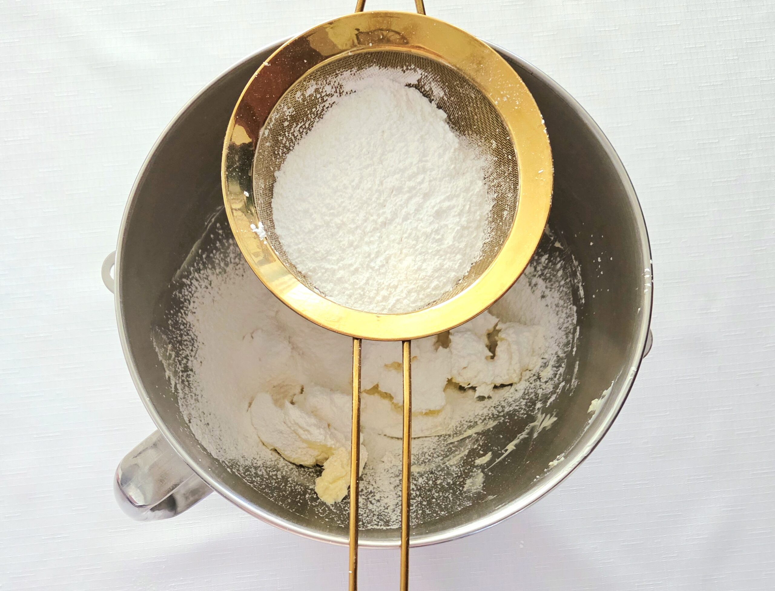 In the bowl of a stand mixer using the paddle attachment, beat the softened butter on level 3 for a minute. Sift the powdered sugar directly over it, then cream them together. The sifting is important, or you’ll end up with lumps of powdered sugar stuck in the dough. Start the mixer off slow, on level 1, so powdered sugar won’t go flying all over your kitchen. Increase the mixer to level 3 or 4 to finish creaming, 3-4 minutes. It should be light and creamy in the end.