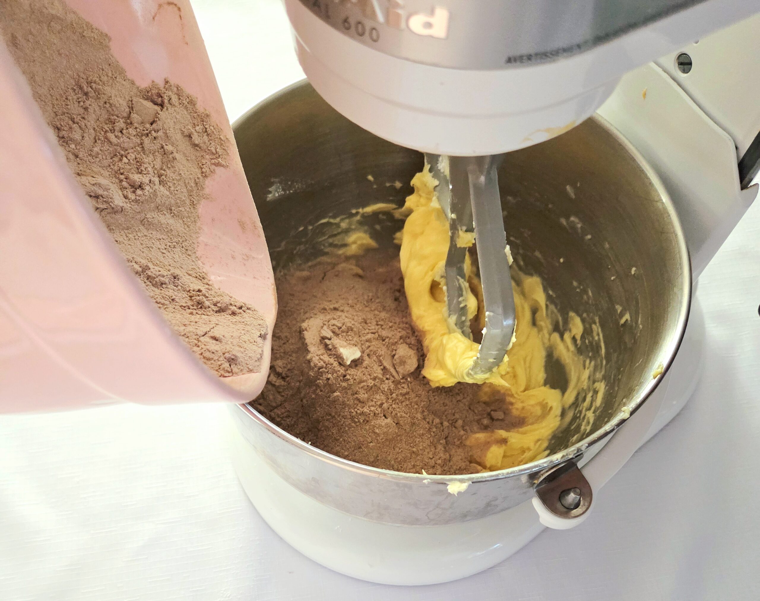All at once, add the dry goods to the butter mixture. Still using the paddle attachment, mix the cocoa-flour mix into the butter on level one. As soon as all of the dry goods have disappeared without a trace, leaving you with one homogeneous dough, turn the mixer off.