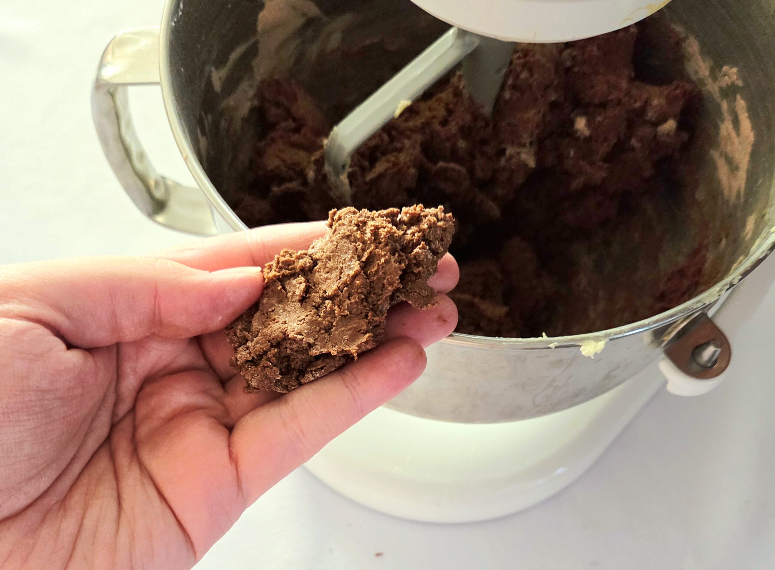 - All at once, add the dry goods to the butter mixture. Mix the cocoa-flour mix into the butter on level one. As soon as all of the dry goods have been absorbed and you have one homogeneous dough, turn the mixer off.