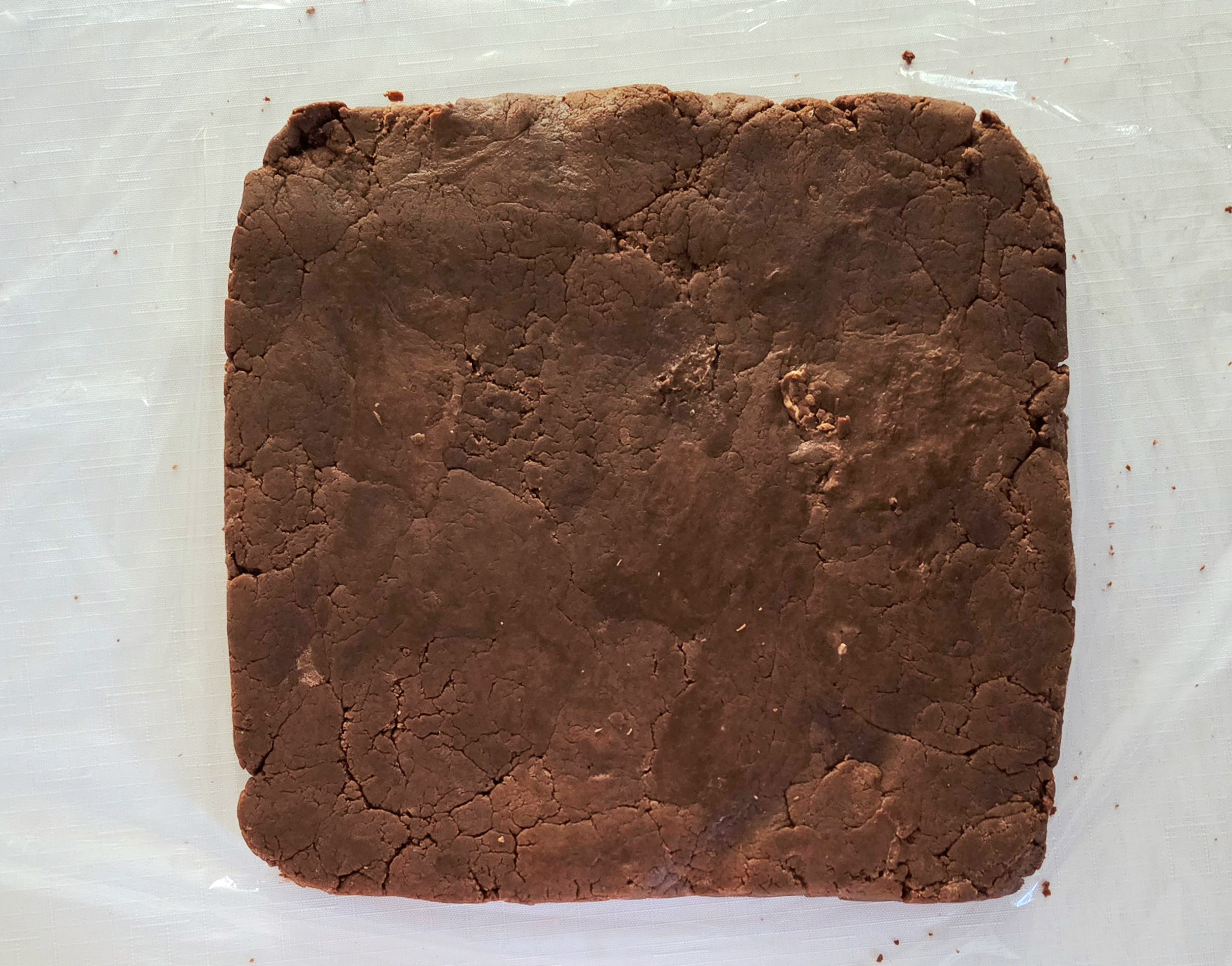 - Lay out a large sheet of plastic wrap and dump the dough into the middle of it. Gently press the dough into a large square, around 1-inch in thickness. and tightly wrap it in the plastic wrap so it’s air-tight. Place the dough on a flat surface in the fridge, and allow the dough to chill for a minimum of 1 hour or for up to 2 days.