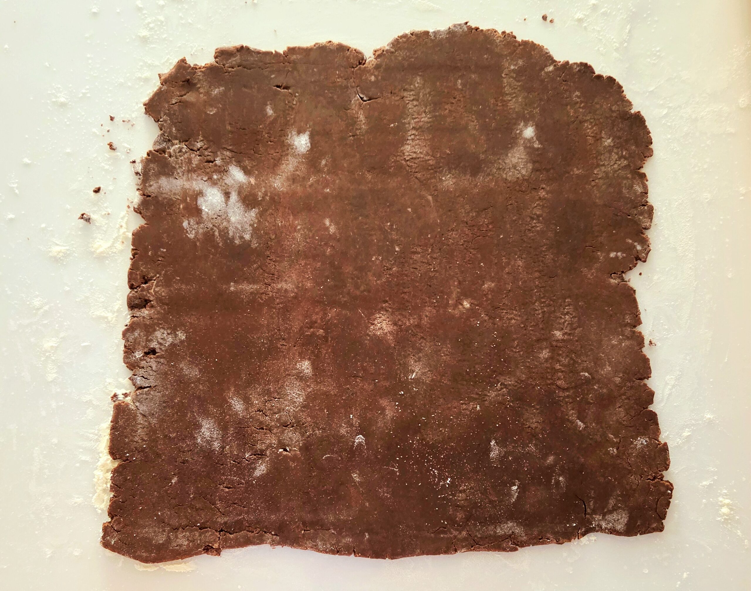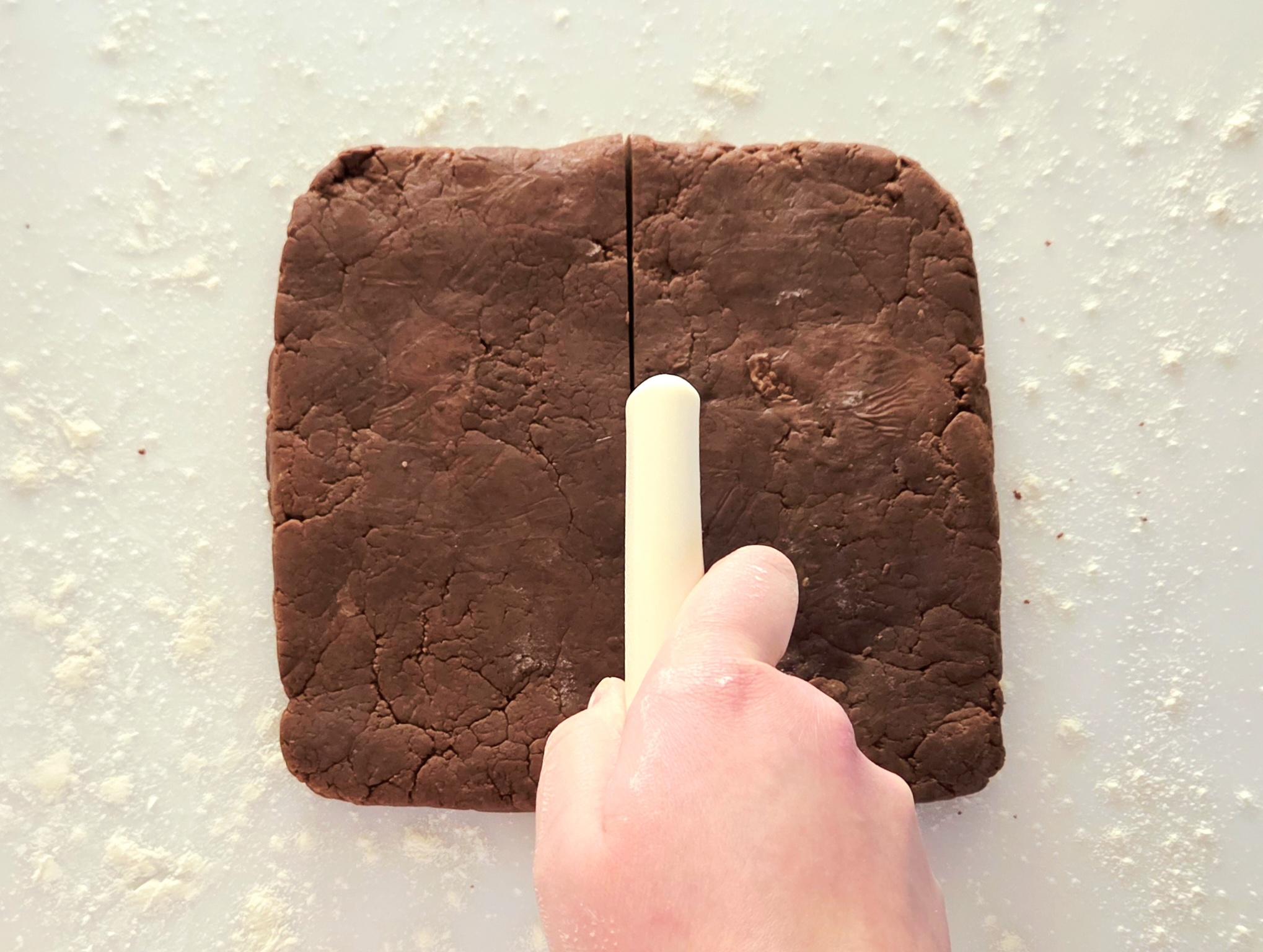 When you’re ready to assemble, preheat the oven to 350, on the convection setting if possible, and prepare the pans. Line two baking sheets with parchment paper or silicone baking mats, and set them aside. Remove the dough from the fridge and allow it to sit at room temperature for a few minutes, so it will be easier to roll out. Using a knife or bench scraper, cut the slab of dough in half, giving you two equal rectangles.