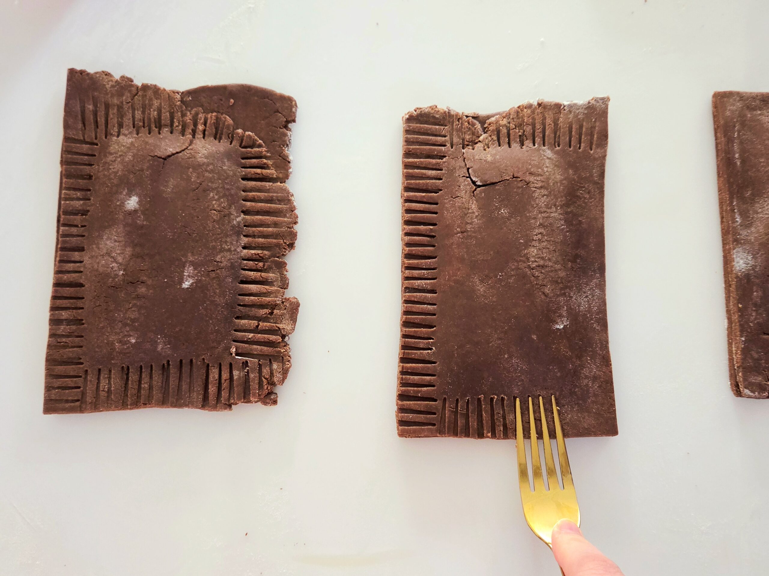 - Take the fork and crimp along all 4 edges of each pop tart, as close to the filling as you can get it without tearing another hole. Cover the assembled pop tarts with plastic and chill them in the fridge for another 30 minutes. While the first pan of pop tarts chills, repeat steps 6-9 with the second pan of rectangles.