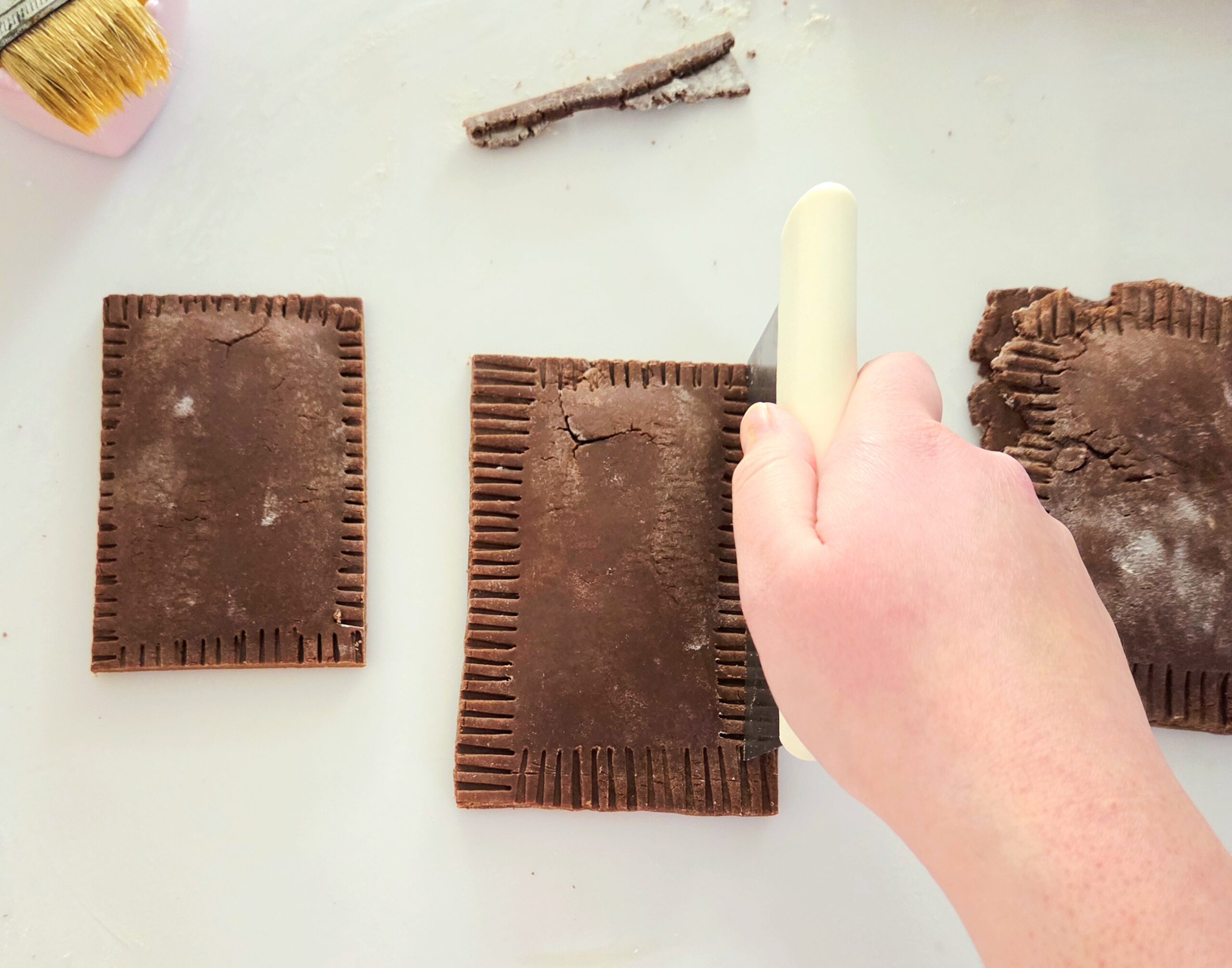 Remove the first prepared pan of pop tarts from the fridge and, before placing them in the oven, trim the sides. Using the bench scraper or knife, press firmly down on each side so there’s about 1/4 inch boarder remaining. Take care not to drag your tool, or the dough can tear. Just keep lifting and pressing straight down.