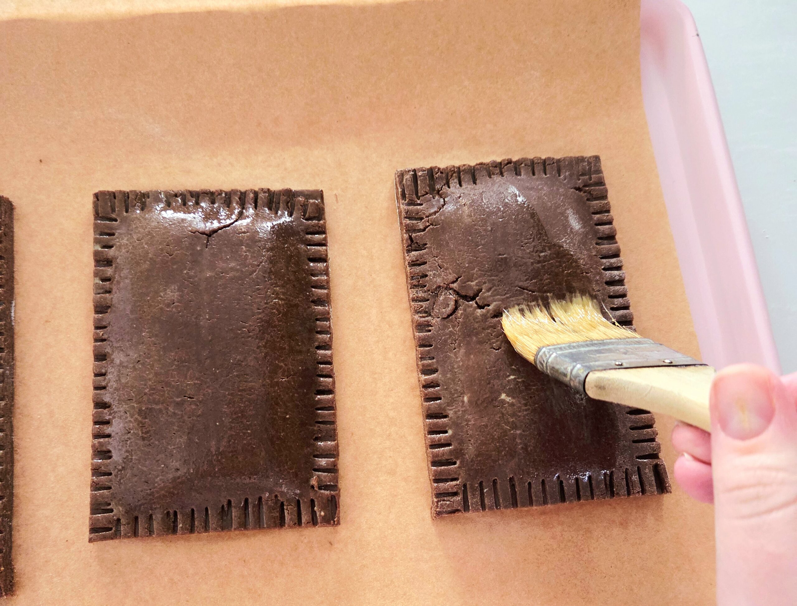 Arrange the 3 pop tarts so they’re evenly spaced on the pan, though they wont expand much in the oven. Brush the tops of each pop tart with the egg wash. You’ve already got the egg wash made and the brush dirtied, do not skip this step.
