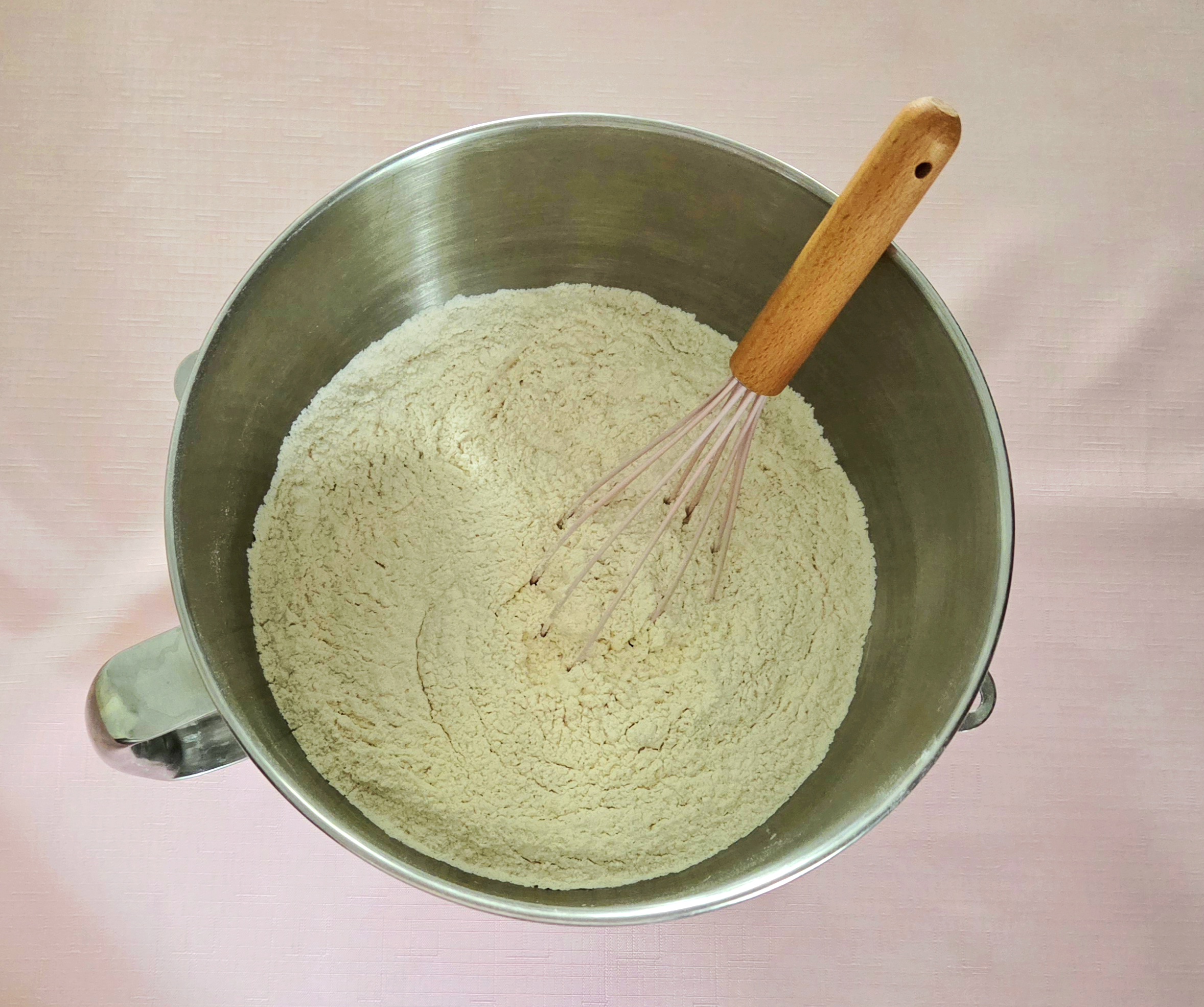 - In a small microwavable bowl, heat the butter in 30 second increments, swirling in between to eliminate any hot spots, until it’s just melted and set it aside to cool. In the bowl of a stand mixer, whisk together the flour, sugar, salt, and yeast.