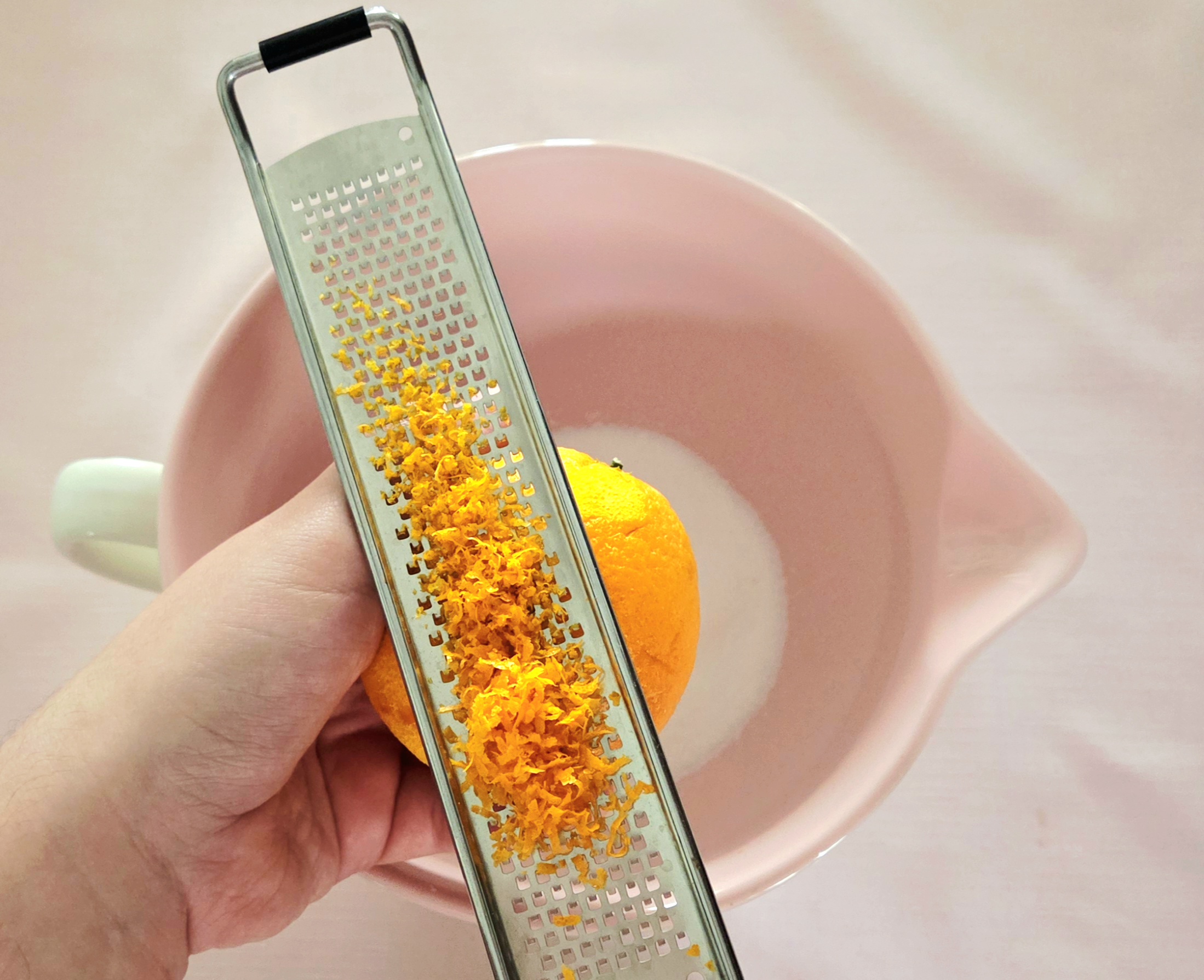 I like to use the Martha Stewart method, since it’s easier to see what’s going on with the fruit that way. Take your microplane or fine grater and drag it along the top of the orange in short bursts, shaving off the outer orange part of the peel and avoiding the white pith underneath. Turn the orange as you need to. The zest will collect on top of your tool of choice, simply dump it into the sugar when you’re ready to.