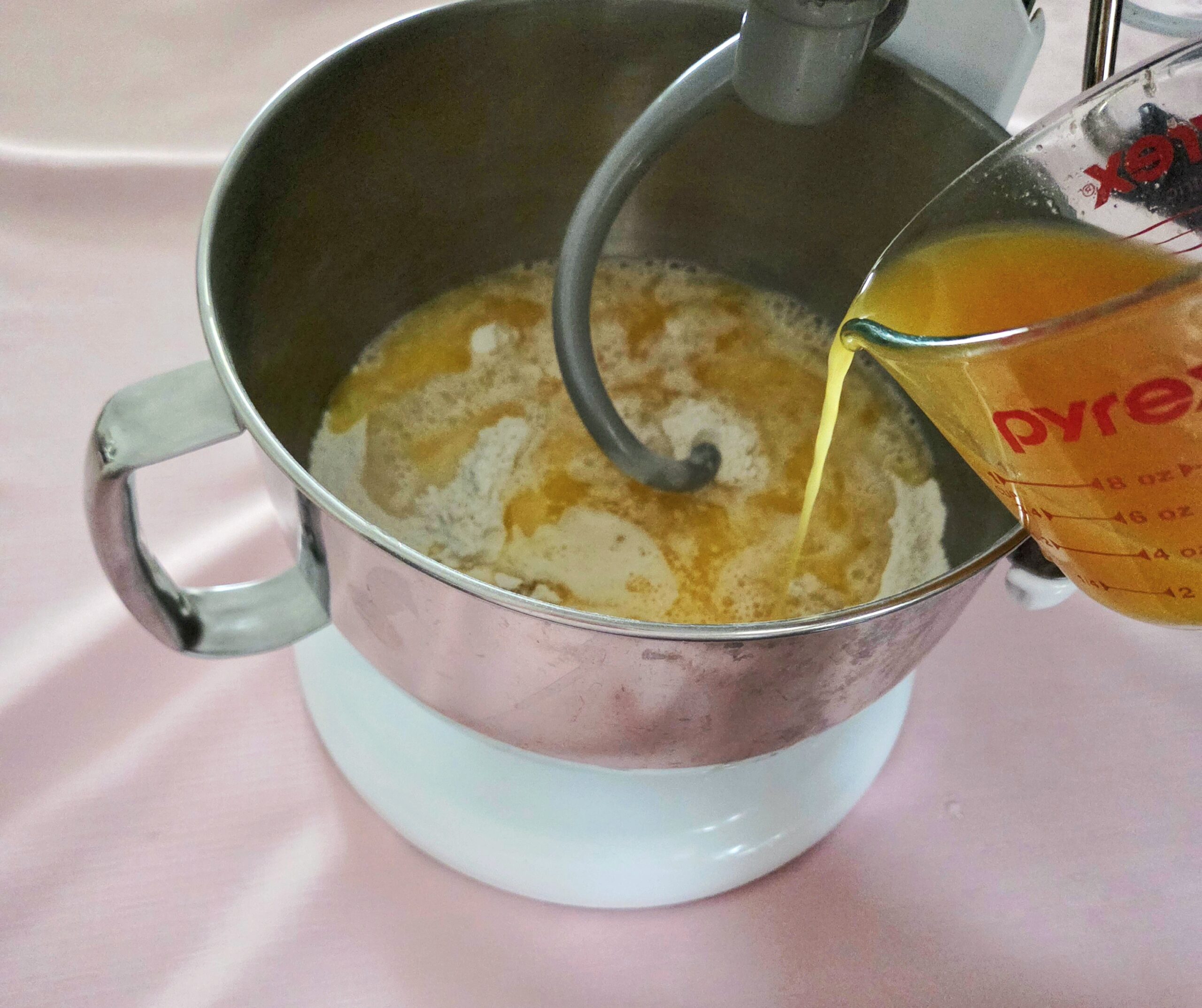 - Slice 8-10 medium oranges and squeeze out 1 cup worth of orange juice into a liquid measuring cup. Pour the orange juice, water, and cooled melted butter into the dry goods. Using the dough hook attachment, knead the dough in the stand mixer on level 2 until a tacky but not sticky dough comes together, then knead it for 5 minutes more.