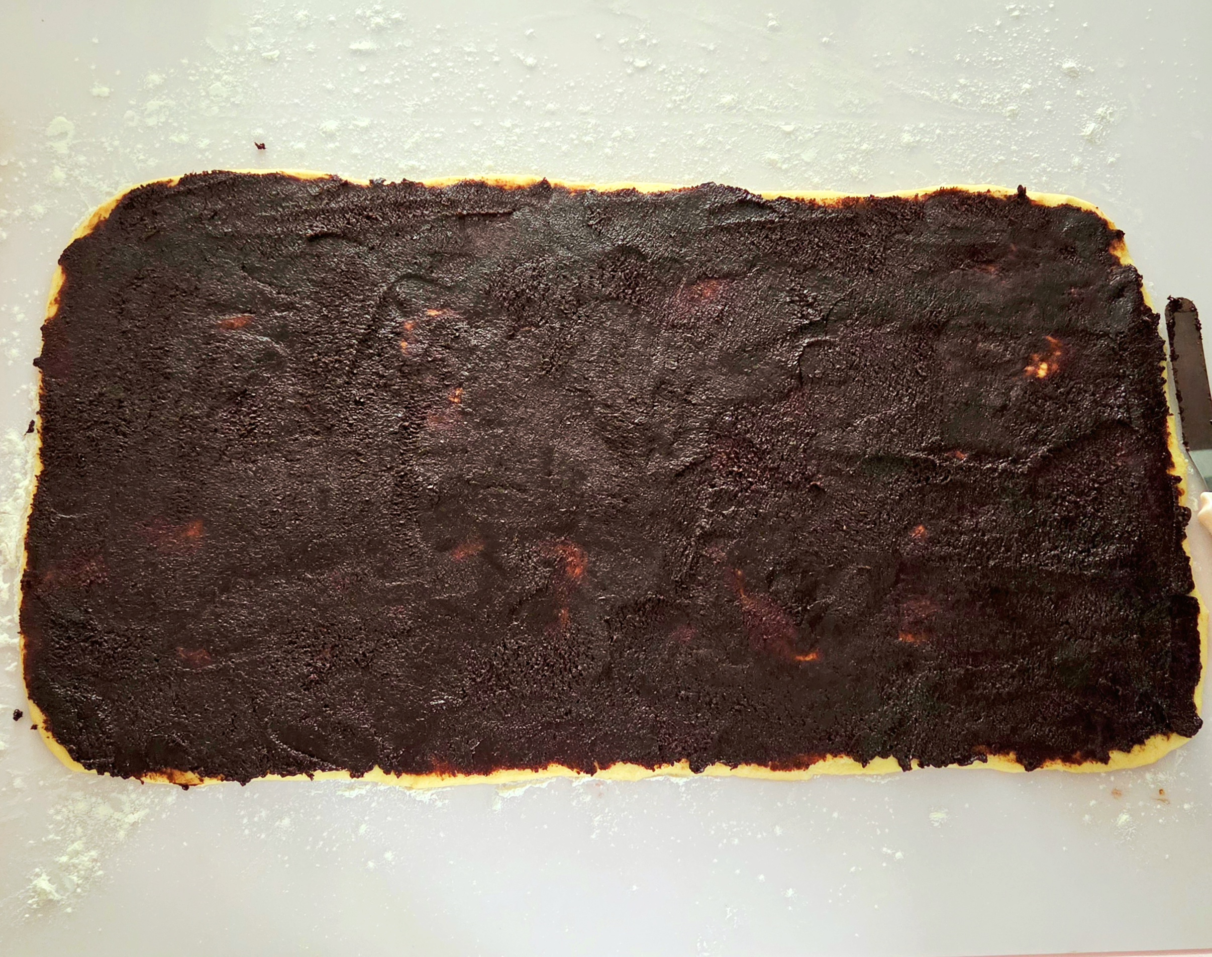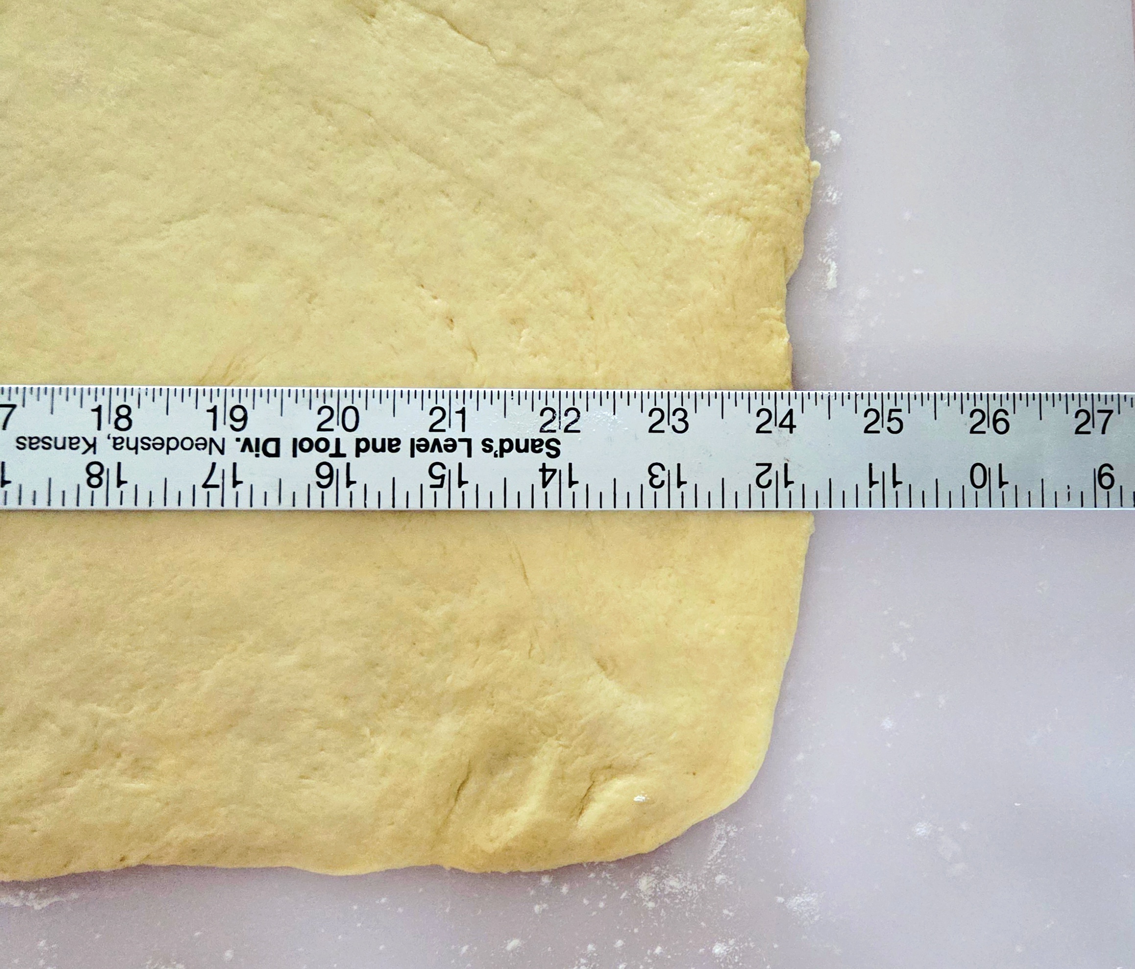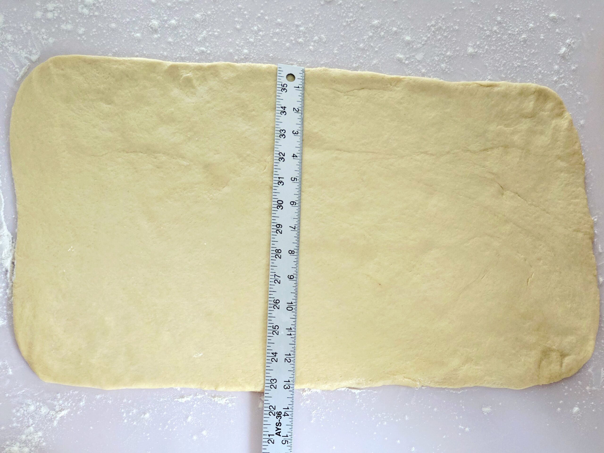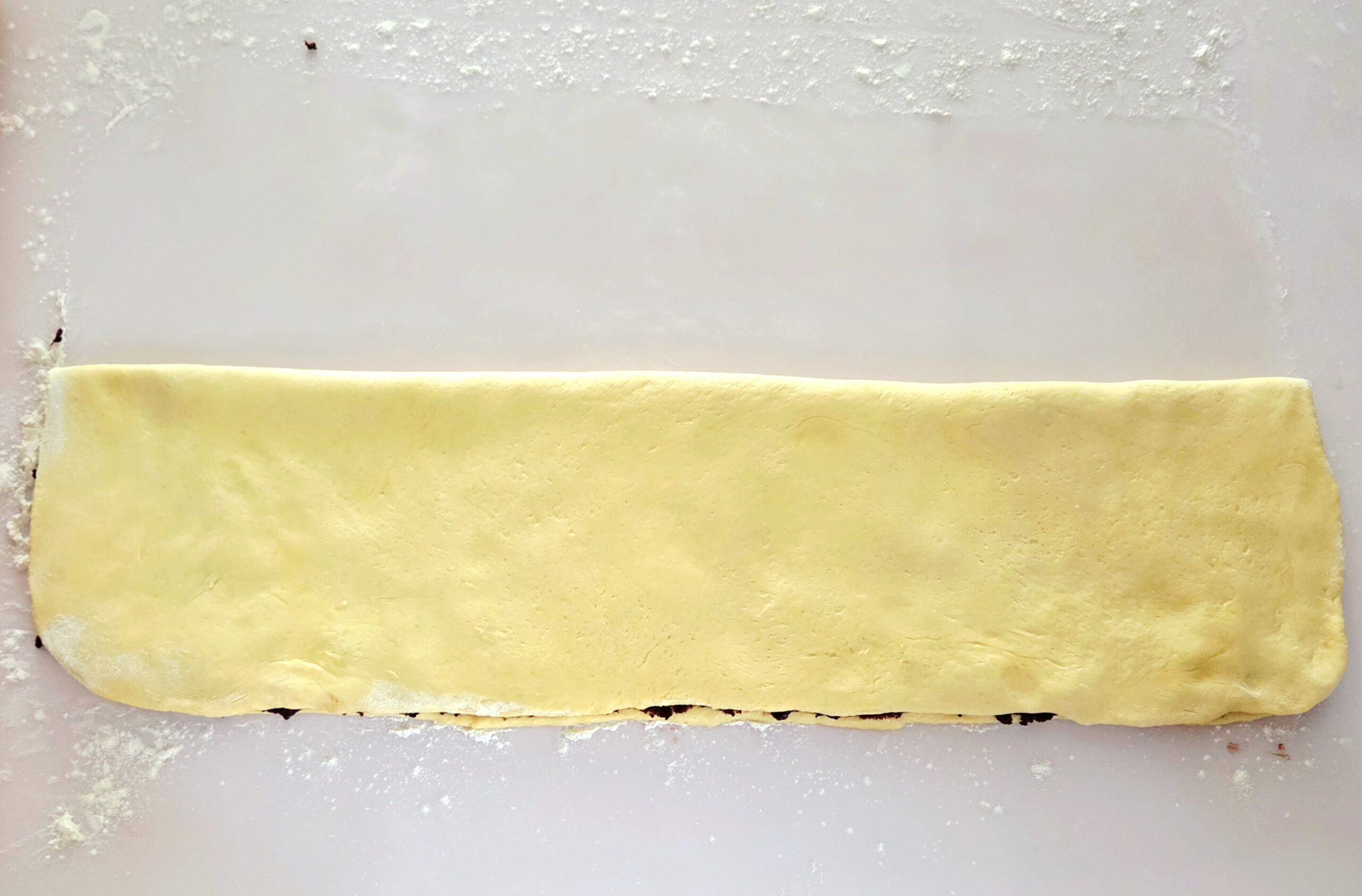 Now that the dough has proofed, it’s time to assemble everything! On a clean counter, lightly sprinkle flour and place the proofed dough in the center. Sprinkle more flour onto the dough and roll it out to a 13 x 24 inch rectangle. If it starts to stick to either the rolling pin or the counter, add a bit more flour and continue on.