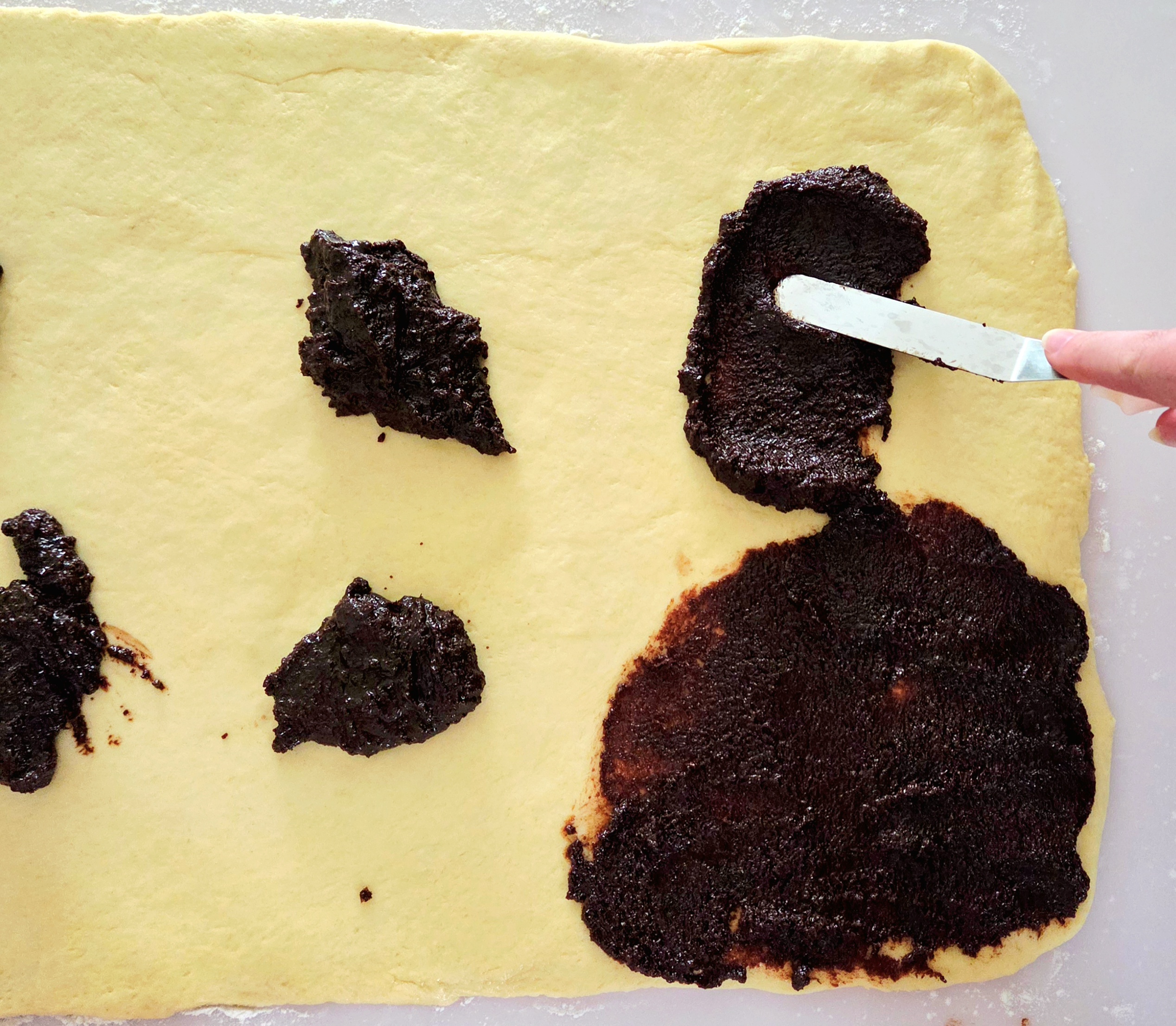 - Take the filling and dollop portions over the expanse of the dough. Using an offset spatula or butter knife, gently spread out the filling so it covers the entirety of the rectangle.
