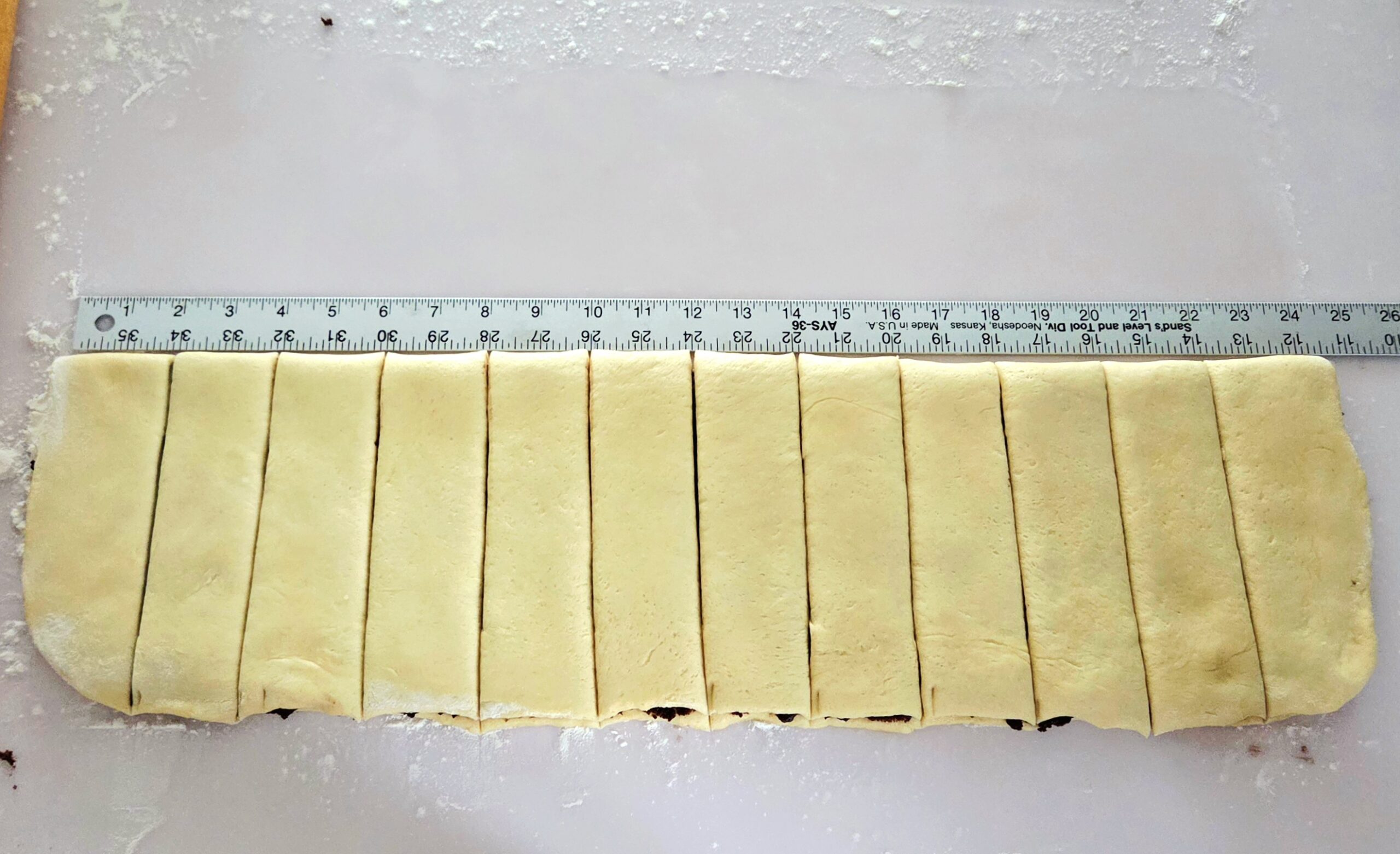 - Fold the rectangle in half width-wise, so it now measures about 6 x 24 inches. Using either a chef’s knife or a bench scraper, cut strips of dough every two inches, so you end up with 12 strips. See reference photos above.