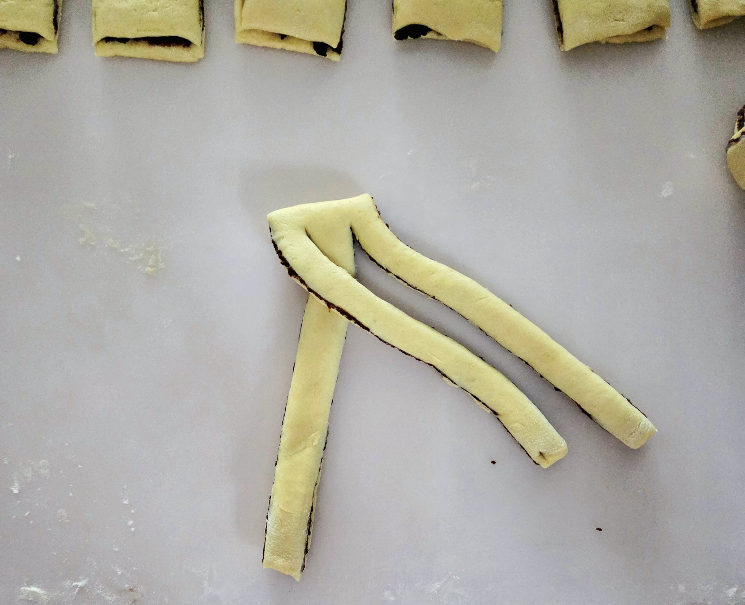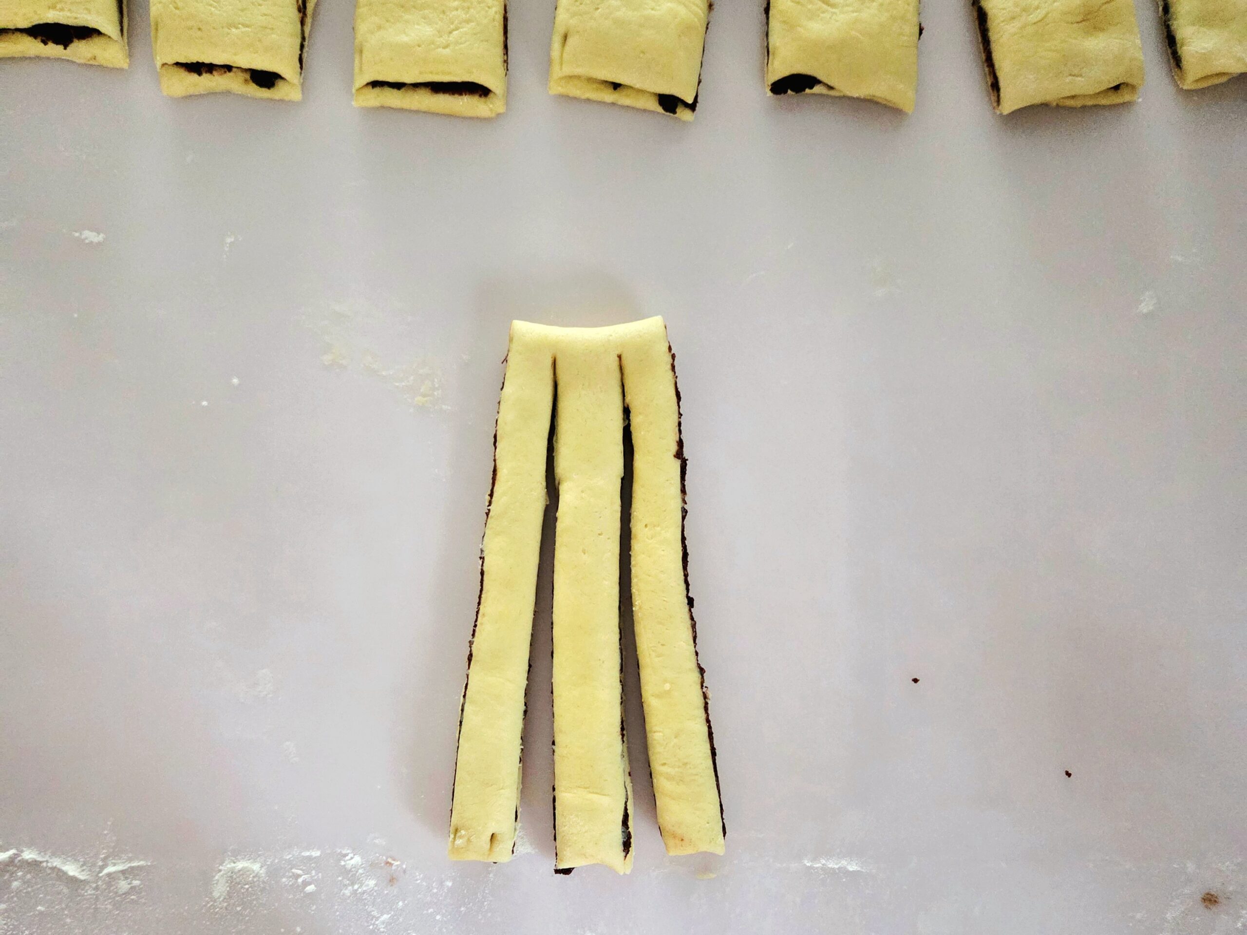 - Take a strip of dough and, using the knife or bench scraper, cut the strip into 3 equal strands. Be sure to cut on the open end, NOT the folded end, and leave about ½ an inch between the top of the strip and the top of the cut strands, so they all stay attached to the folded end.