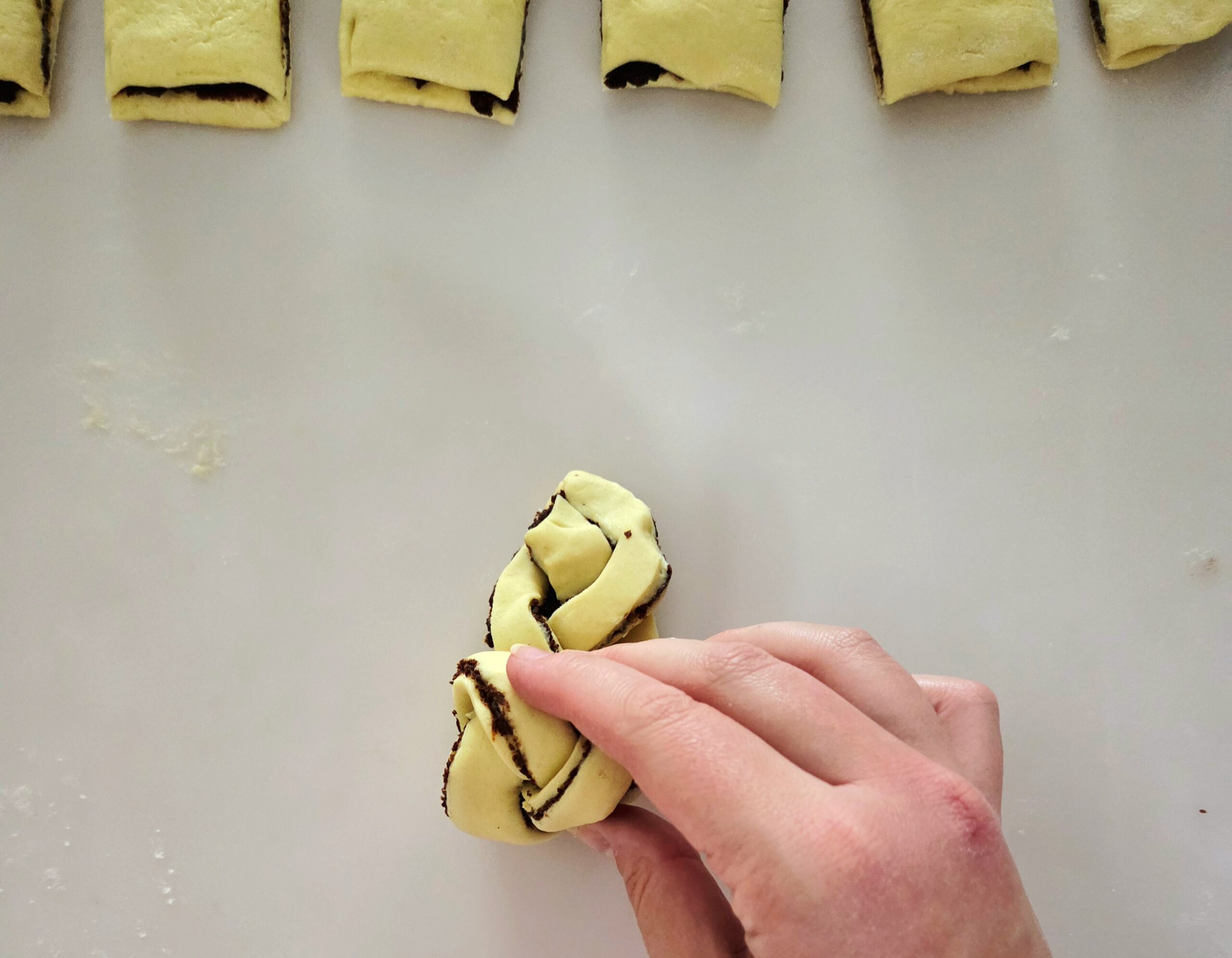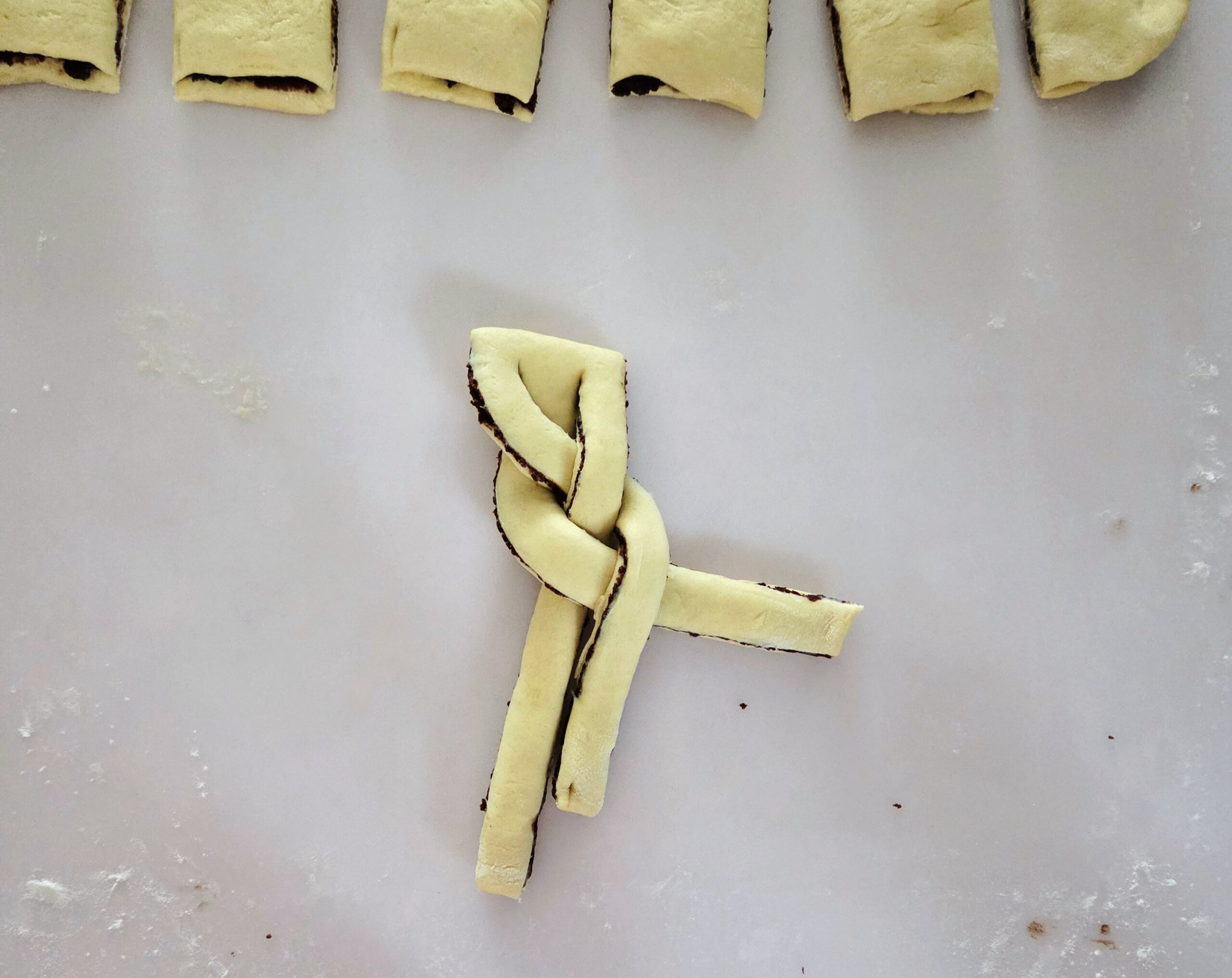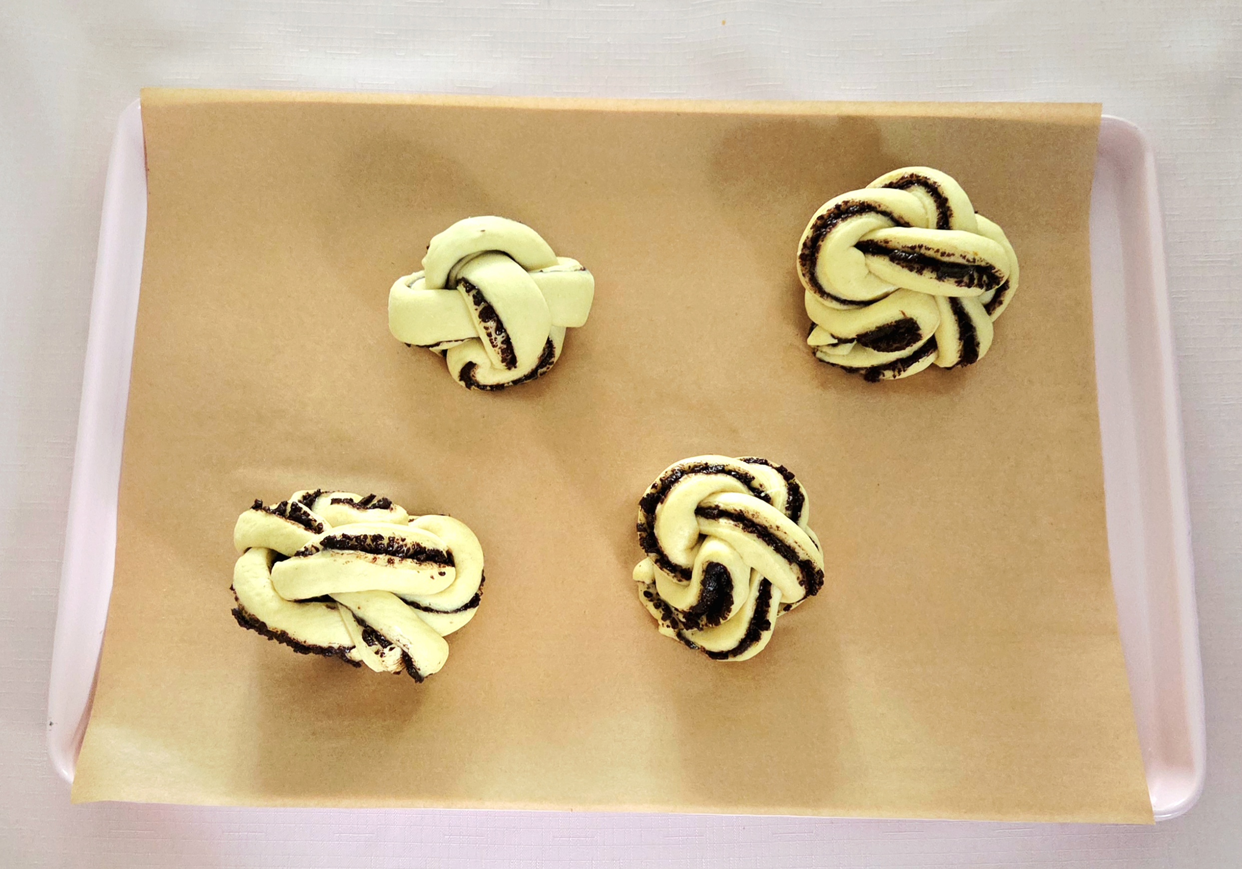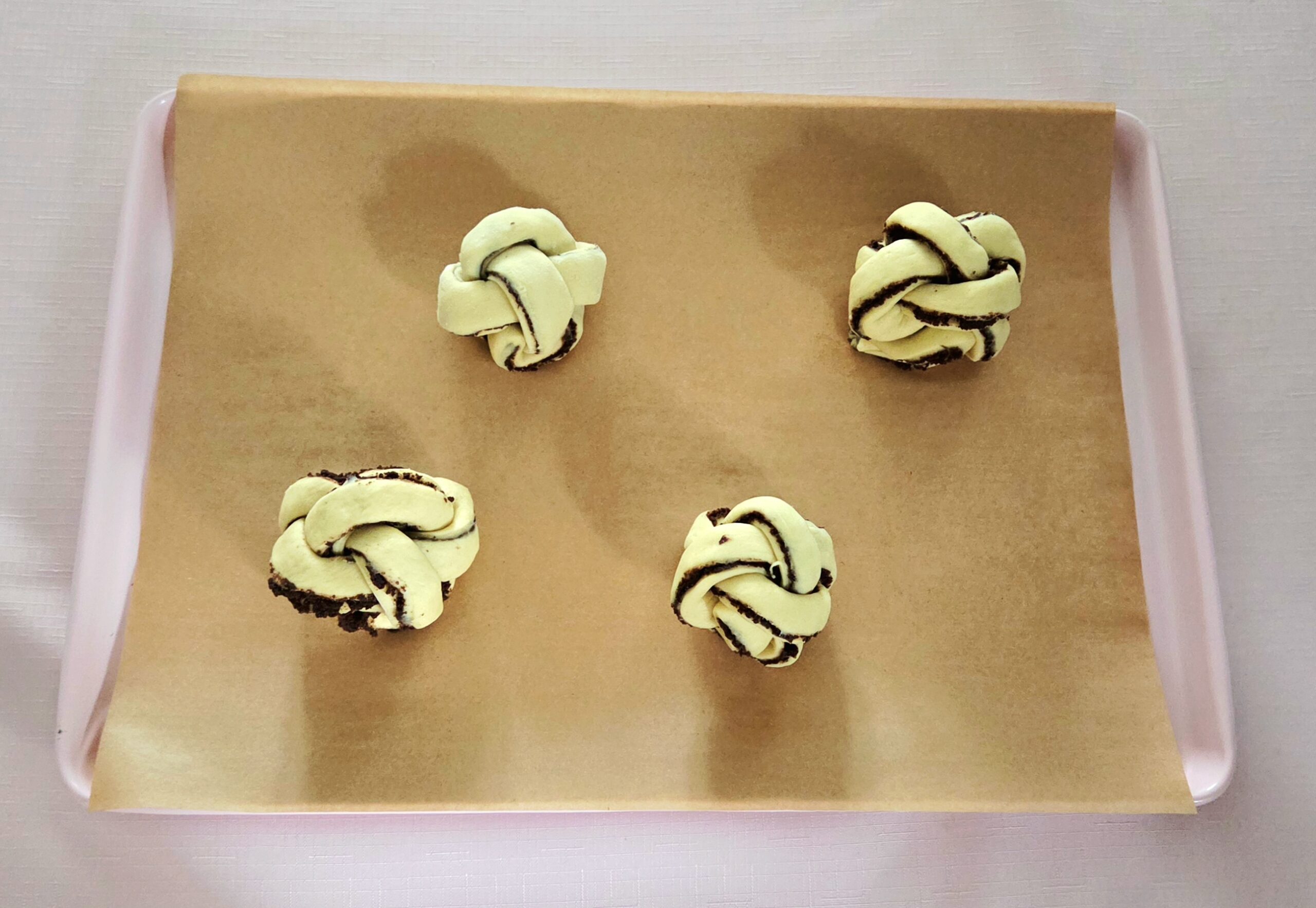 - Take the end of the braid and gently roll it up, leaving the folded end on the bottom of the bun. See reference photos above. Repeat this process with ever strand, placing 4 knots on each baking sheet spaced about 2-3 inches apart.