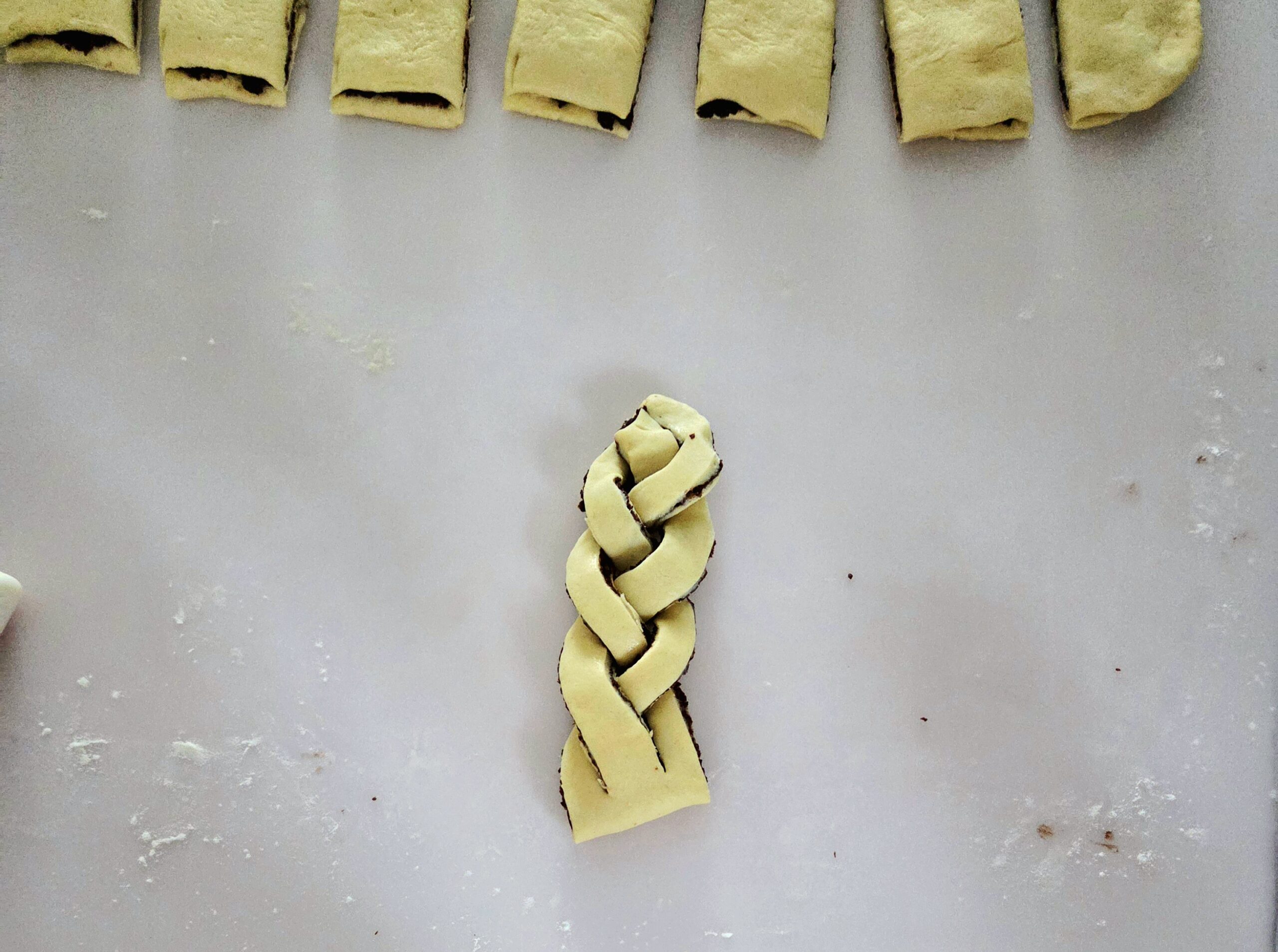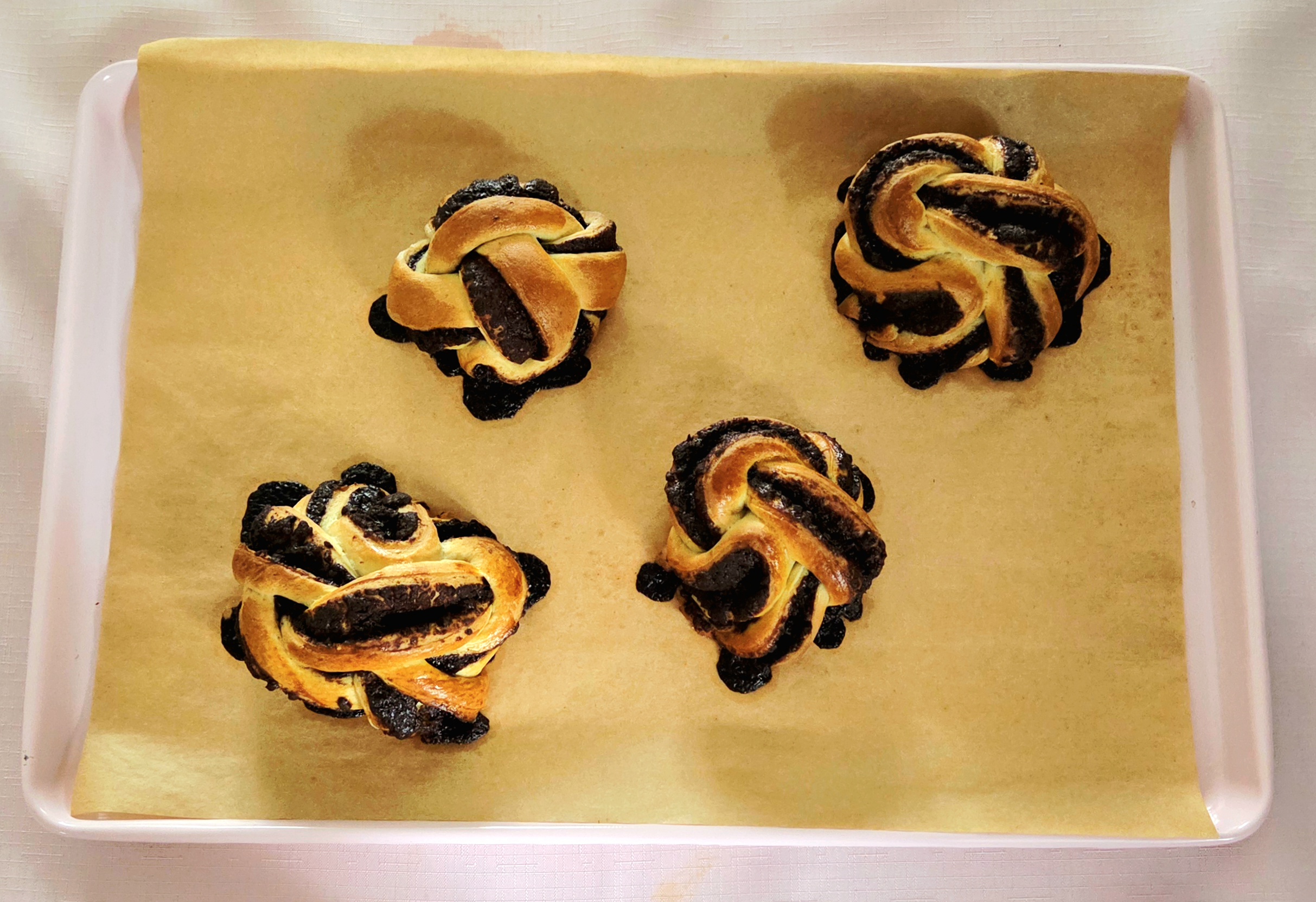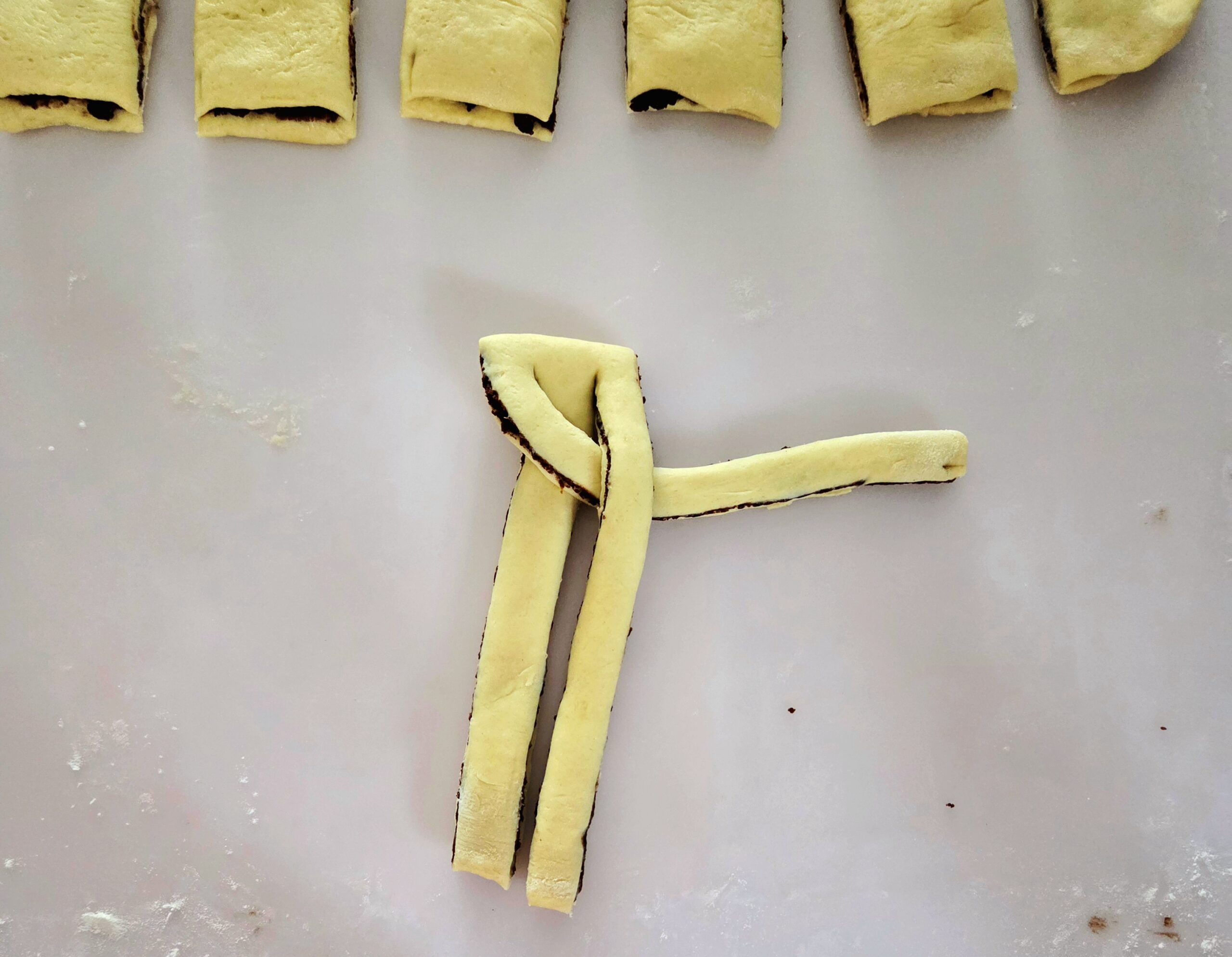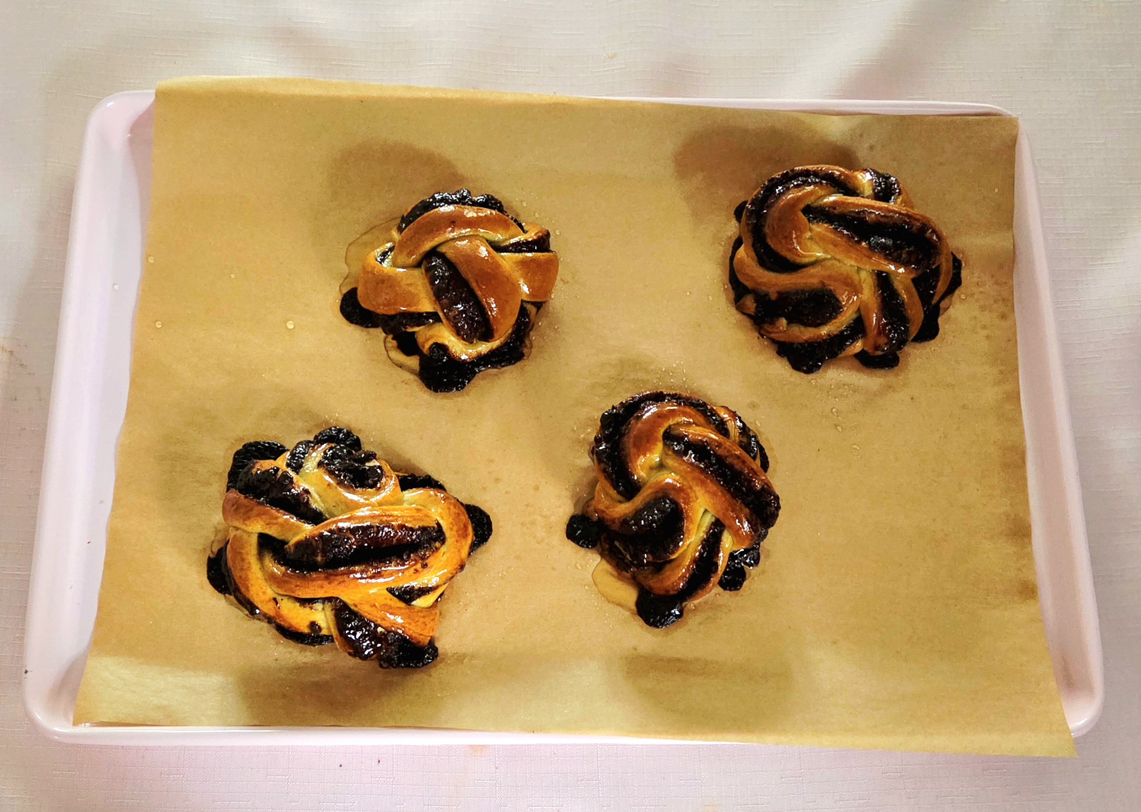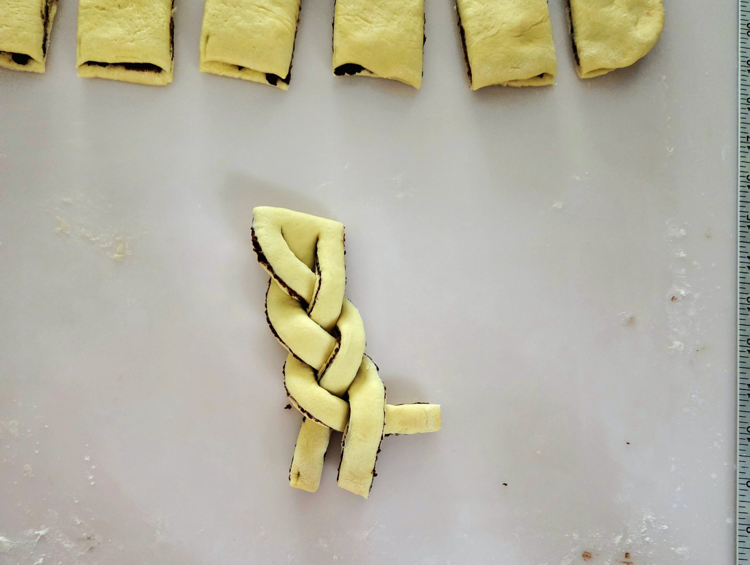 - Take the end of the braid and gently roll it up, leaving the folded end on the bottom of the bun. See reference photos above. Repeat this process with ever strand, placing 4 knots on each baking sheet spaced about 2-3 inches apart.