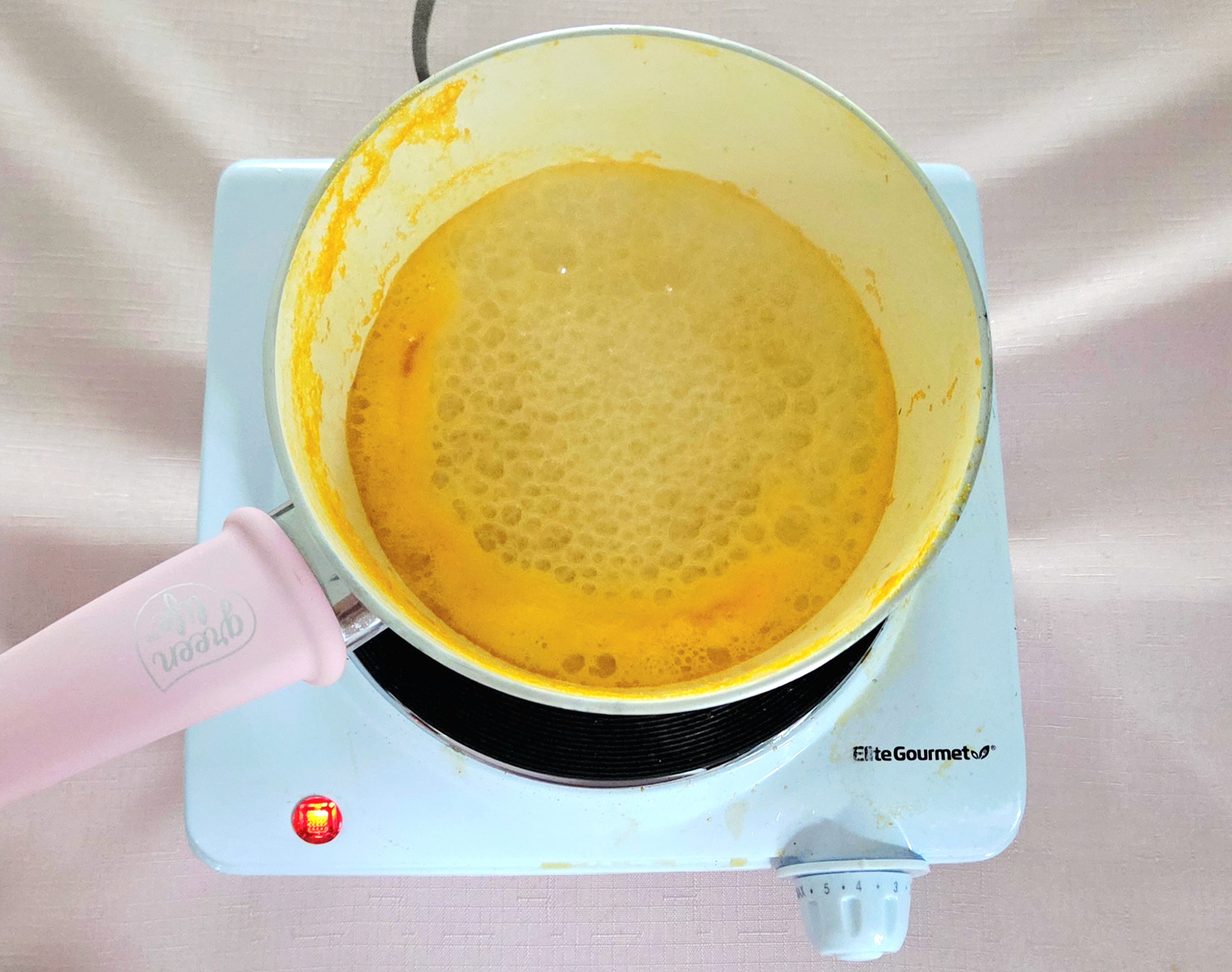 - Pour the juice into a small saucepan and add the sugar to the juice. Gently mix the two together, just until the sugar is wet, and place the pan over medium heat. Bring the mixture to a boil, then immediately remove the pan from the heat. Set it aside and allow it to cool until you need it later on.
