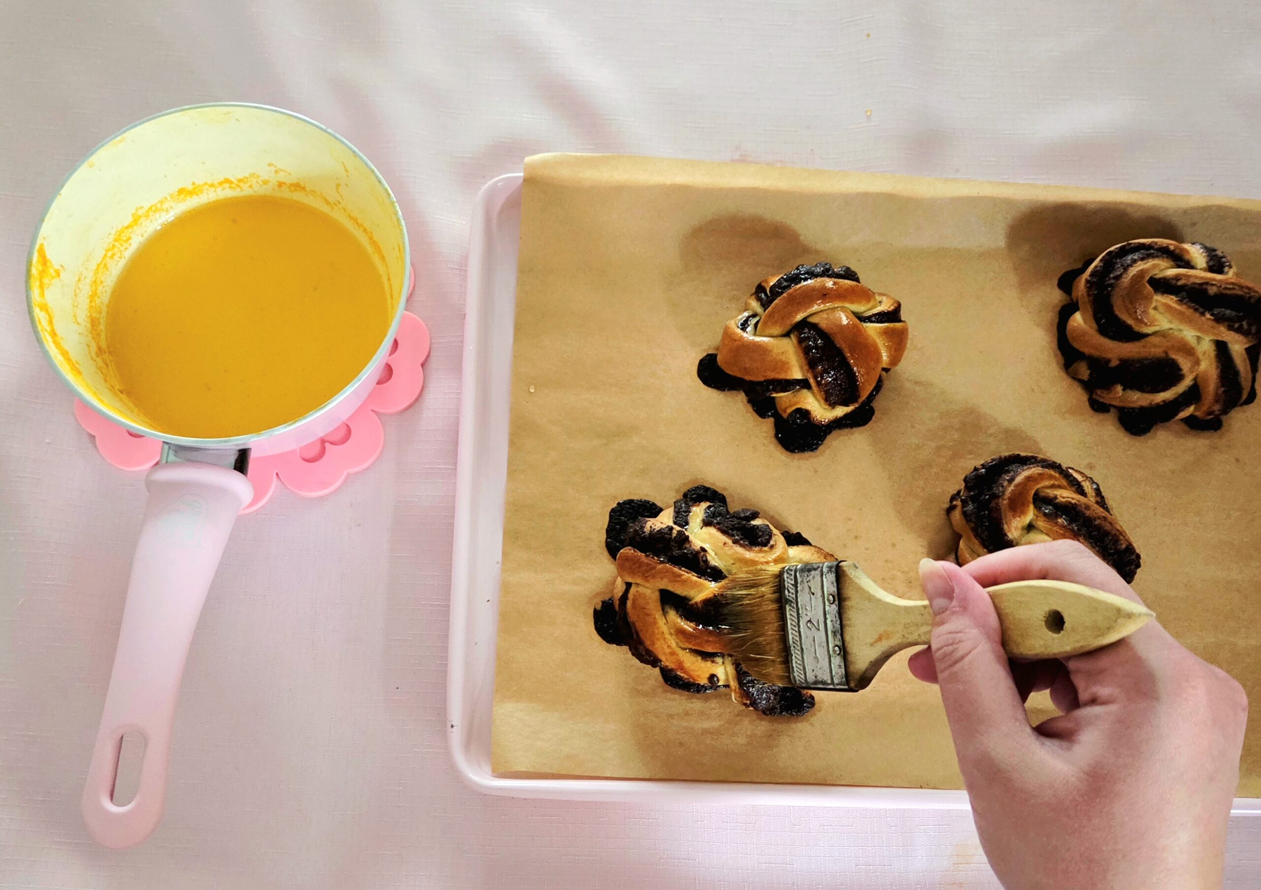 When all of the knots have come out of the oven, using either a pastry brush or a large spoon, coat each knot in a layer of the orange glaze from earlier. Rotate between coating each bun until all of the glaze has been used up, approximately 4 coats per bun. Don’t fret, they wont become soggy. Allow them to cool completely and the glaze to set.