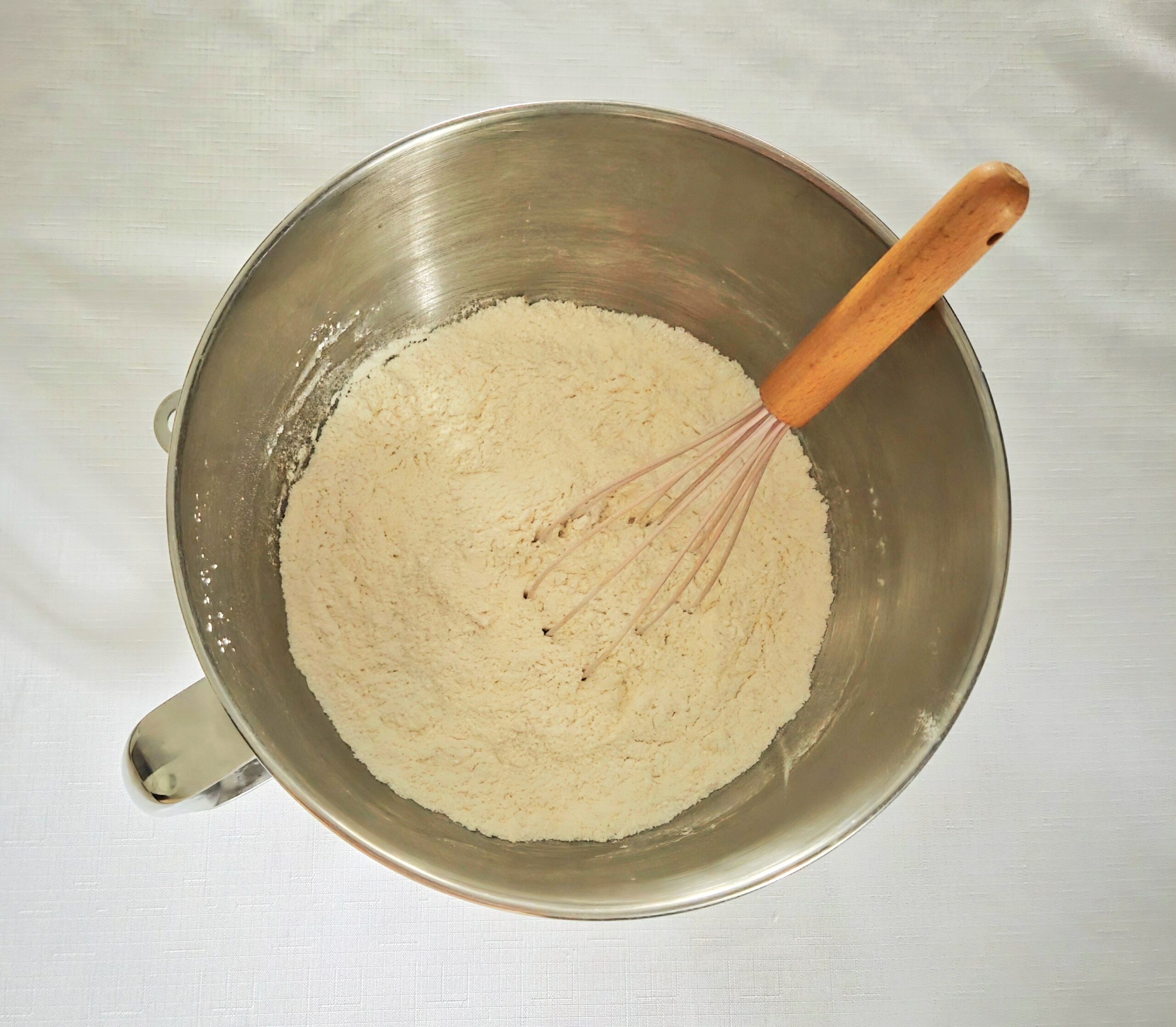 While the berries cool down, prepare the dry goods. In the bowl of a stand mixer, sift the powdered sugar to get all of the lumps out of it. Add in the flour, granulated sugar, and salt, and whisk them together. I know you see many people forgo the whisking of the dry ingredients before combining them with the wet, but I will always feel that is a mistake. Whisking gets out clumps and ensures even distribution of everything, so there wont be any pocket of salt or a bland spot. It’s worth the ten seconds to just whisk it all together. When you’ve finished, set this bowl aside.