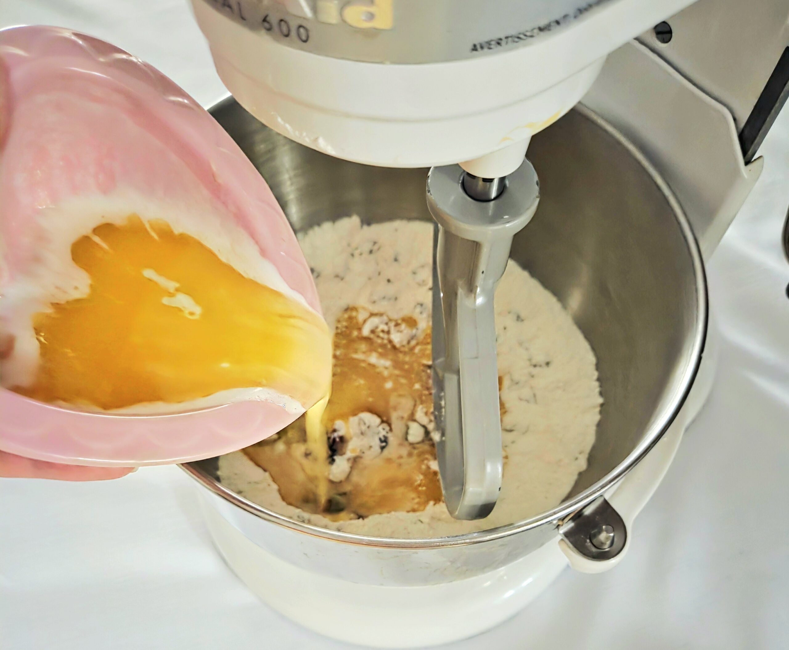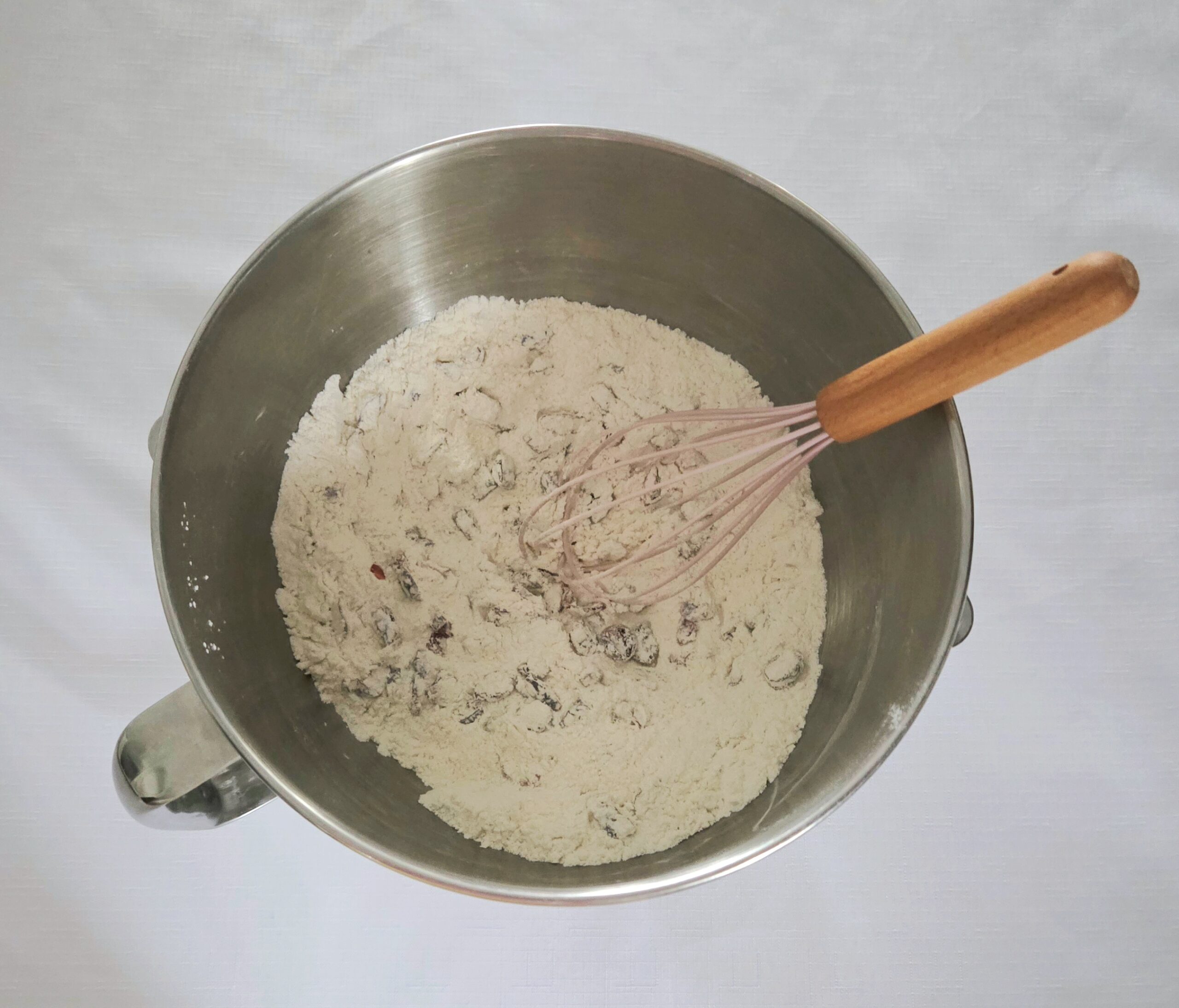 Remove the cranberries from the fridge and pour them into the dry goods. Coating them in the flour first will make it easier to mix them into the dough. Whisk the dry goods to evenly distribute the cranberries, then secure the bowl to the stand mixer and fit it with the paddle attachment.
