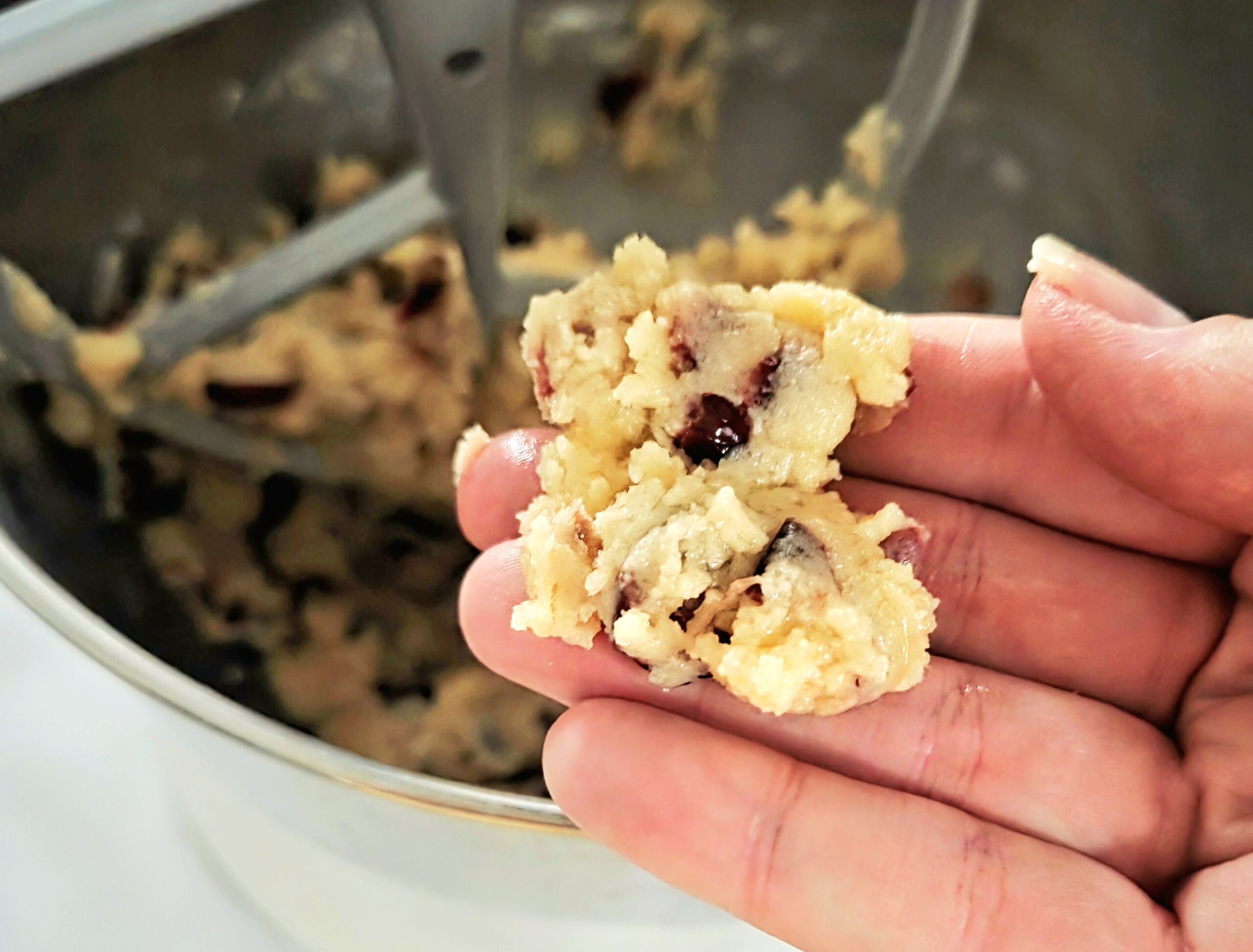 While the dough chills, preheat the oven to 350F, on the convection setting if possible, and prepare the pans. Line two baking sheets with parchment paper or a silicone baking mat, so the cookies will easily release from the pan, and set them aside.