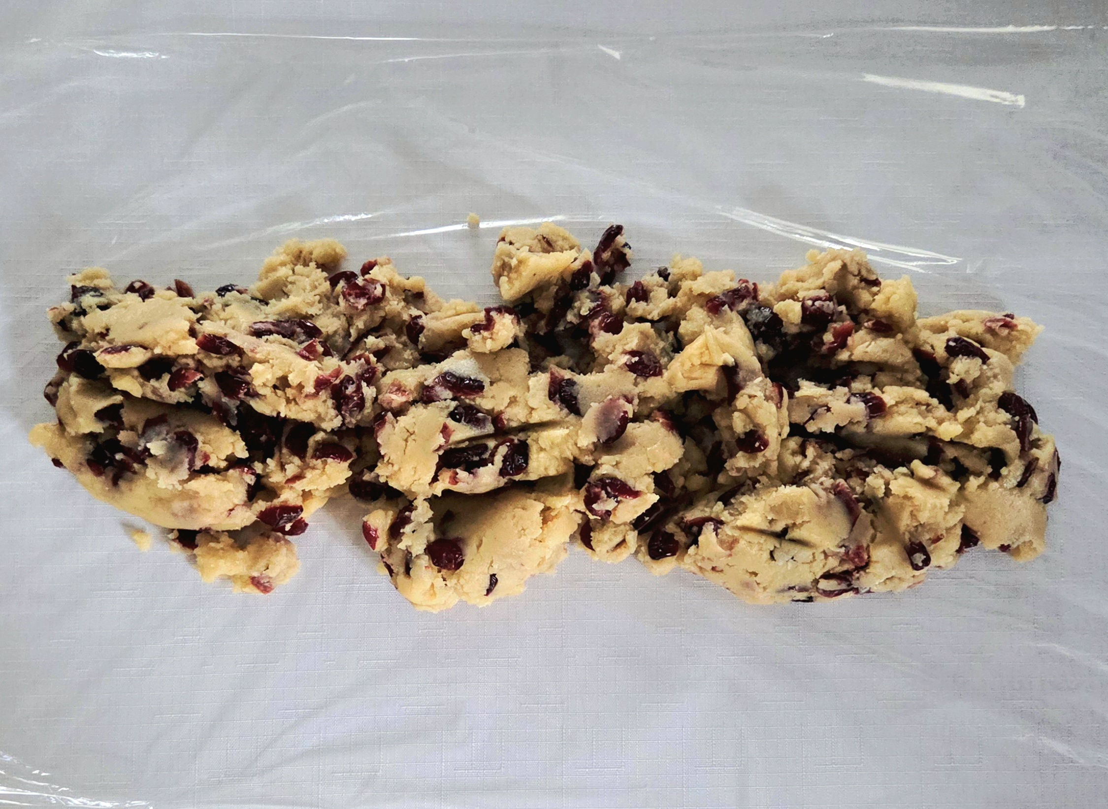 5. Remove the cranberries from the fridge and pour them into the dry goods. Whisk the dry goods to evenly distribute the cranberries, then secure the bowl to the stand mixer and fit it with the paddle attachment. Pour the butter mixture into the bowl of the mixer and turn it to level 3 until a dough forms, leaving no streaks of flour.