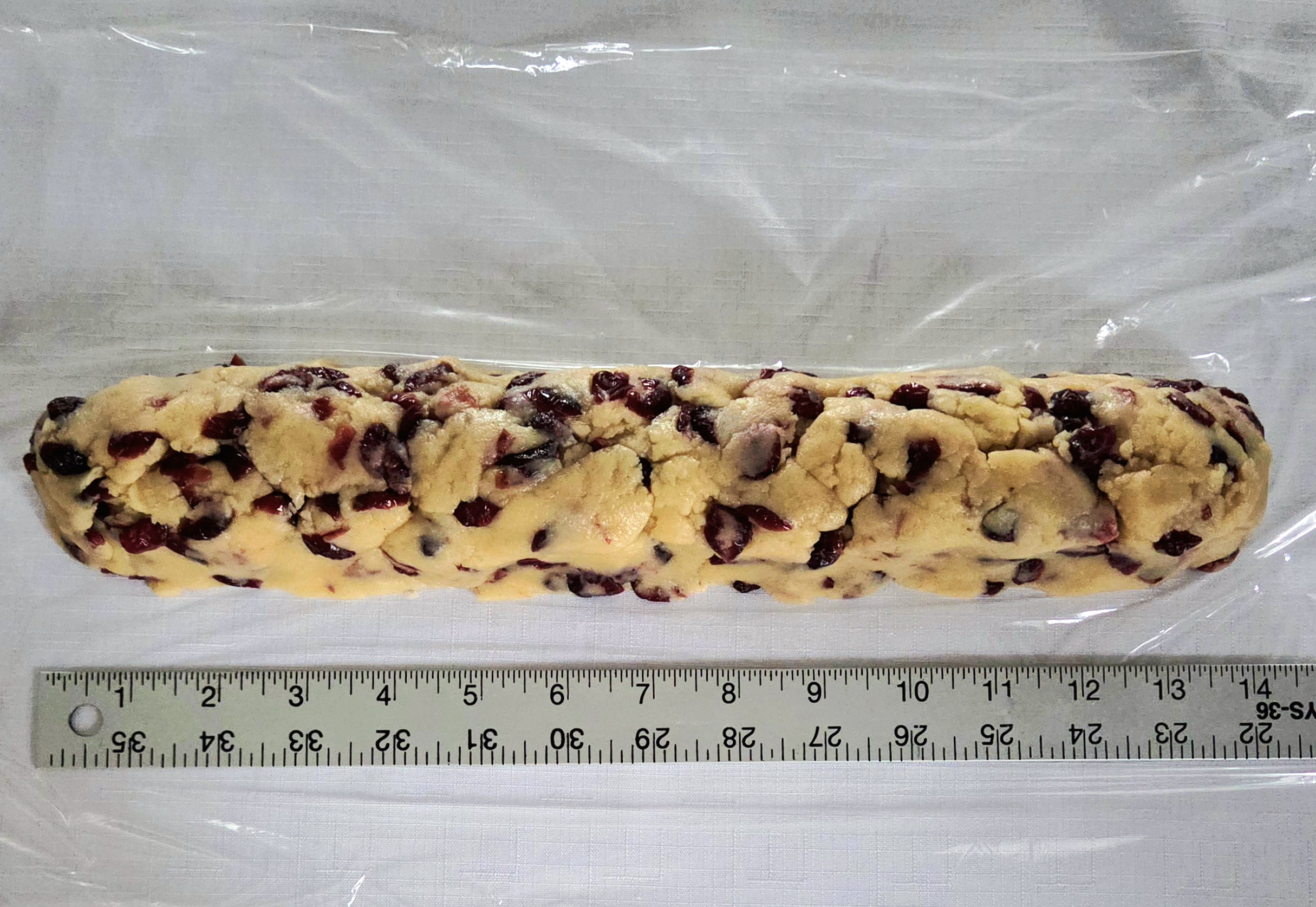 On the counter, place down a large sheet of plastic wrap, measuring 20 inches or so. You want it long enough to create the log, wrap it up, and twist off both ends to secure it. Dump the dough out onto the plastic and press it firmly into a log, approximately 14 inches in length.