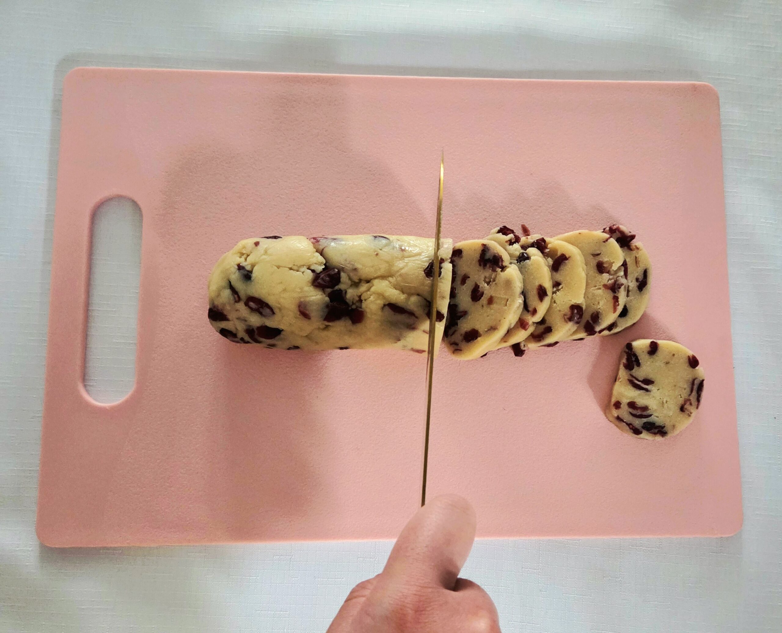 Remove the dough from the fridge. Unwrap it and cut the log in half. Place one half onto a cutting board, then rewrap the second half to return to the fridge until you’re ready for it. The dough just slices much more easily when it’s cold, and it’s easier to keep it cold if you only work with half of it at a time.