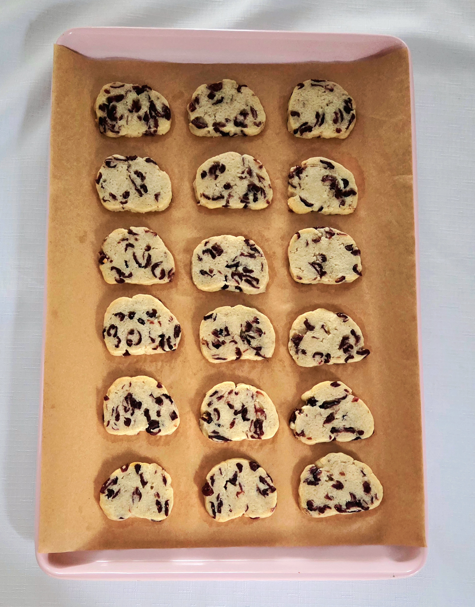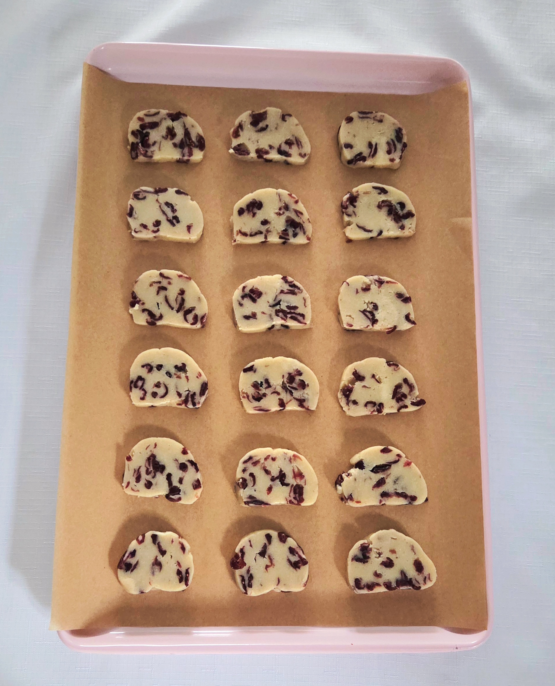 8. Remove the dough from the fridge. Unwrap it and cut the log in half. Place one half onto a cutting board, then rewrap the second half to return to the fridge until you’re ready for it. Using a chef’s knife, slice the dough into ¼ inch discs and transfer them over to one of the lined baking sheets. Space them fairly close together, as this isn’t a dough that spreads. Each sheet should hold around 18 cookies.