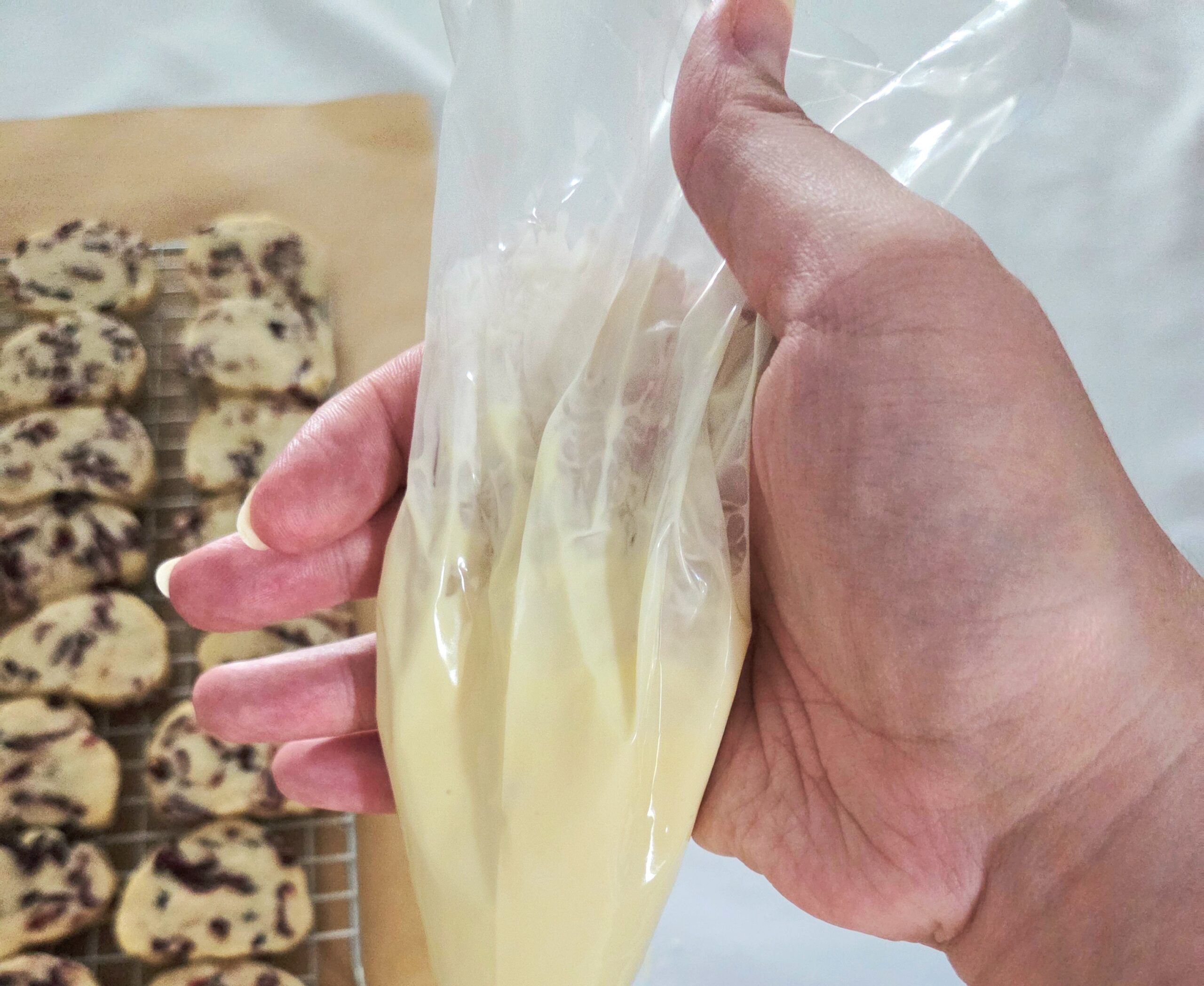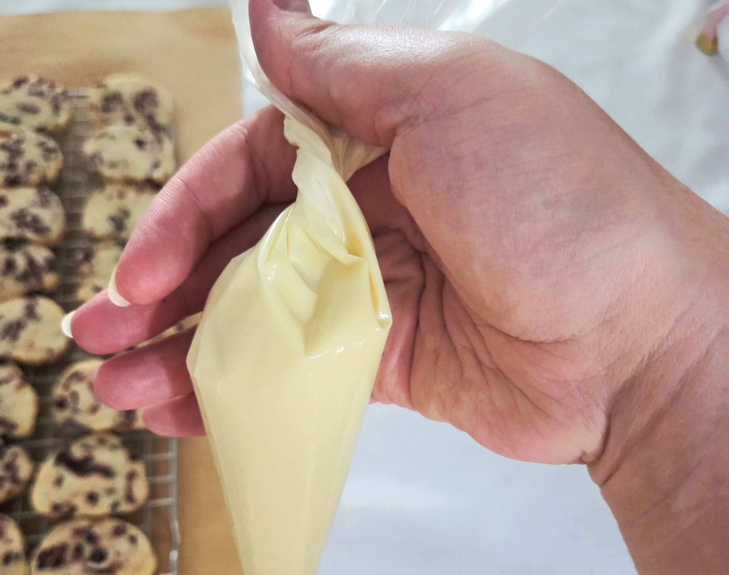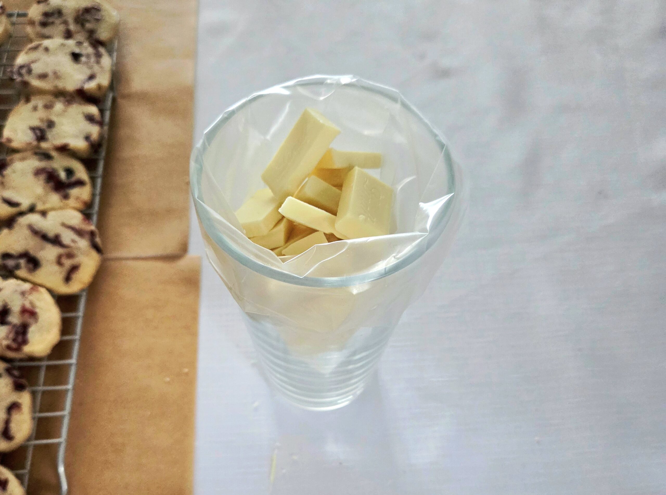 11. Break up the chocolate and put it into either a zip-top bag or a disposable pastry bag. Place it into a heat-safe cup and microwave the chocolate in 30 second intervals, stirring in between. Once it’s completely melted, twist the top of the bag several times and hold it securely between your forefinger and thumb, as shown above.