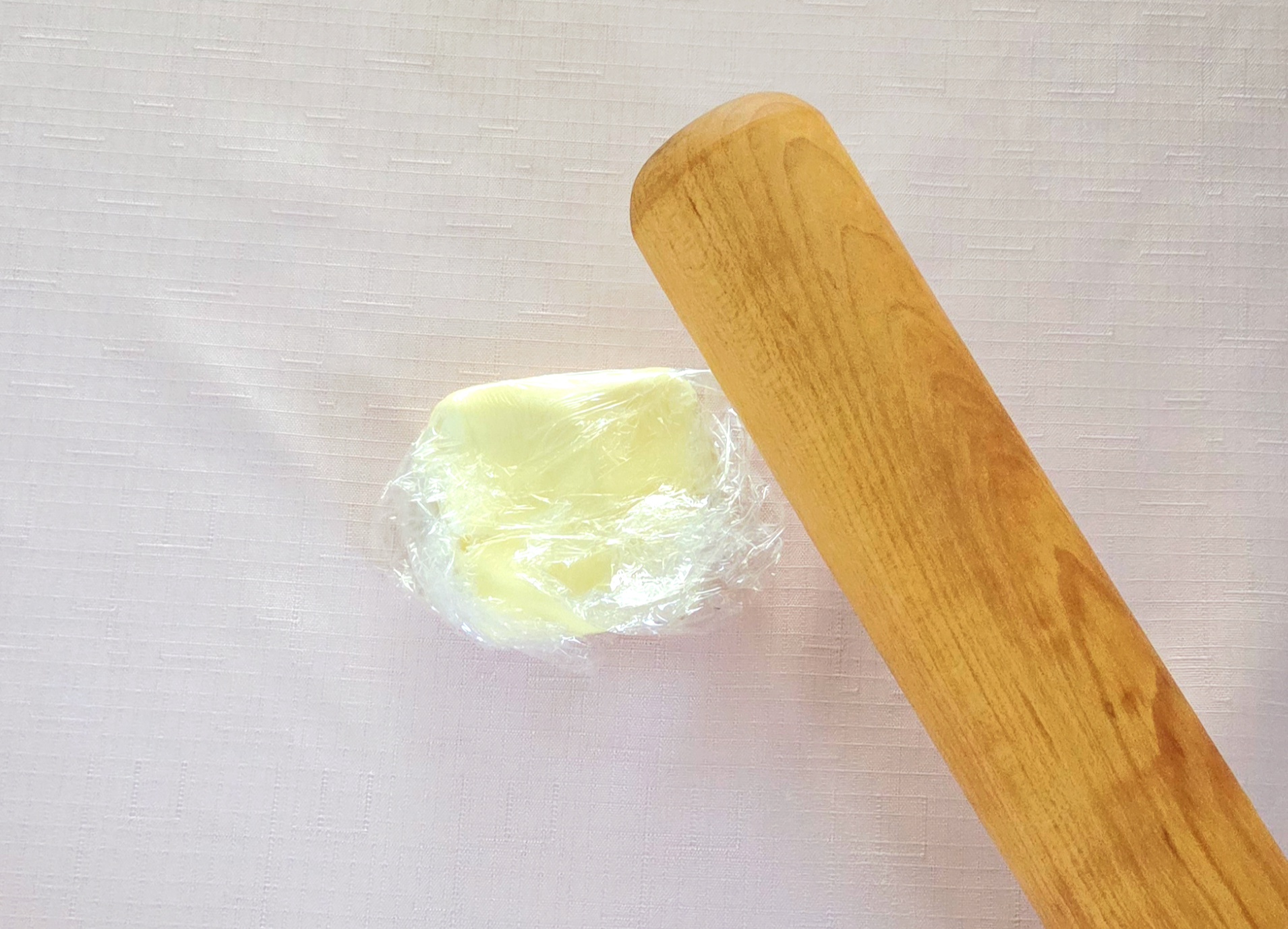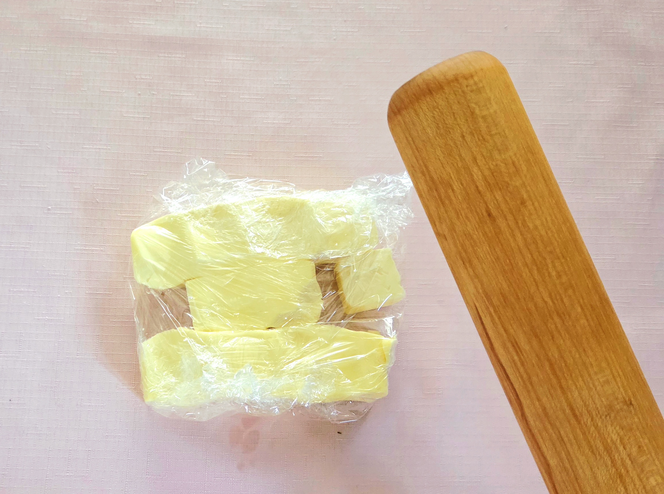 - Take the 3 Tablespoons of butter and gently wrap it entirely in plastic. Take a rolling pin and beat the butter, so it becomes pliable while staying cool. Fold the butter over itself a few times in between pounding it, so the whole thing softens.