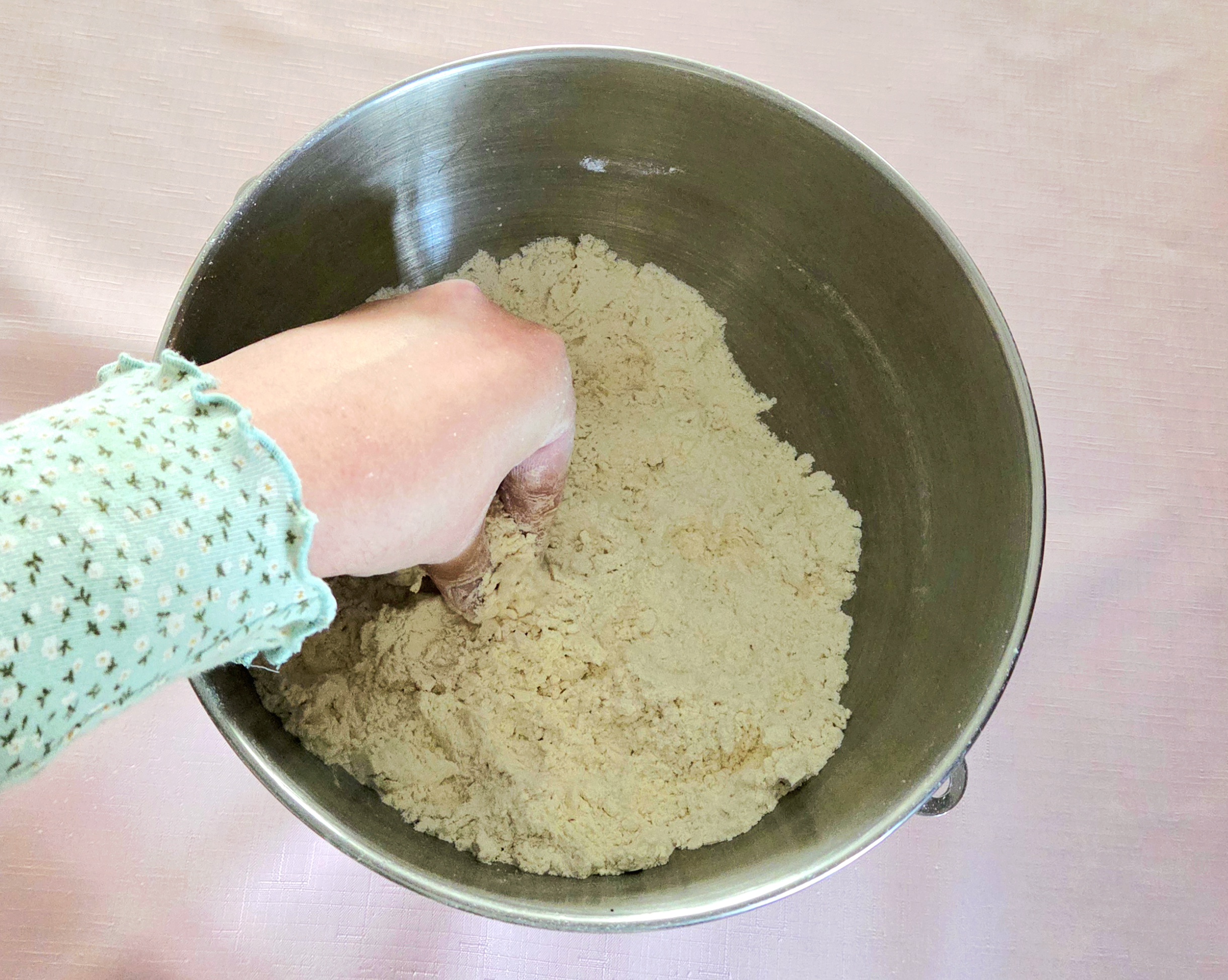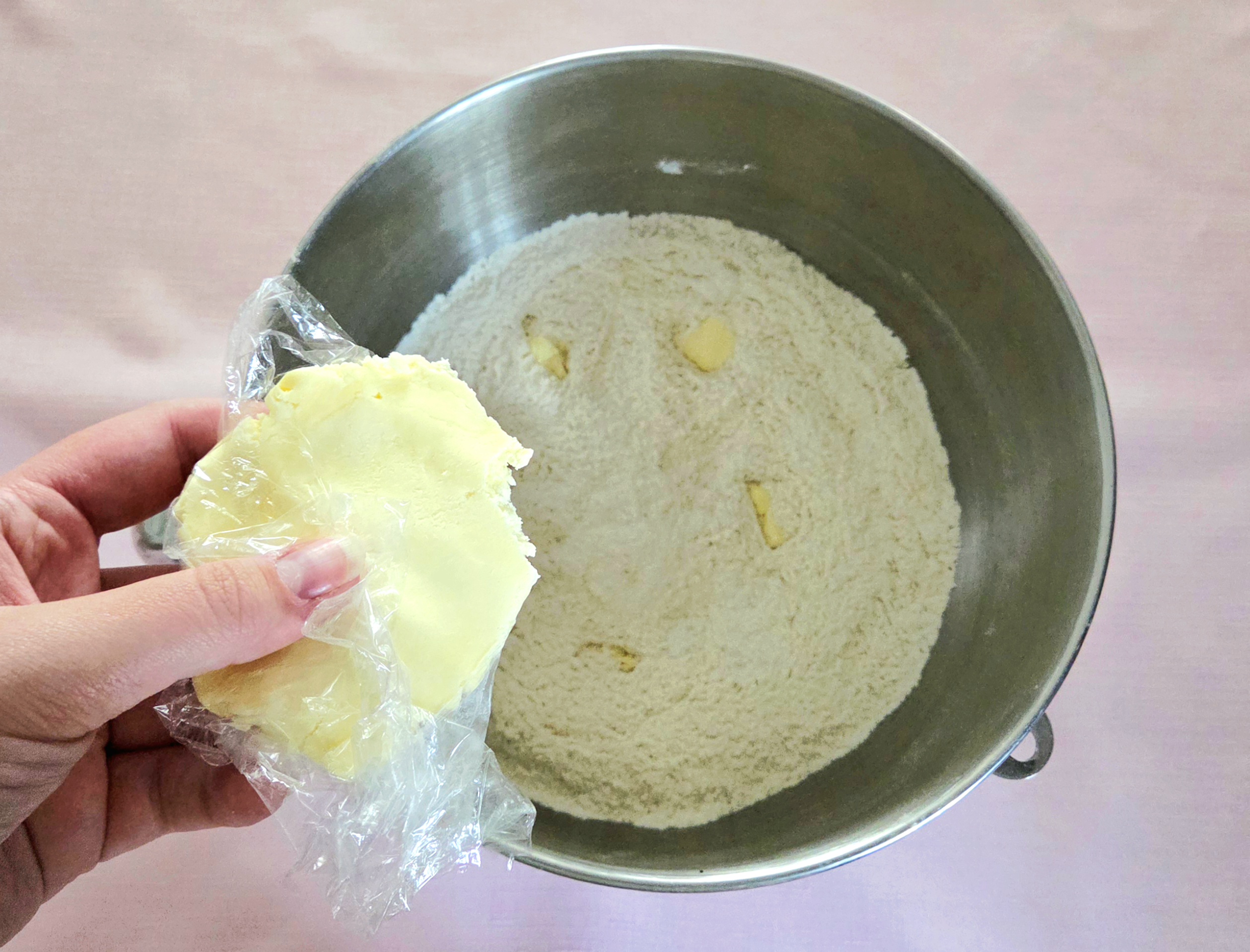 - Pinch off pieces of the butter and drop them into the dry goods. Using the tips of your fingers, massage the butter into the flour until it’s been completely incorporated and the flour mixture has a sandy texture. Set this aside.