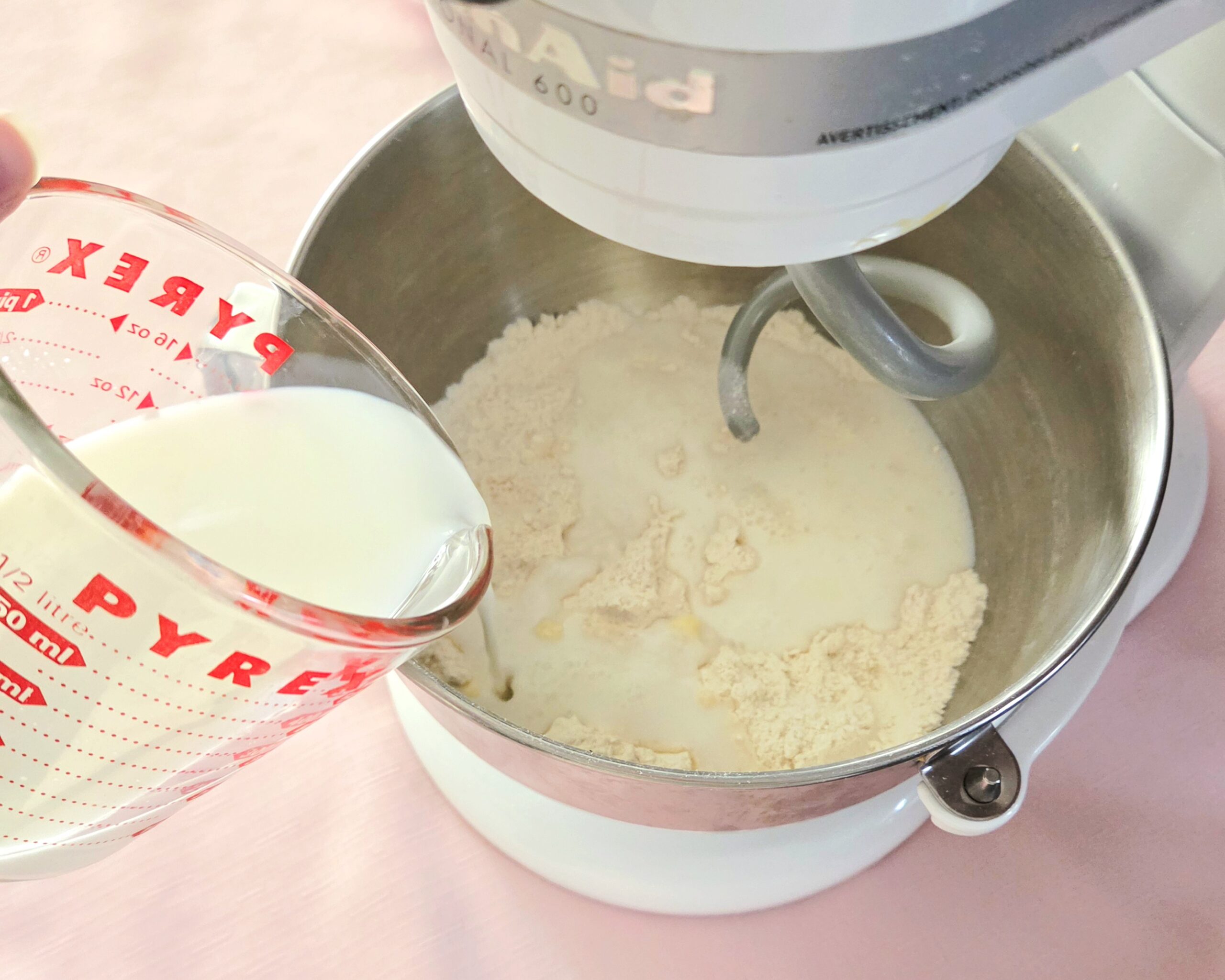 Warm the milk and water together until it’s just warm to the touch, or between 100-110 degrees F. This can be done either in the microwave or on the stovetop. Be sure to stir every so often, to evenly distribute the heat. Pour the liquids into the flour mixture and turn the mixer to level 2 for 5 minutes.