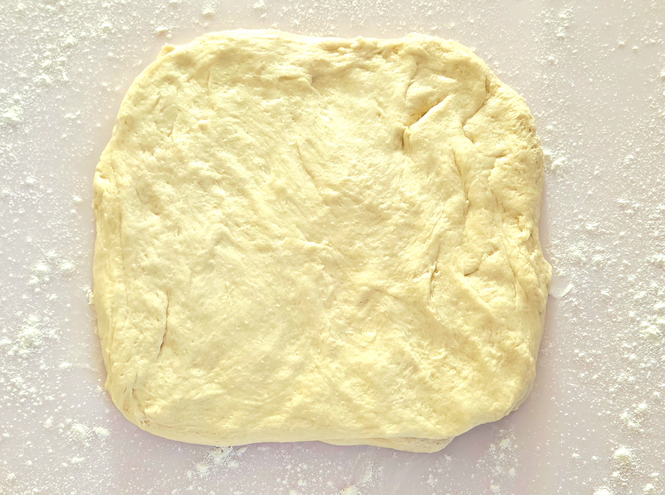 When the dough has finished proofing, dust a clean counter with flour. Place the dough on the flour dusted counter, and sprinkle a bit more flour on top of it. You want just enough flour for it not to stick. With your hands, gently pat the dough into a square.