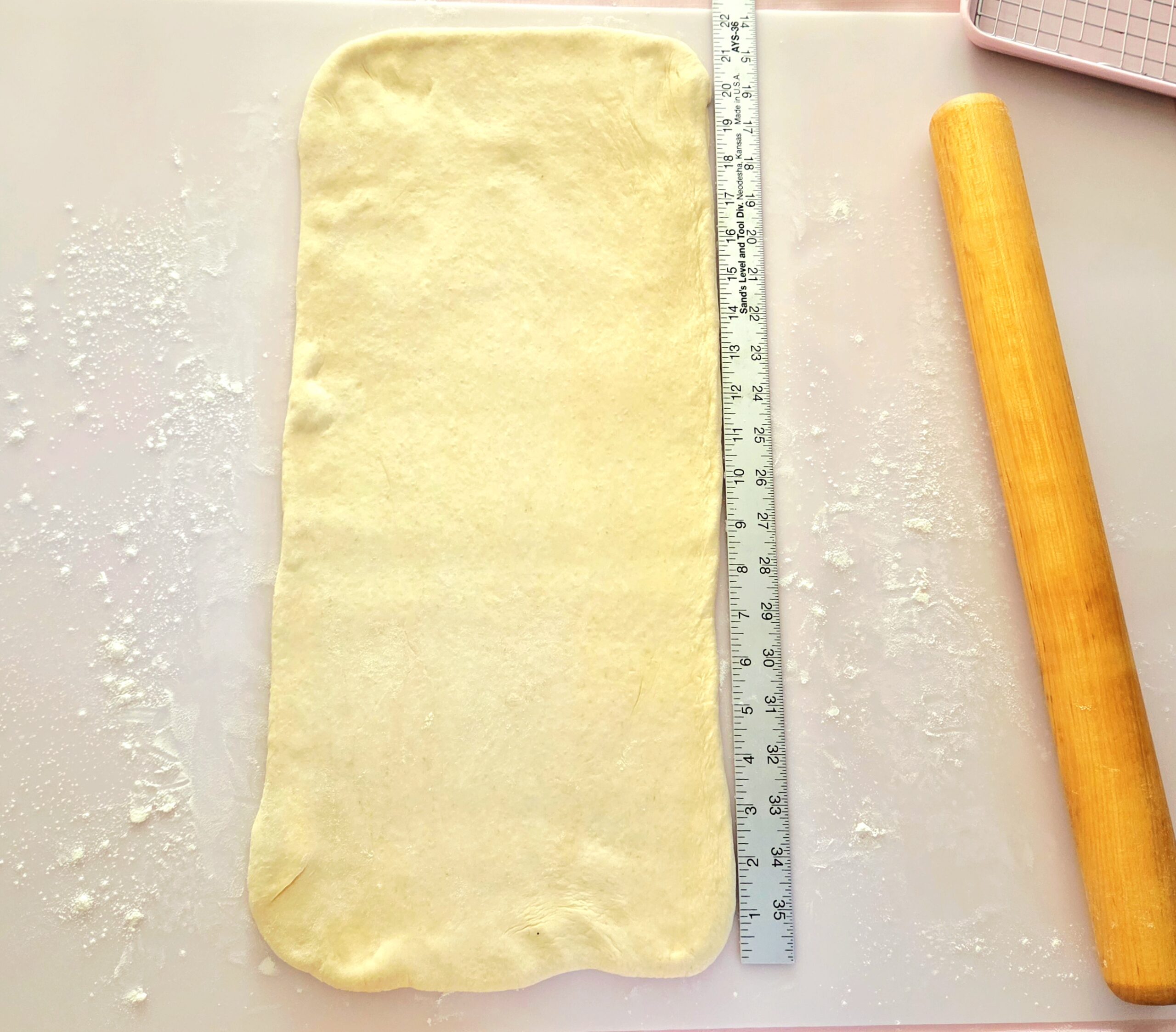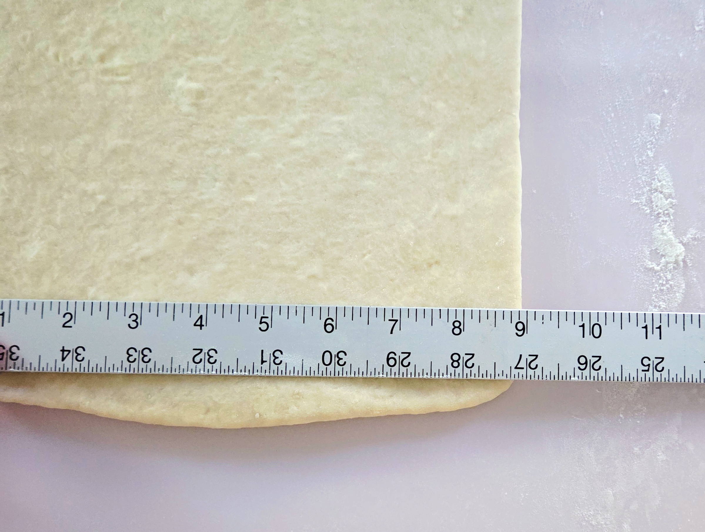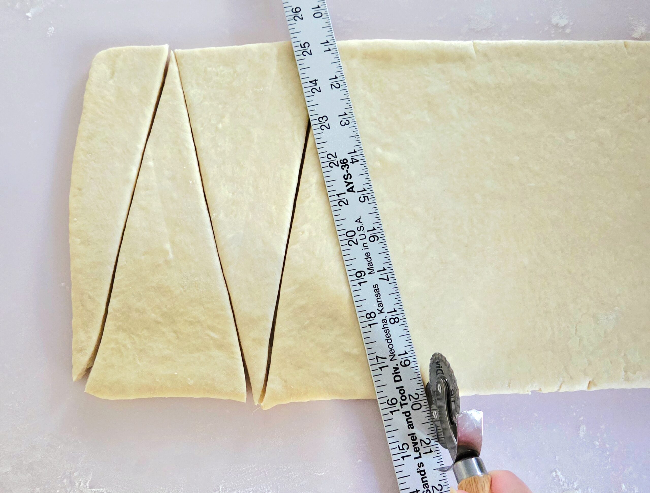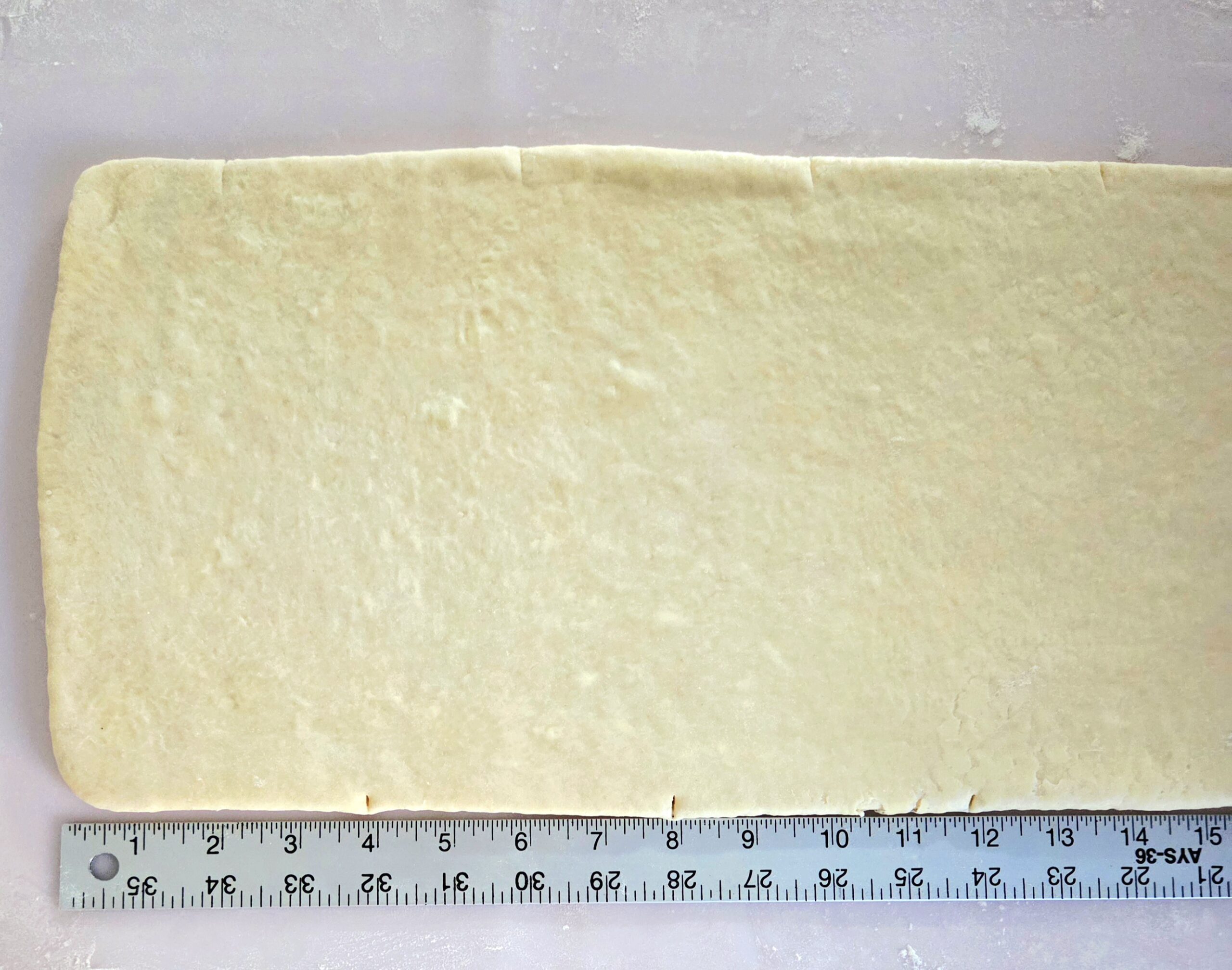 - Turn the oven on to the lowest temperature it will go to. Place the dough onto a clean, flour-dusted counter. Roll the dough into a 9 x 26 inch rectangle. Using a ruler, mark off every 4 inches along the long edge of the dough using a paring knife. One end of the rectangle should only measure 2 inches from the last mark.