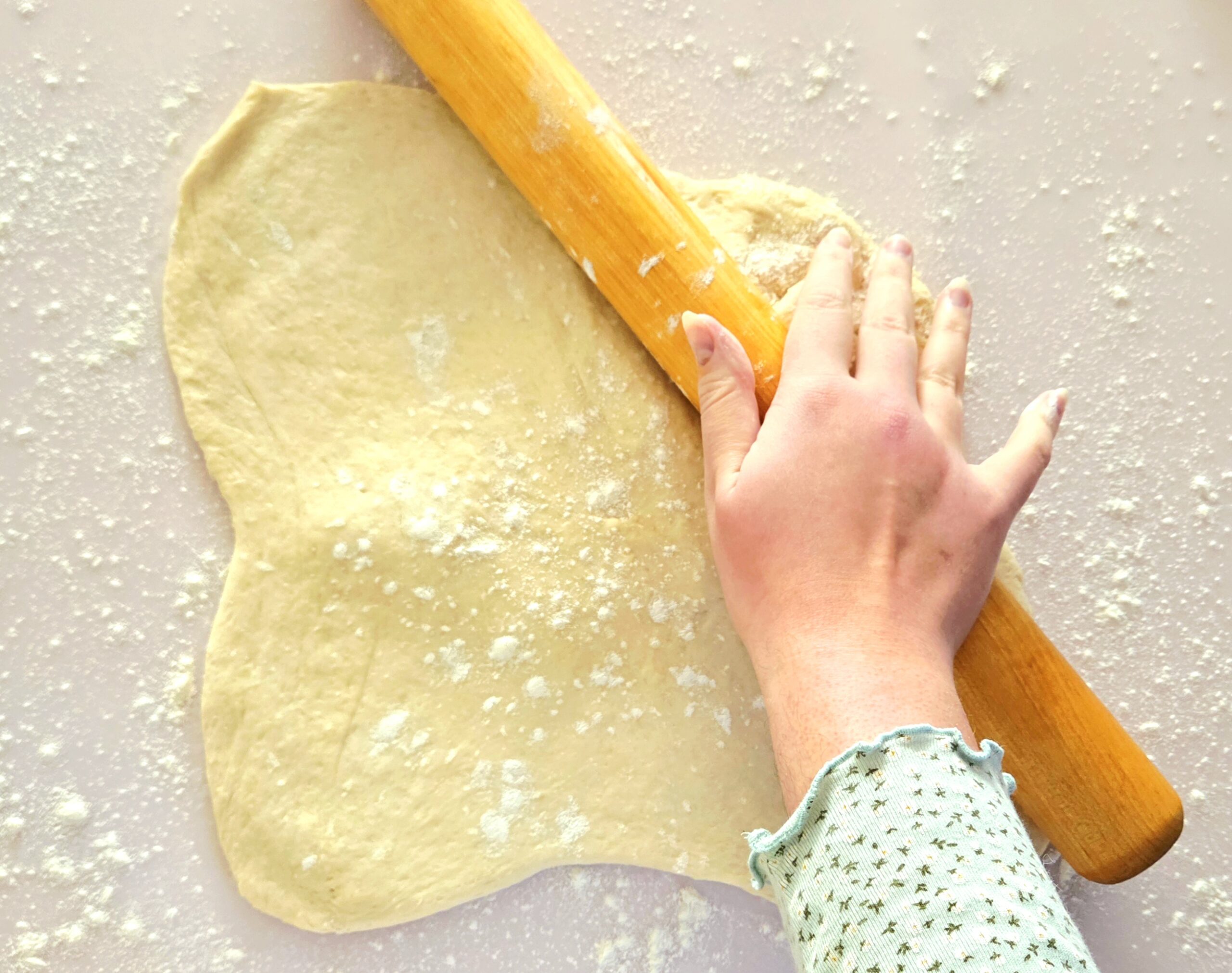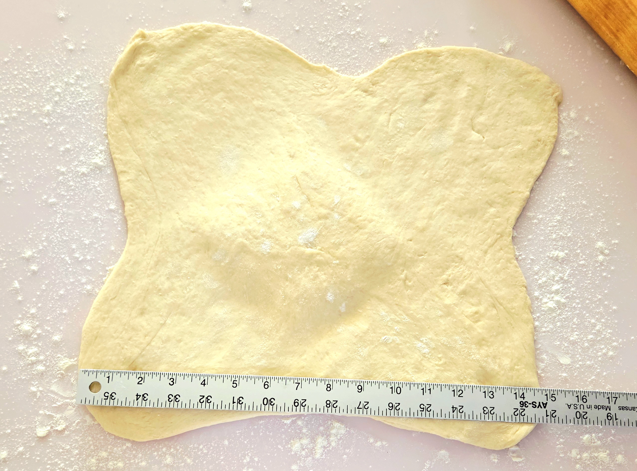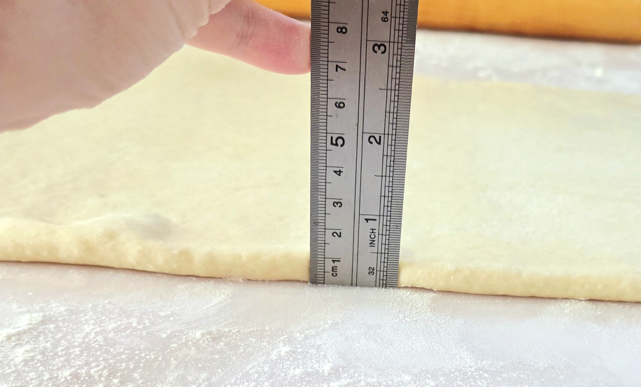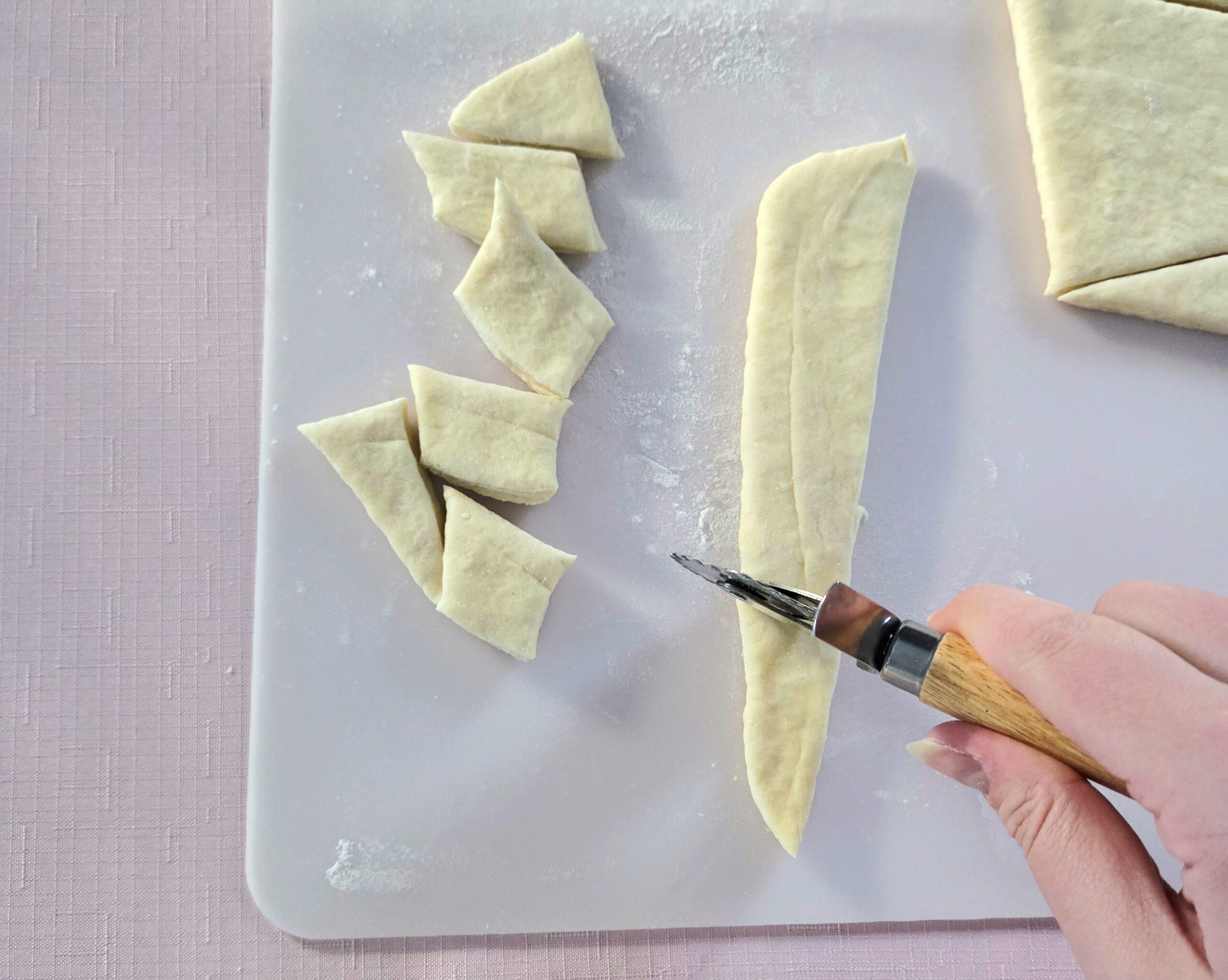- Turn the oven on to the lowest temperature it will go to. Place the dough onto a clean, flour-dusted counter. Roll the dough into a 9 x 26 inch rectangle. Using a ruler, mark off every 4 inches along the long edge of the dough using a paring knife. One end of the rectangle should only measure 2 inches from the last mark.