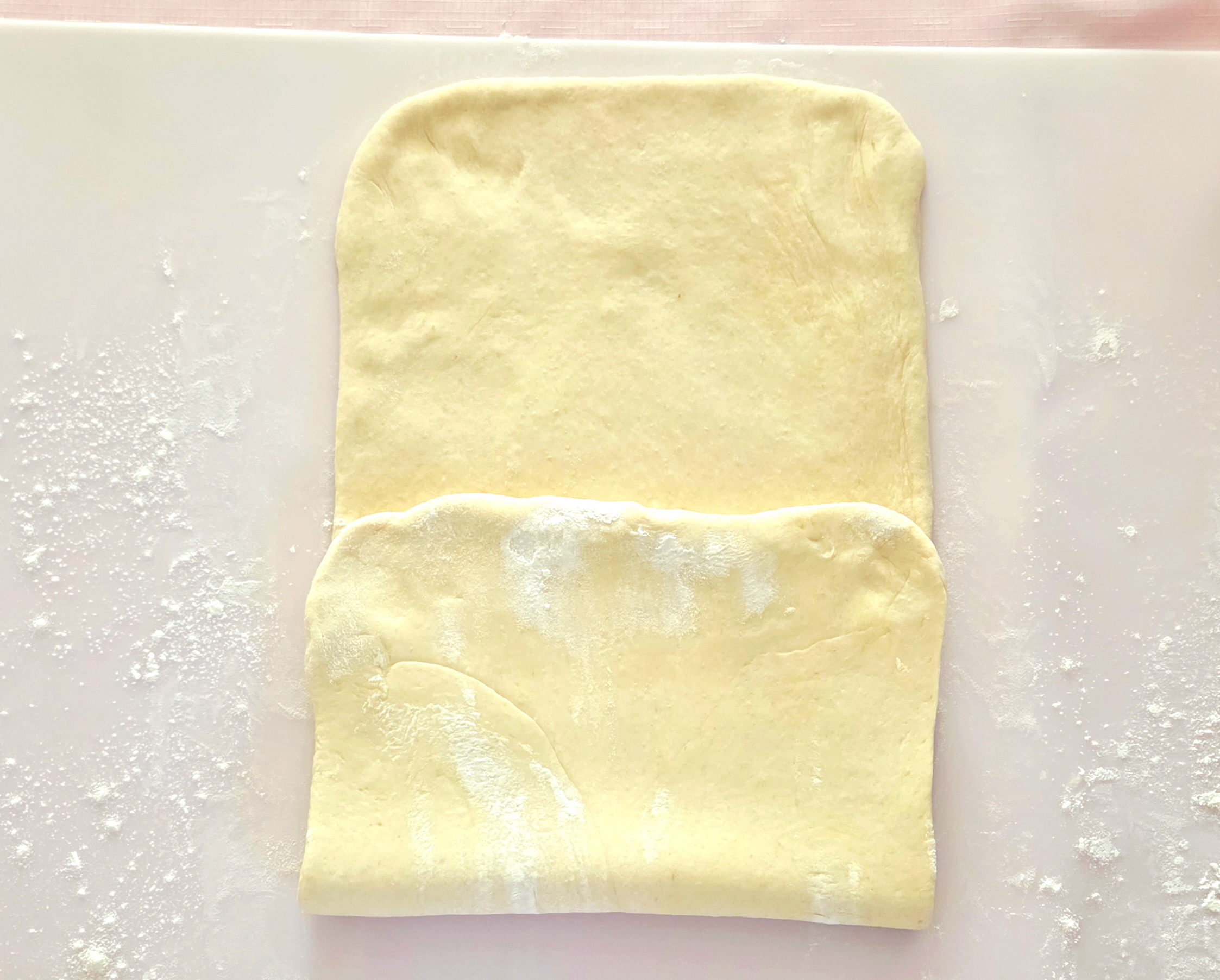 After the dough has finished resting, dust the counter with a bit more flour and place it so the folded end is on the side.