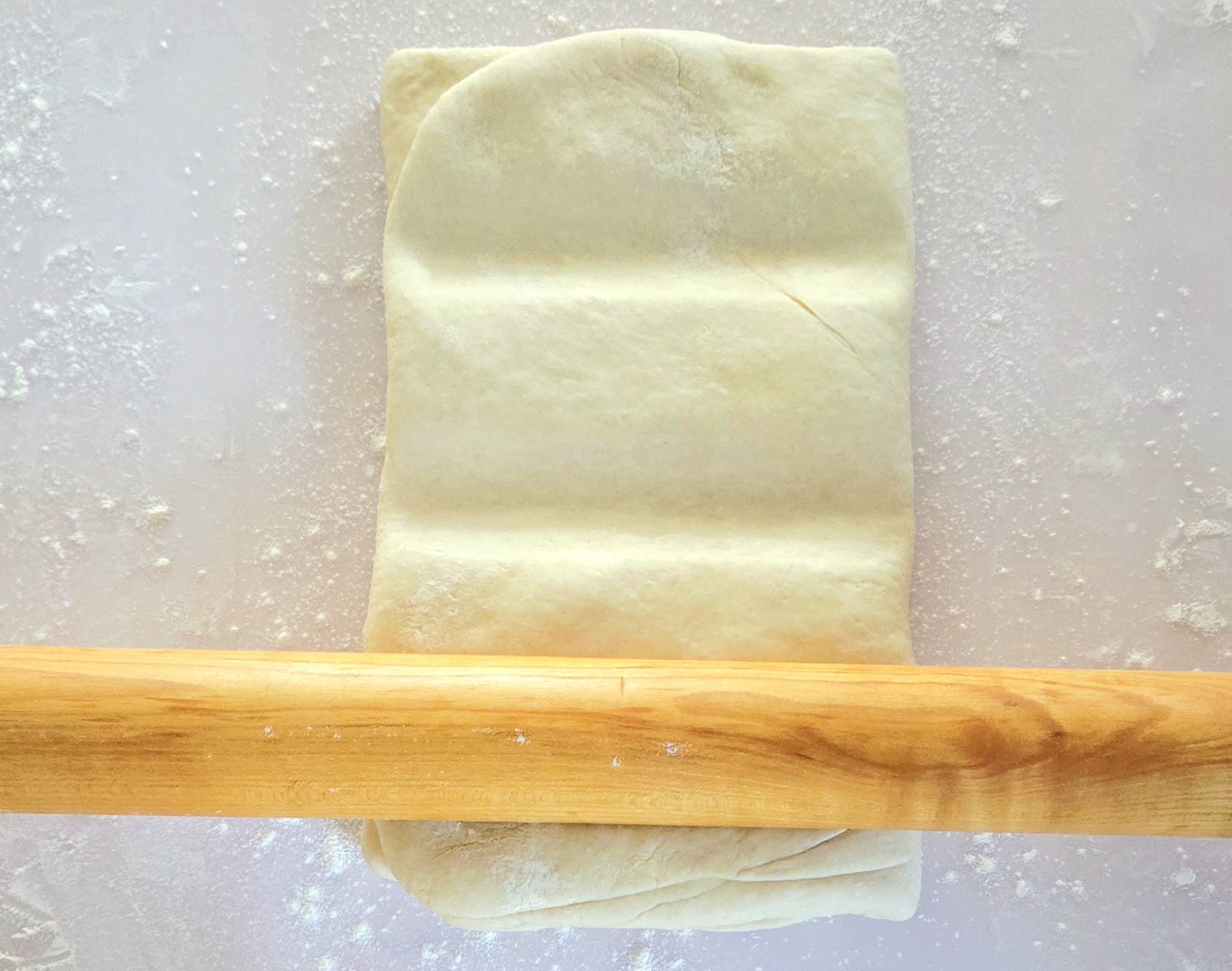 - After the dough has finished resting, dust the counter with a bit more flour and place it so the folded end is on the side, as shown above. Allow the dough to sit out for a few minutes, then gently create two indents a few inches apart in the pâton using the rolling pin. Roll the bulging dough in between the indents to flatten them, and roll out the pâton into a ⅜ inch thick rectangle again. Fold it into thirds again, wrap it airtight, and stick it back in the fridge for 30 minutes.