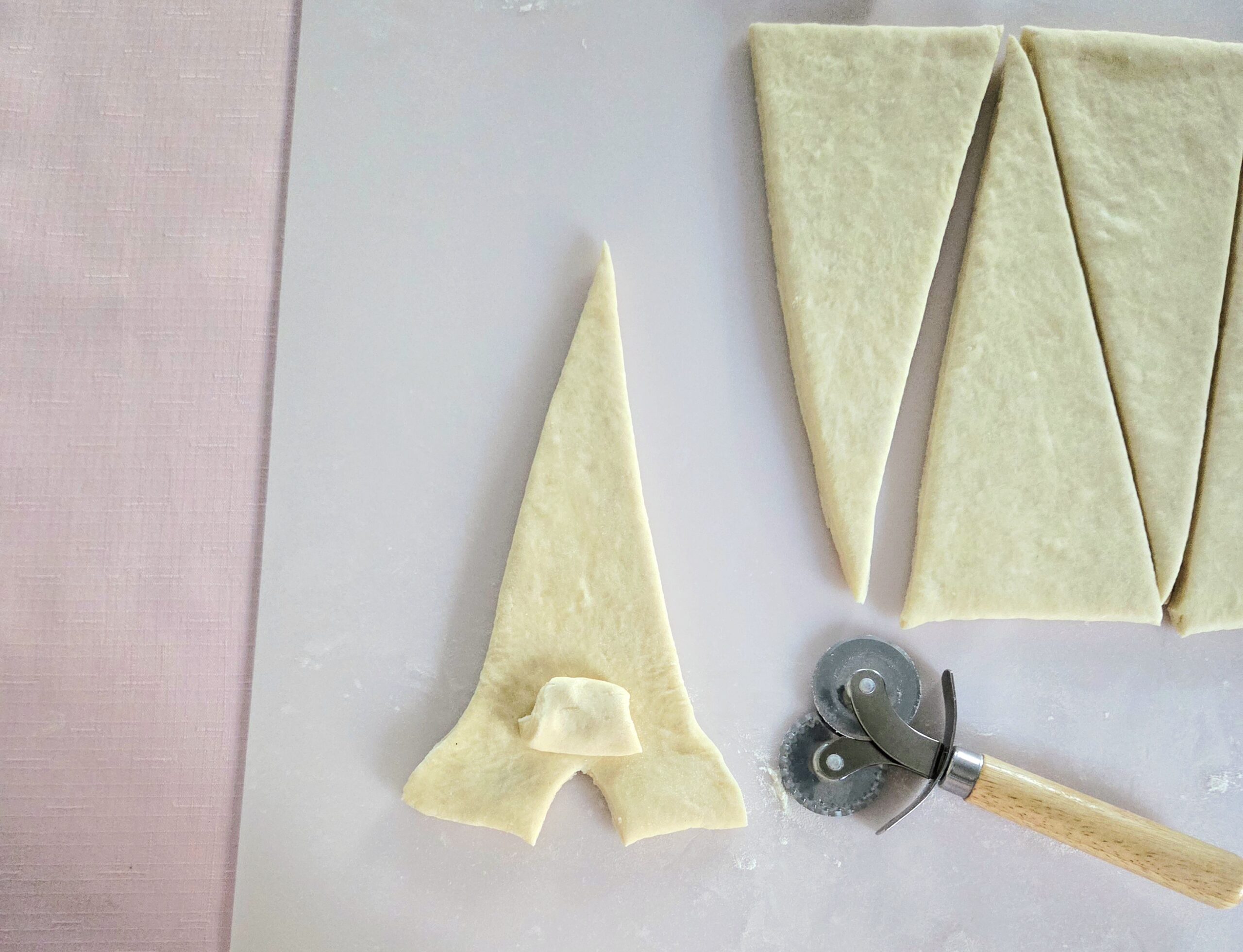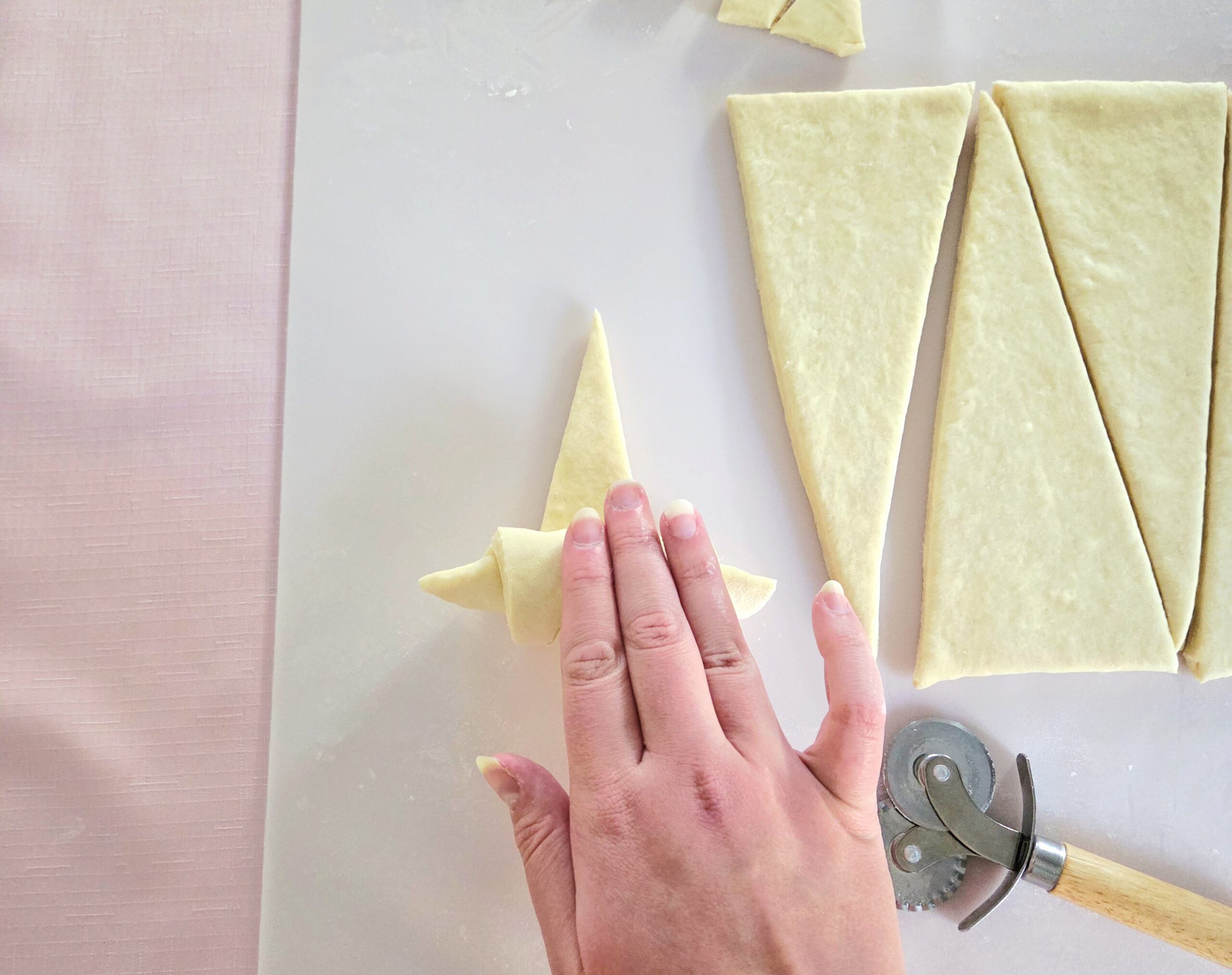 Starting at that edge, roll up the triangle, making sure the pointed end is tucked underneath the body of the croissant. Place it on one of the lined baking sheets, shaping into a crescent if desired.
