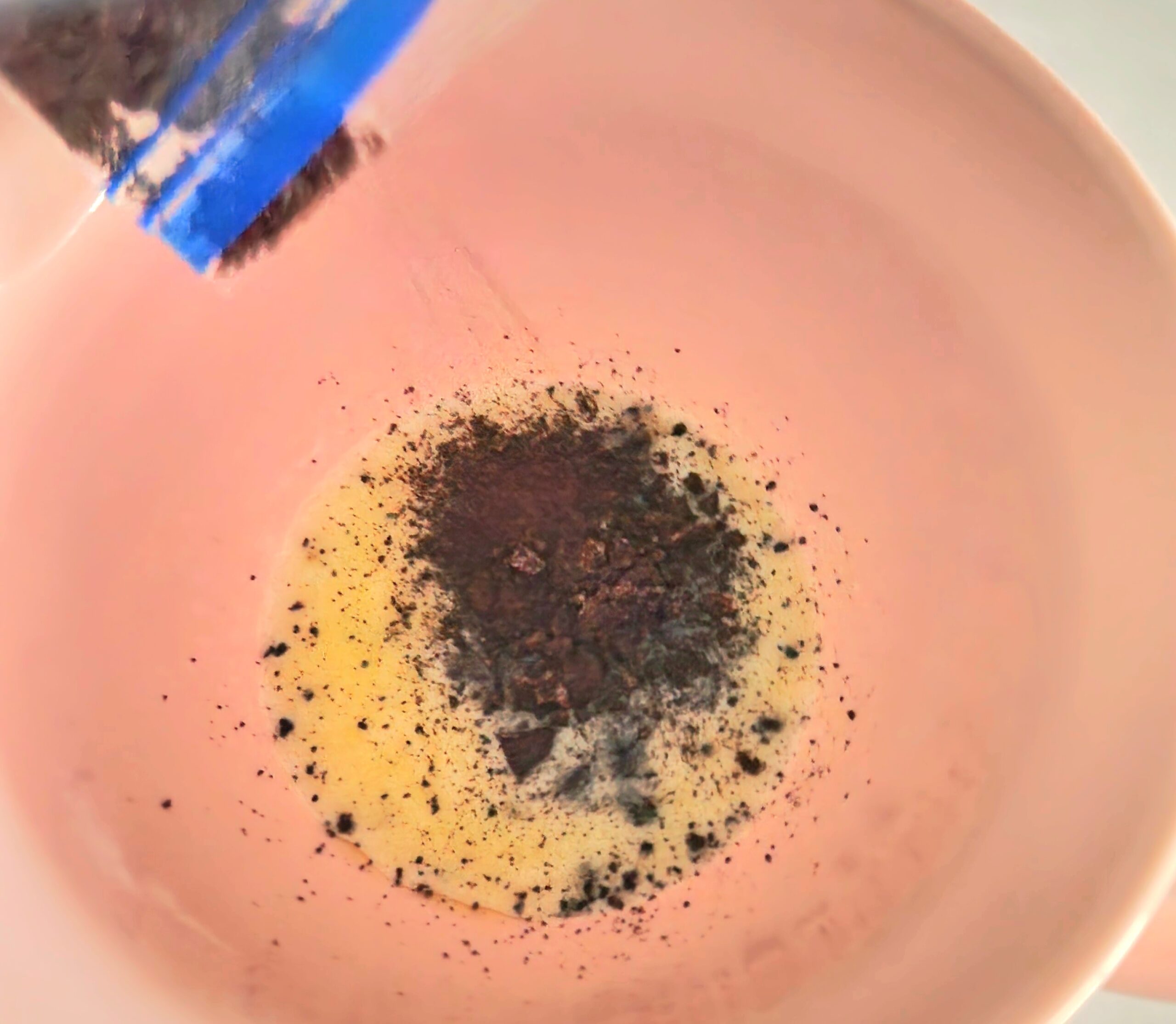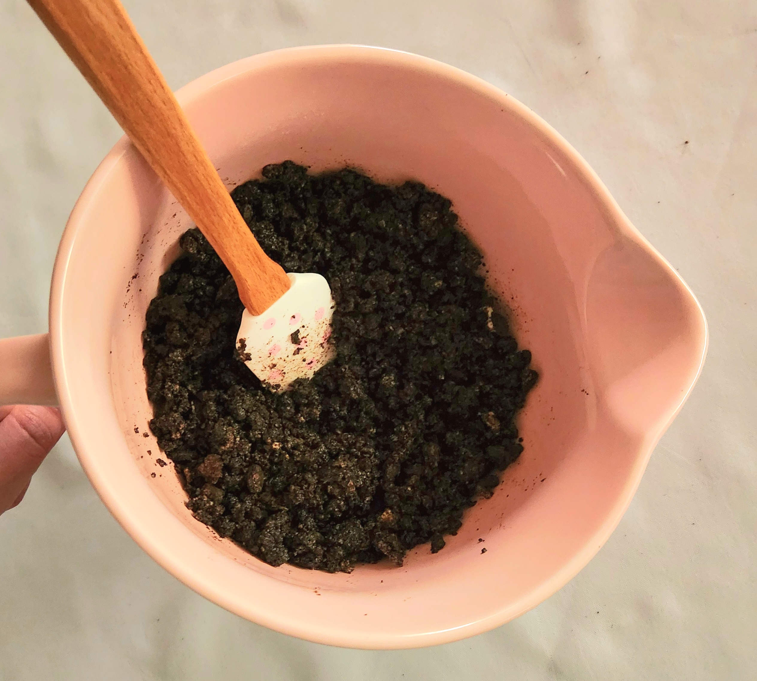 In a medium mixing bowl, melt the butter. I just use a microwave for this, but if that isn’t an option, you can of course melt the butter in a saucepan on the stove then transfer it over to the mixing bowl. Add the crushed oreos and salt to the melted butter and stir them together with a rubber spatula.