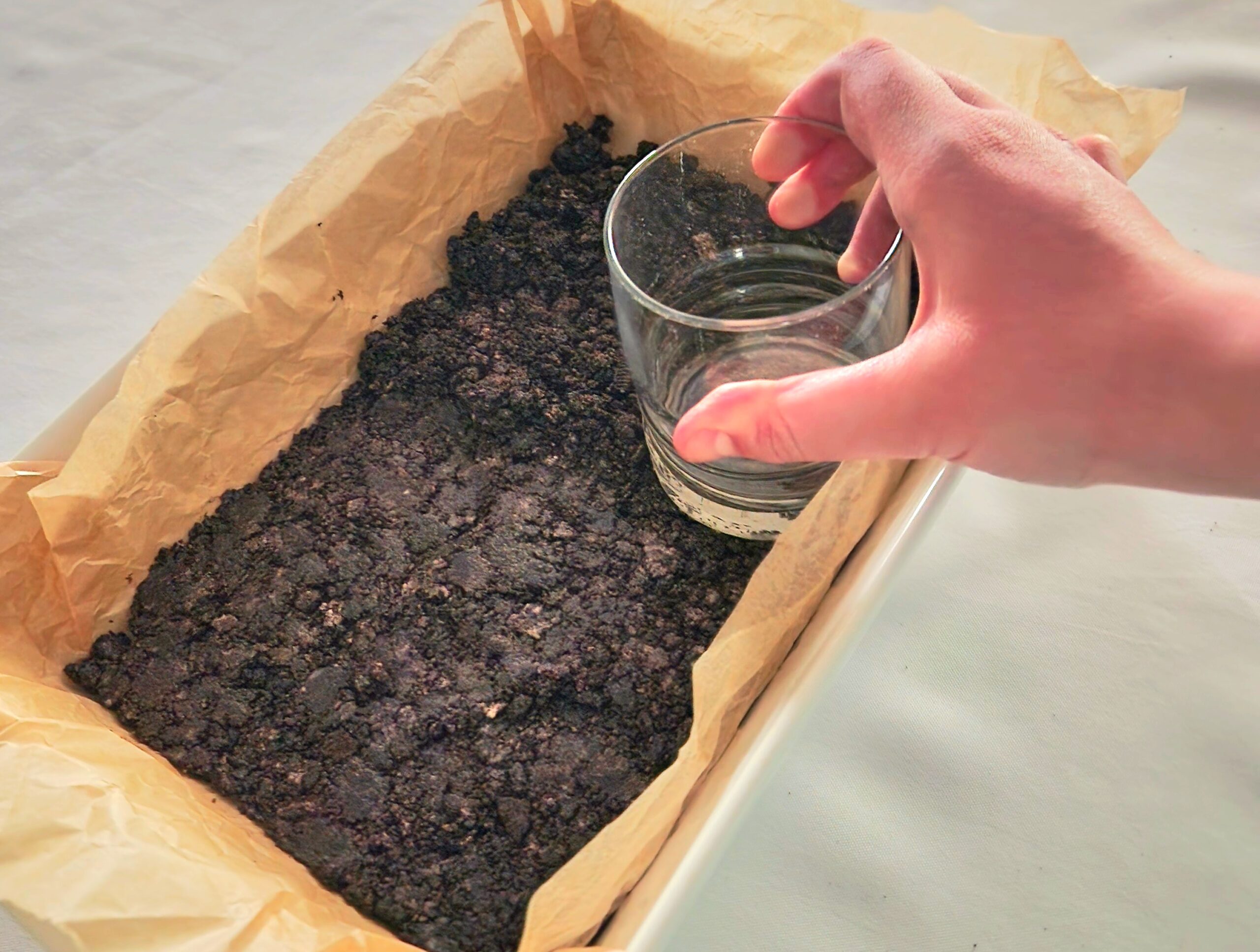 Pour the mixture into the prepared baking dish and, using flat-bottomed glass, press the mixture firmly to the bottom of the pan. Just like when you’re making a cheesecake, you want the crust to be hard-packed in there.
