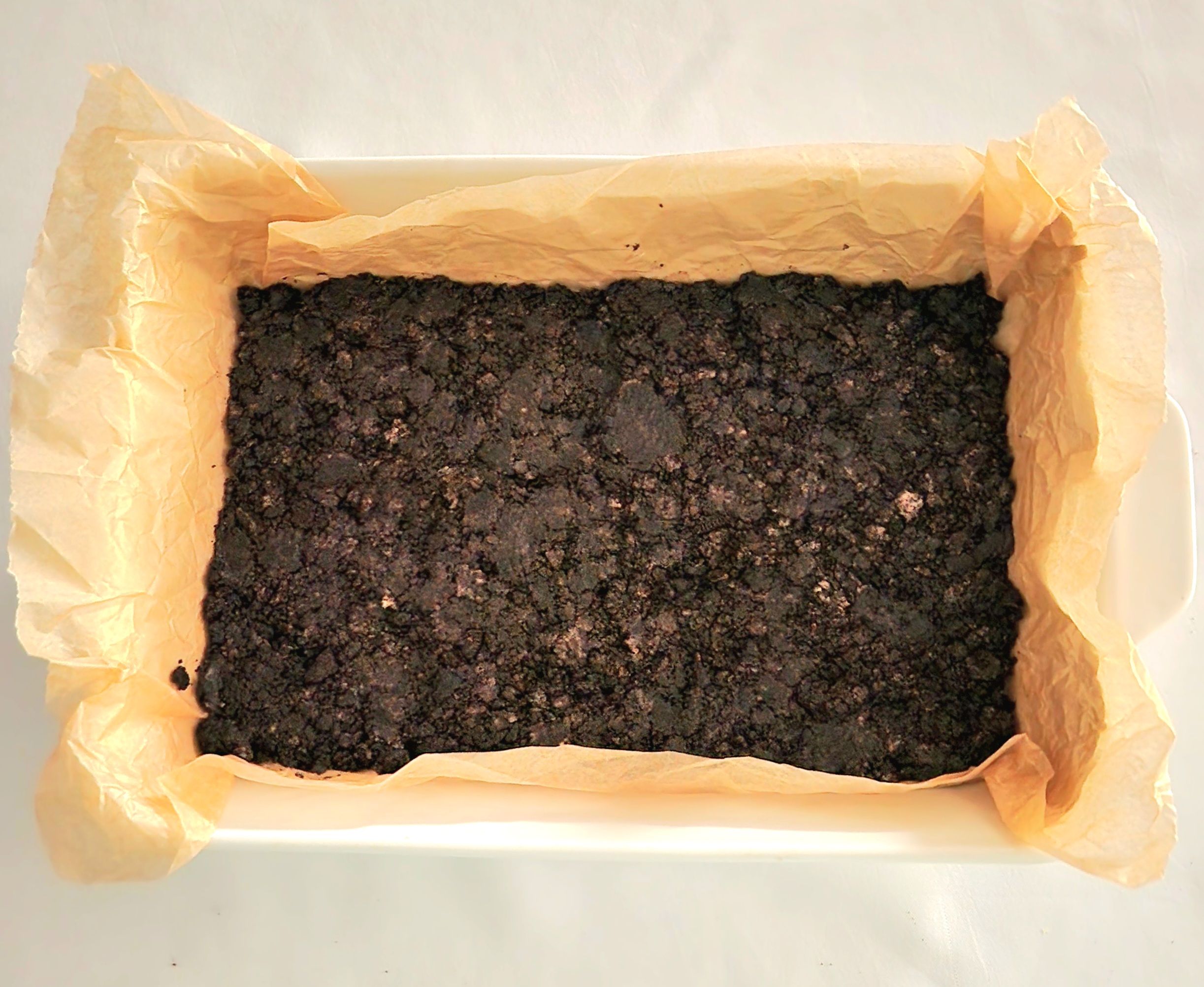 - In a medium mixing bowl, melt the butter. Add the crushed oreos and salt to the melted butter and stir them together with a rubber spatula. Pour the mixture into the prepared baking dish and, using flat-bottomed glass, press the mixture firmly to the bottom of the pan.