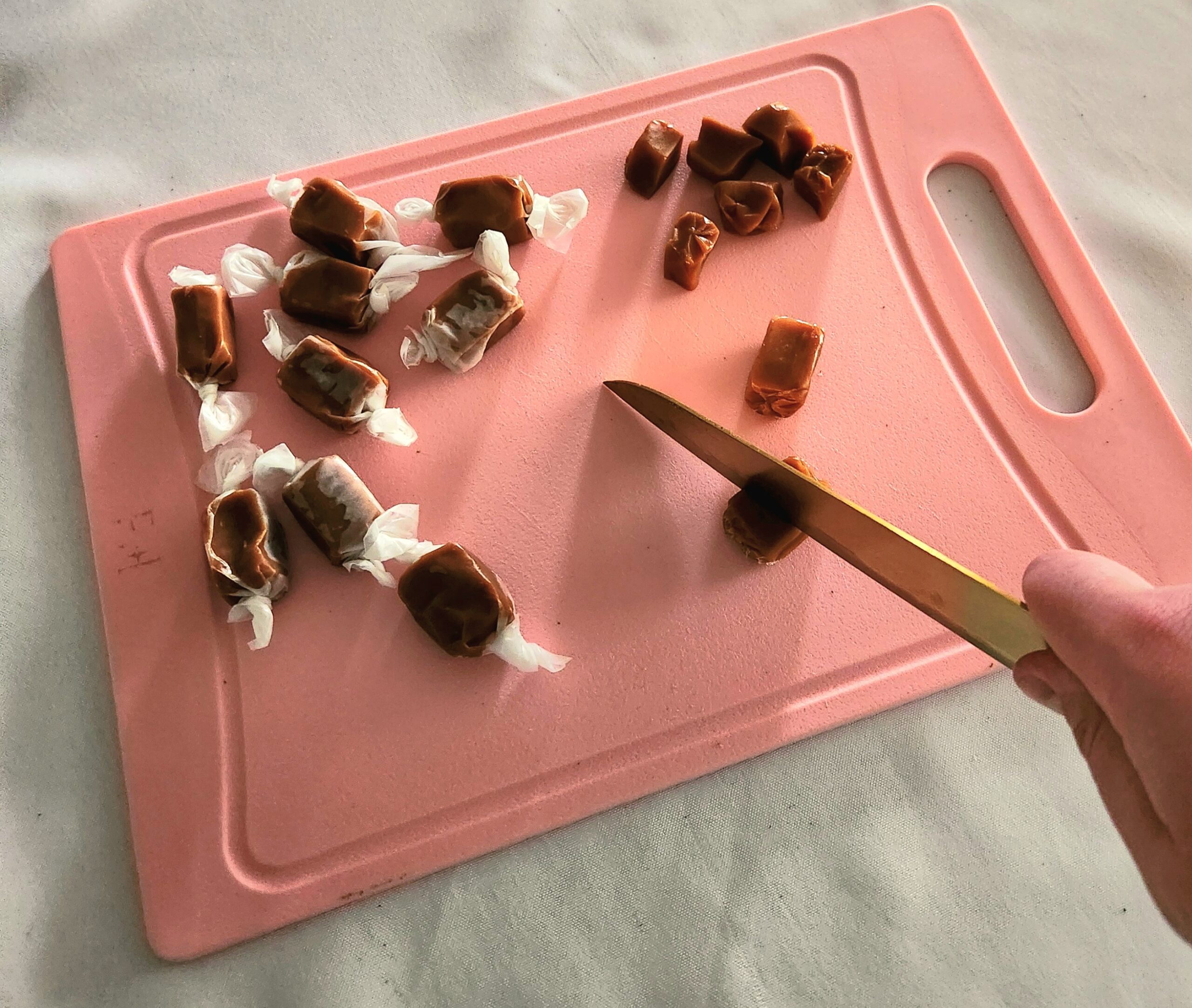 - Using a sharp knife, cut each soft caramel in half. Set them aside for later.