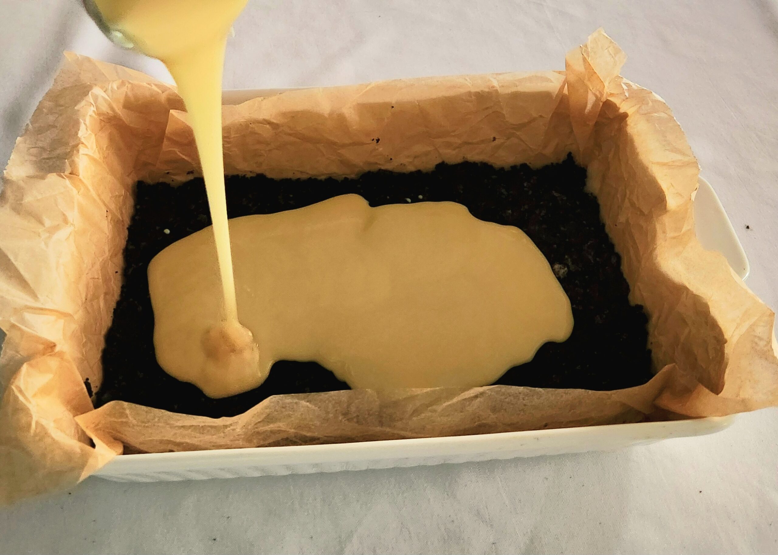 - Pour the sweetened condensed milk over the oreo crust, taking care to spread it out evenly. Top that layer with the chocolate chips, then the caramel pieces, then the coconut, and finally the pecans.