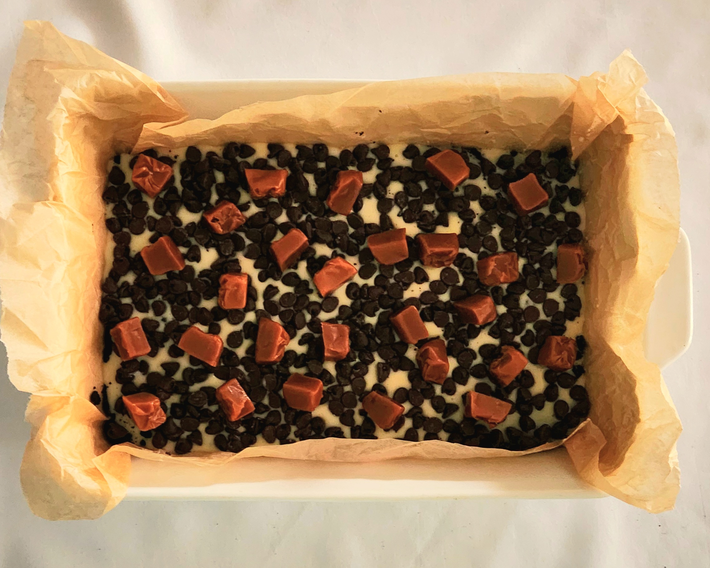 Top that layer with the chocolate chips, then the caramel pieces, then the coconut, and finally the pecans. Can you switch the order of these particular layers? Sure, if you’d like. They’re all going to stick to the condensed milk, and that’s the most important thing. Just try to spread them out evenly and it’ll be fine.